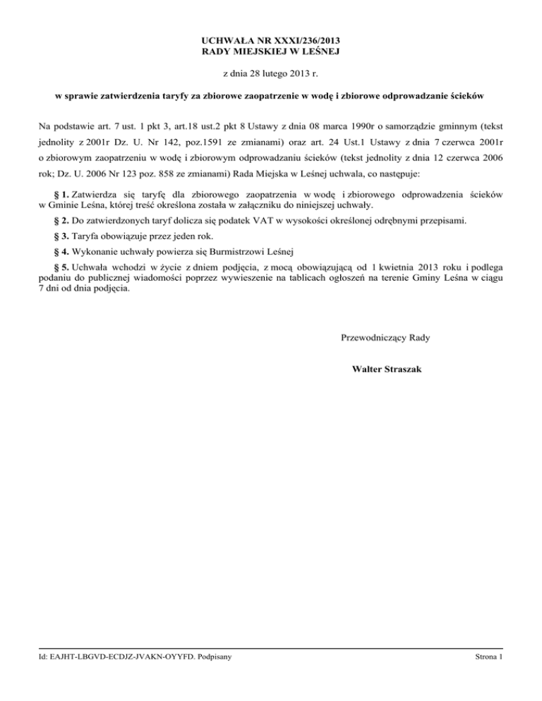 UCHWAŁA NR XXXI/236/2013 RADY MIEJSKIEJ W LEŚNEJ z dnia 28 lutego 2013 r. w sprawie zatwierdzenia taryfy za zbiorowe zaopatrzenie w wodę i zbiorowe odprowadzanie ścieków Na podstawie art. 7 ust. 1 pkt 3, art.18 ust.2 pkt 8 Ustawy z dnia 08 marca 1990r o samorządzie gminnym (tekst jednolity z 2001r Dz. U. Nr 142, poz.1591 ze zmianami) oraz art. 24 Ust.1 Ustawy z dnia 7 czerwca 2001r o zbiorowym zaopatrzeniu w wodę i zbiorowym odprowadzaniu ścieków (tekst jednolity z dnia 12 czerwca 2006 rok; Dz. U. 2006 Nr 123 poz. 858 ze zmianami) Rada Miejska w Leśnej uchwala, co następuje: § 1. Zatwierdza się taryfę dla zbiorowego zaopatrzenia w wodę i zbiorowego odprowadzenia ścieków w Gminie Leśna, której treść określona została w załączniku do niniejszej uchwały. § 2. Do zatwierdzonych taryf dolicza się podatek VAT w wysokości określonej odrębnymi przepisami. § 3. Taryfa obowiązuje przez jeden rok. § 4. Wykonanie uchwały powierza się Burmistrzowi Leśnej § 5. Uchwała wchodzi w życie z dniem podjęcia, z mocą obowiązującą od 1 kwietnia 2013 roku i podlega podaniu do publicznej wiadomości poprzez wywieszenie na tablicach ogłoszeń na terenie Gminy Leśna w ciągu 7 dni od dnia podjęcia. Przewodniczący Rady Walter Straszak Id: EAJHTLBGVDECDJZJVAKNOYYFD. Podpisany Strona 1 Uzasadnienie Na podstawie art. 24, ust. 2 i 4 ustawy z dnia 7.06.2001 r. o zbiorowym zaopatrzeniu w wodę i zbiorowym odprowadzaniu ścieków (Dz. U. 2006 Nr 123 poz.858 ze zmianami), zwanej dalej ustawą, Przedsiębiorstwo Miejskie SYNERGIA Sp. z o.o. w Leśnej dnia 21 stycznia 2013 r. złożyło wniosek o zatwierdzenie taryf dla zbiorowego zaopatrzenia w wodę i zbiorowego odprowadzania ścieków wraz ze szczegółową kalkulacją cen i stawek opłat. Wniosek dotyczy taryf obowiązujących od dnia 1.04.2013 r. do 31.03.2014 r. na terenie Gminy Leśna i złożony został w wymaganym terminie. W trakcie postępowania zatwierdzającego, w oparciu o przepisy art. 24 ust. 5 Ustawy, na podstawie dostarczonej dokumentacji Burmistrz ustalił, że Przedsiębiorstwo opracowało taryfy zgodnie z zasadami, o których mowa w art. 23 ustawy oraz przepisami Rozporządzenie Ministra Budownictwa z dnia 28 czerwca 2006 r. w sprawie określania taryf, wzoru wniosku o zatwierdzenie taryf oraz warunków rozliczeń za zbiorowe zaopatrzenie w wodę i zbiorowe odprowadzanie ścieków (Dz. U. Nr 127, poz. 886). W szczególności taryfy zawierają określone zgodnie z wyżej wymienionymi przepisami ceny i stawki opłat, a także warunki rozliczeń z uwzględnieniem wyposażenia nieruchomości w przyrządy i urządzenia pomiarowe oraz warunki stosowania cen i stawek opłat. Ceny i stawki opłat określone przez Przedsiębiorstwo w taryfach zostały skalkulowane na podstawie niezbędnych przychodów prowadzenia działalności zaplanowanych na rok obowiązywania taryfy wynikających z kosztów związanych ze świadczeniem usług zbiorowego zaopatrzenia w wodę i zbiorowego odprowadzania ścieków, zmian warunków ekonomicznych i wielkości usług oraz planowanych wydatków remontowych. Przy ustalaniu taryf przyjęto zasadę ustalenia ich na optymalnie niskim poziomie dla odbiorców usług i równocześnie bezpiecznym dla prawidłowej działalności Przedsiębiorstwa. Uwzględniając powyższe uwarunkowania zasadne jest podjęcie przedmiotowej uchwały. Załącznik do Uchwały Nr XXXI/236/2013 Rady Miejskiej w Leśnej z dnia 28 lutego 2013 r. Zalacznik1.doc Załącznik Id: EAJHTLBGVDECDJZJVAKNOYYFD. Podpisany Strona 1 Załącznik do Uchwały Nr XXXI/236/2013 Rady Miejskiej w Leśnej z dnia 28 lutego 2013r. TARYFA DLA ZBIOROWEGO ZAOPATRZENIA W WODĘ I ZBIOROWEGO ODPROWADZENIA ŚCIEKÓW 1 1.1 Lp. TARYFOWE GRUPY ODBIORCÓW USŁUG Ustala się następujące grupy taryfowe odbiorców usług zaopatrzenia w wodę i odprowadzenia ścieków Taryfowa Grupa Odbiorców Usług Opis Grupy ZAOPATRZENIE W WODĘ 1. 2. 3. Grupa 1 Odbiorcy wody przeznaczonej do spożycia lub na cele socjalno-bytowe. Właściciele i zarządcy oraz posiadający inny tytuł prawny do nieruchomości, rozliczani za ilość dostarczonej wody ustaloną w oparciu o wskazania wodomierza głównego lub w razie jego braku na podstawie norm przeciętnego zużycia wody. Grupa 2 Odbiorcy zakupujący wodę przeznaczoną na potrzeby produkcji lub świadczenia usług, np. sklepy, hotele, restauracje, myjnie samochodowe, budownictwo, hutnictwo, przemysł metalowy, usługi transportowe oraz na cele zasilania fontann, przeciwpożarowe i inne. Odbiorcy rozliczani za ilość wody ustaloną w oparciu o wskazania wodomierza głównego lub norm przeciętnego zużycia wody. Grupa 3 Odbiorcy wody przeznaczonej do spożycia lub na cele socjalno-bytowe w miejscowości Złotniki Lubańskie. Właściciele i zarządcy oraz posiadający inny tytuł prawny do nieruchomości, rozliczani za ilość dostarczonej wody ustaloną w oparciu o wskazania wodomierza głównego lub w razie jego braku na podstawie norm przeciętnego zużycia wody. Nie dotyczy podmiotów gospodarczych. ODPROWADZANIE ŚCIEKÓW 1. 2. Grupa 1 Właściciele i zarządcy oraz posiadający inny tytuł prawny do nieruchomości, którzy odbierają wodę przeznaczoną do spożycia lub na cele socjalno-bytowe. Odbiorcy rozliczani za ilość ścieków w oparciu o wskazania wodomierza głównego lub w razie jego braku na podstawie norm przeciętnego zużycia wody. Grupa 2 Odbiorcy rozliczani za ilość ścieków w oparciu o ilość zakupionej wody lub normy przeciętnego zużycia wody, np. sklepy, hotele, restauracje, myjnie samochodowe, budownictwo, hutnictwo, przemysł metalowy, usługi transportowe oraz na cele zasilania fontann, przeciwpożarowe i inne. 2 WYSOKOŚĆ CEN I STAWEK OPŁAT Ustala się cenę netto za dostarczoną wodę i odprowadzanie ścieków w następujących wysokościach: 2.1 Wysokość cen i stawek opłat za dostarczanie wody Wyszczególnienie Taryfa nowa Lp. Taryfowa grupa odbiorców usług 0 1 1 Grupa 1 