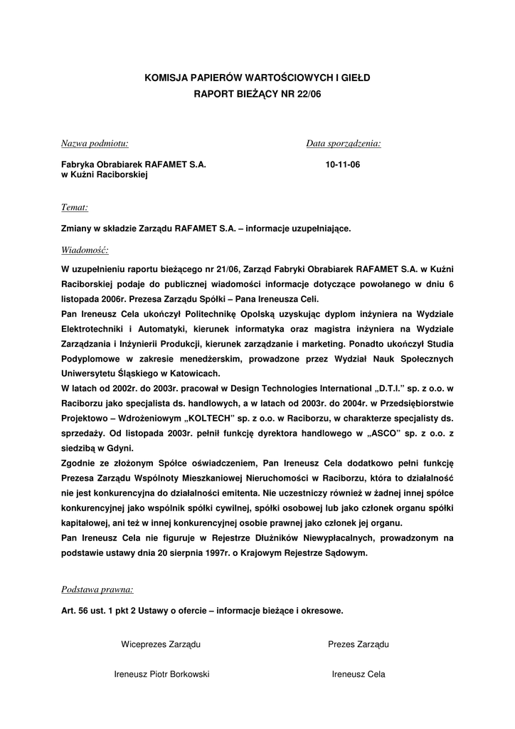 KOMISJA PAPIERÓW WARTO CIOWYCH I GIEŁD RAPORT BIE CY NR 22/06 Nazwa podmiotu: Data sporz dzenia: Fabryka Obrabiarek RAFAMET S.A. w Ku ni Raciborskiej 10-11-06 Temat: Zmiany w składzie Zarz du RAFAMET S.A. – informacje uzupełniaj ce. Wiadomo : W uzupełnieniu raportu bie cego nr 21/06, Zarz d Fabryki Obrabiarek RAFAMET S.A. w Ku ni Raciborskiej podaje do publicznej wiadomo ci informacje dotycz ce powołanego w dniu 6 listopada 2006r. Prezesa Zarz du Spółki – Pana Ireneusza Celi. Pan Ireneusz Cela uko czył Politechnik Opolsk uzyskuj c dyplom in yniera na Wydziale Elektrotechniki i Automatyki, kierunek informatyka oraz magistra in yniera na Wydziale Zarz dzania i In ynierii Produkcji, kierunek zarz dzanie i marketing. Ponadto uko czył Studia Podyplomowe w zakresie mened erskim, prowadzone przez Wydział Nauk Społecznych Uniwersytetu l skiego w Katowicach. W latach od 2002r. do 2003r. pracował w Design Technologies International „D.T.I.” sp. z o.o. w Raciborzu jako specjalista ds. handlowych, a w latach od 2003r. do 2004r. w Przedsi biorstwie Projektowo – Wdro eniowym „KOLTECH” sp. z o.o. w Raciborzu, w charakterze specjalisty ds. sprzeda y. Od listopada 2003r. pełnił funkcj dyrektora handlowego w „ASCO” sp. z o.o. z siedzib w Gdyni. Zgodnie ze zło onym Spółce o wiadczeniem, Pan Ireneusz Cela dodatkowo pełni funkcj Prezesa Zarz du Wspólnoty Mieszkaniowej Nieruchomo ci w Raciborzu, która to działalno nie jest konkurencyjna do działalno ci emitenta. Nie uczestniczy równie w adnej innej spółce konkurencyjnej jako wspólnik spółki cywilnej, spółki osobowej lub jako członek organu spółki kapitałowej, ani te w innej konkurencyjnej osobie prawnej jako członek jej organu. Pan Ireneusz Cela nie figuruje w Rejestrze Dłu ników Niewypłacalnych, prowadzonym na podstawie ustawy dnia 20 sierpnia 1997r. o Krajowym Rejestrze S dowym. Podstawa prawna: Art. 56 ust. 1 pkt 2 Ustawy o ofercie – informacje bie ce i okresowe. Wiceprezes Zarz du Prezes Zarz du Ireneusz Piotr Borkowski Ireneusz Cela
