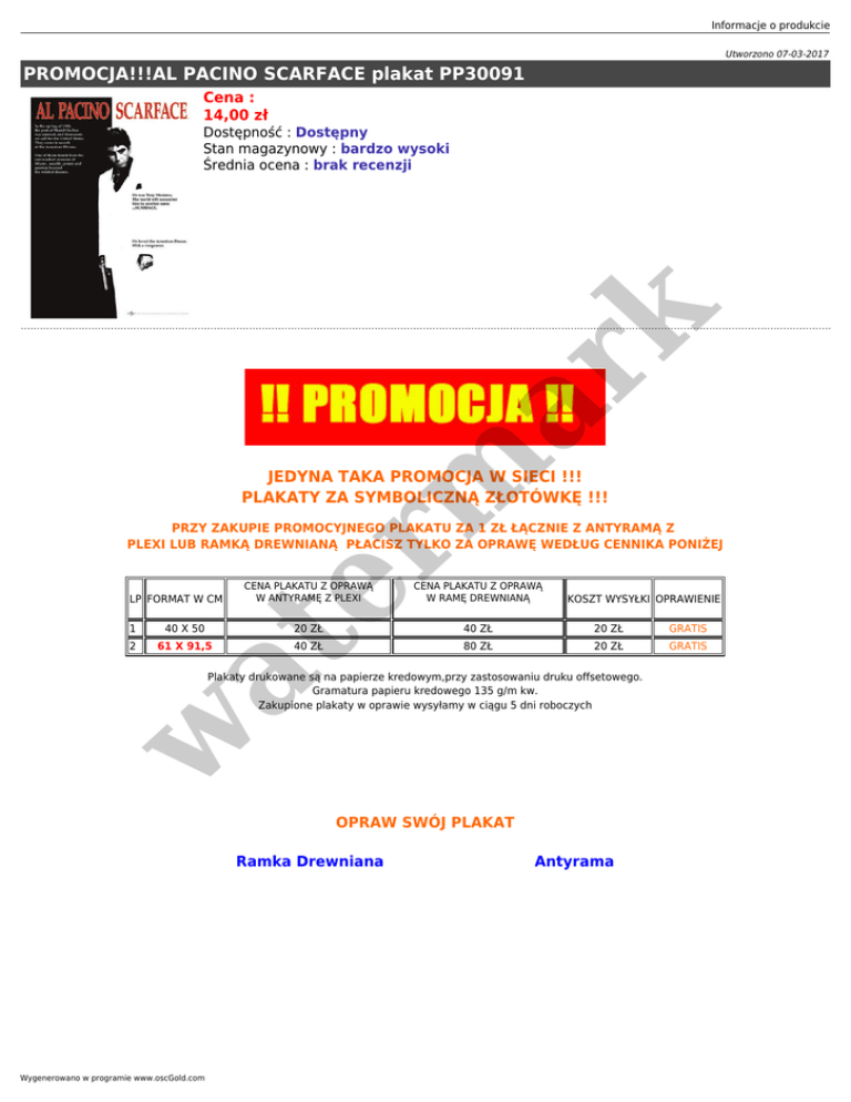 Informacje o produkcie Utworzono 07-03-2017 PROMOCJA!!!AL PACINO SCARFACE plakat PP30091 Cena : 14,00 zł er m ar k Dostępność : Dostępny Stan magazynowy : bardzo wysoki Średnia ocena : brak recenzji JEDYNA TAKA PROMOCJA W SIECI !!! PLAKATY ZA SYMBOLICZNĄ ZŁOTÓWKĘ !!! PRZY ZAKUPIE PROMOCYJNEGO PLAKATU ZA 1 ZŁ ŁĄCZNIE Z ANTYRAMĄ Z PLEXI LUB RAMKĄ DREWNIANĄ PŁACISZ TYLKO ZA OPRAWĘ WEDŁUG CENNIKA PONIŻEJ LP FORMAT W CM 2 40 X 50 CENA PLAKATU Z OPRAWĄ W RAMĘ DREWNIANĄ 20 ZŁ 40 ZŁ 20 ZŁ GRATIS 80 ZŁ 20 ZŁ GRATIS at 1 CENA PLAKATU Z OPRAWĄ W ANTYRAMĘ Z PLEXI 61 X 91,5 40 ZŁ KOSZT WYSYŁKI OPRAWIENIE w Plakaty drukowane są na papierze kredowym,przy zastosowaniu druku offsetowego. Gramatura papieru kredowego 135 g/m kw. Zakupione plakaty w oprawie wysyłamy w ciągu 5 dni roboczych OPRAW SWÓJ PLAKAT Ramka Drewniana Wygenerowano w programie www.oscGold.com Antyrama er m ar k at ZOBACZ RÓWNIEŻ RAMY DREWNIANE w ANTYRAMY TABLICE KORKOWE PLAKATY w at er m ar k Informacje o produkcie Wygenerowano w programie www.oscGold.com