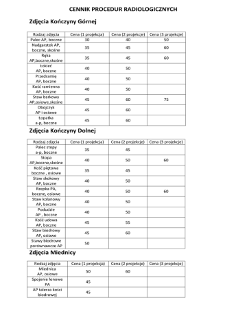 CENNIK PROCEDUR RADIOLOGICZNYCH Zdjęcia Kończyny Górnej Rodzaj zdjęcia Palec AP, boczne Nadgarstek AP, boczne, skośne Ręka AP,boczne,skośne Łokieć AP, boczne Przedramię AP, boczne Kość ramienna AP, boczne Staw barkowy AP,osiowe,skośne Obojczyk AP i osiowe Łopatka a-p, boczne Cena (1 projekcja) 30 Cena (2 projekcje) 40 Cena (3 projekcje) 50 35 45 60 35 45 60 40 50 40 50 40 50 45 60 45 60 45 60 75 Zdjęcia Kończyny Dolnej Rodzaj zdjęcia Palec stopy a-p, boczne Stopa AP,boczne,skośne Kość piętowa boczne , osiowe Staw skokowy AP, boczne Rzepka PA, boczne, osiowe Staw kolanowy AP, boczne Podudzie AP , boczne Kość udowa AP, boczne Staw biodrowy AP, osiowe Stawy biodrowe porównawcze AP Cena (1 projekcja) Cena (2 projekcje) 35 45 40 50 35 45 40 50 40 50 40 50 40 50 45 55 45 60 Cena (3 projekcje) 60 60 50 Zdjęcia Miednicy Rodzaj zdjęcia Miednica AP, osiowe Spojenie łonowe PA AP talerza kości biodrowej Cena (1 projekcja) Cena (2 projekcje) 50 60 45 45 Cena (3 projekcje) Zdjęcia Kręgosłupa Rodzaj zdjęcia odcinek szyjny AP, boczne, Odcinek szyjny skosy Odcinek piersiowy AP, boczne Odcinek lędźwiowy AP, boczne Odcinek lędźwiowy skosy Kość Krzyżowa (AP, boczne) Kość guziczna Zdjęcia czynnościowe kręgosłupa Stawy Krzyżowobiodrowe Cena (1 projekcja) Cena (2 projekcje) 50 60 Cena (3 projekcje) 60 50 65 50 65 65 50 65 50 65 65 50 65 Cena (1 projekcja) Cena (2 projekcje) 40 50 45 40 40 50 75 Zdjęcia czaszki Rodzaj zdjęcia Czaszka (AP i boczne) Zatoki PA Kość nosowa Oczodoły Zdjęcie żuchwy skośne Cena (3 projekcje) 45 Zdjęcia klatki piersiowej Rodzaj zdjęcia Klatka piersiowa PA i boczne Mostek boczne i skośne Staw mostkowoobojczykowy Zdjęcie żeber (AP, PA, skośne) Cena (1 projekcja) Cena (2 projekcje) 40 55 43 55 45 45 60 Cena (3 projekcje)