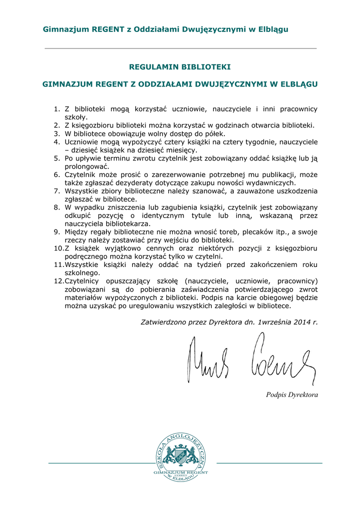 Gimnazjum REGENT z Oddziałami Dwujęzycznymi w Elblągu REGULAMIN BIBLIOTEKI GIMNAZJUM REGENT Z ODDZIAŁAMI DWUJĘZYCZNYMI W ELBLĄGU 1. Z biblioteki mogą korzystać uczniowie, nauczyciele i inni pracownicy szkoły. 2. Z księgozbioru biblioteki można korzystać w godzinach otwarcia biblioteki. 3. W bibliotece obowiązuje wolny dostęp do półek. 4. Uczniowie mogą wypożyczyć cztery książki na cztery tygodnie, nauczyciele – dziesięć książek na dziesięć miesięcy. 5. Po upływie terminu zwrotu czytelnik jest zobowiązany oddać książkę lub ją prolongować. 6. Czytelnik może prosić o zarezerwowanie potrzebnej mu publikacji, może także zgłaszać dezyderaty dotyczące zakupu nowości wydawniczych. 7. Wszystkie zbiory biblioteczne należy szanować, a zauważone uszkodzenia zgłaszać w bibliotece. 8. W wypadku zniszczenia lub zagubienia książki, czytelnik jest zobowiązany odkupić pozycję o identycznym tytule lub inną, wskazaną przez nauczyciela bibliotekarza. 9. Między regały biblioteczne nie można wnosić toreb, plecaków itp., a swoje rzeczy należy zostawiać przy wejściu do biblioteki. 10.Z książek wyjątkowo cennych oraz niektórych pozycji z księgozbioru podręcznego można korzystać tylko w czytelni. 11.Wszystkie książki należy oddać na tydzień przed zakończeniem roku szkolnego. 12.Czytelnicy opuszczający szkołę (nauczyciele, uczniowie, pracownicy) zobowiązani są do pobierania zaświadczenia potwierdzającego zwrot materiałów wypożyczonych z biblioteki. Podpis na karcie obiegowej będzie można uzyskać po uregulowaniu wszystkich zaległości w bibliotece. Zatwierdzono przez Dyrektora dn. 1września 2014 r. Podpis Dyrektora