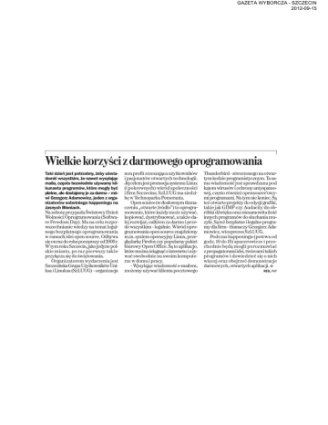 GAZETA WYBORCZA - SZCZECIN 2012-09-15 Wielkie korzyści z darmowego oprogramowania Taki dzień jest potrzebny, żeby uświa domić wszystkim, że nawet wysyłając maila, często bezwiednie używamy kil kunastu programów, które mogły być płatne, ale dostajemy je za darmo - mó wi Grzegorz Adamowicz, jeden z orga nizatorów sobotniego happeningu na Jasnych Błoniach. Na sobotę przypada Światowy Dzień Wolności Oprogramowania (Softwa re Freedom Day). Ma na celu rozpo wszechnianie wiedzy na temat legal nego bezpłatnego oprogramowania w ramach idei open source. Odbywa się on raz do roku począwszy od 2005 r. W tym roku Szczecin, jako jedyne pol skie miasto, po raz pierwszy także przyłącza się do świętowania. Organizatorem wydarzenia jest Szczecińska Grupa Użytkowników Uniksa i Linuksa (SzLUUG) - organizacja non profit zrzeszająca użytkowników i pasjonatów otwartych technologii. Jej celem jest promocja systemu Linux (i pokrewnych) wśród społeczności i firm Szczecina. SzLUUG ma siedzi bę w Technoparku Pomerania. Open source (wdosłownym tłuma czeniu „otwarte źródło") to oprogra mowanie, które każdy może używać, kopiować, dystrybuować, a także da lej rozwijać, całkiem za darmo i prze de wszystkim - legalnie. Wśród opro gramowania open source znajdziemy m.in. system operacyjny Linux, prze glądarkę Firefox czy popularny pakiet biurowy Open Office. Są to aplikacje, które można ściągnąć z internetu i uży wać swobodnie na swoim kompute rze w domu i pracy. - Wysyłając wiadomość e-mailem, możemy używać klienta pocztowego Thunderbird - stworzonego na otwar tym kodzie programistycznym. Ta sa ma wiadomość jest sprawdzana pod kątem wirusów i ochrony antyspamowej, często również opensource'owymi programami. Na tym nie koniec. Są też otwarte projekty do edycji grafiki, takiejak GIMP czy Audacity do ob róbki dźwięku oraz niesamowita ilość innych programów do słuchania mu zyki. Są też bezpłatne i legalne progra my dla firm - tłumaczy Grzegorz Ada mowicz, wiceprezes SzLUUG. Podczas happeningu (potrwa od godz. 10 do 15) spacerowicze i prze chodnie będą mogli porozmawiać z propagatorami idei, twórcami takich programów i dowiedzieć się o nich więcej oraz obejrzeć demonstracje darmowych, otwartych aplikacji, o RED, PAP