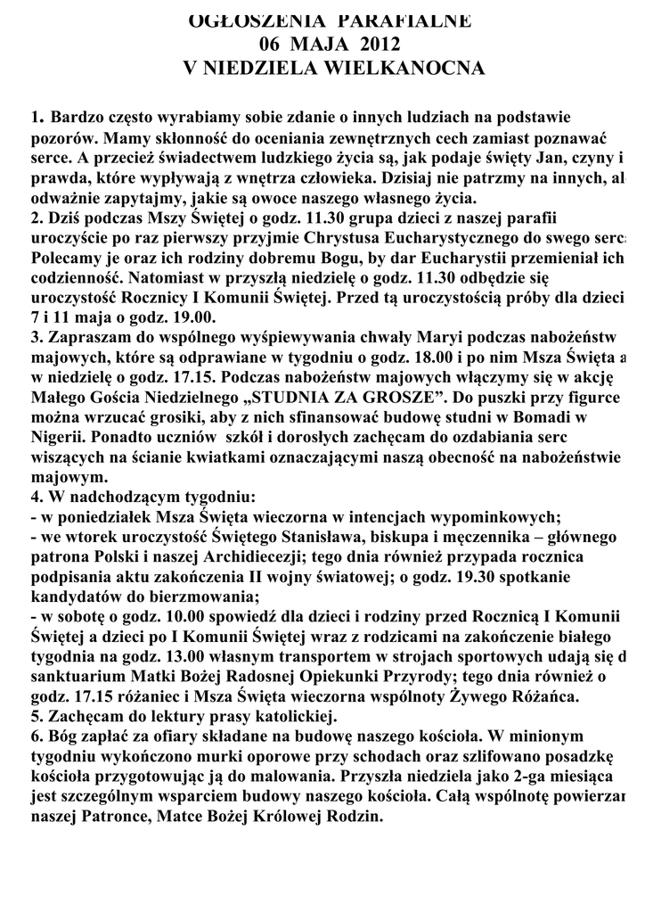 OGŁOSZENIA PARAFIALNE 06 MAJA 2012 V NIEDZIELA WIELKANOCNA 1. Bardzo często wyrabiamy sobie zdanie o innych ludziach na podstawie pozorów. Mamy skłonność do oceniania zewnętrznych cech zamiast poznawać serce. A przecież świadectwem ludzkiego życia są, jak podaje święty Jan, czyny i prawda, które wypływają z wnętrza człowieka. Dzisiaj nie patrzmy na innych, ale odważnie zapytajmy, jakie są owoce naszego własnego życia. 2. Dziś podczas Mszy Świętej o godz. 11.30 grupa dzieci z naszej parafii uroczyście po raz pierwszy przyjmie Chrystusa Eucharystycznego do swego serca. Polecamy je oraz ich rodziny dobremu Bogu, by dar Eucharystii przemieniał ich codzienność. Natomiast w przyszłą niedzielę o godz. 11.30 odbędzie się uroczystość Rocznicy I Komunii Świętej. Przed tą uroczystością próby dla dzieci 7 i 11 maja o godz. 19.00. 3. Zapraszam do wspólnego wyśpiewywania chwały Maryi podczas nabożeństw majowych, które są odprawiane w tygodniu o godz. 18.00 i po nim Msza Święta a w niedzielę o godz. 17.15. Podczas nabożeństw majowych włączymy się w akcję Małego Gościa Niedzielnego „STUDNIA ZA GROSZE”. Do puszki przy figurce można wrzucać grosiki, aby z nich sfinansować budowę studni w Bomadi w Nigerii. Ponadto uczniów szkół i dorosłych zachęcam do ozdabiania serc wiszących na ścianie kwiatkami oznaczającymi naszą obecność na nabożeństwie majowym. 4. W nadchodzącym tygodniu: - w poniedziałek Msza Święta wieczorna w intencjach wypominkowych; - we wtorek uroczystość Świętego Stanisława, biskupa i męczennika – głównego patrona Polski i naszej Archidiecezji; tego dnia również przypada rocznica podpisania aktu zakończenia II wojny światowej; o godz. 19.30 spotkanie kandydatów do bierzmowania; - w sobotę o godz. 10.00 spowiedź dla dzieci i rodziny przed Rocznicą I Komunii Świętej a dzieci po I Komunii Świętej wraz z rodzicami na zakończenie białego tygodnia na godz. 13.00 własnym transportem w strojach sportowych udają się do sanktuarium Matki Bożej Radosnej Opiekunki Przyrody; tego dnia również o godz. 17.15 różaniec i Msza Święta wieczorna wspólnoty Żywego Różańca. 5. Zachęcam do lektury prasy katolickiej. 6. Bóg zapłać za ofiary składane na budowę naszego kościoła. W minionym tygodniu wykończono murki oporowe przy schodach oraz szlifowano posadzkę kościoła przygotowując ją do malowania. Przyszła niedziela jako 2-ga miesiąca jest szczególnym wsparciem budowy naszego kościoła. Całą wspólnotę powierzam naszej Patronce, Matce Bożej Królowej Rodzin.