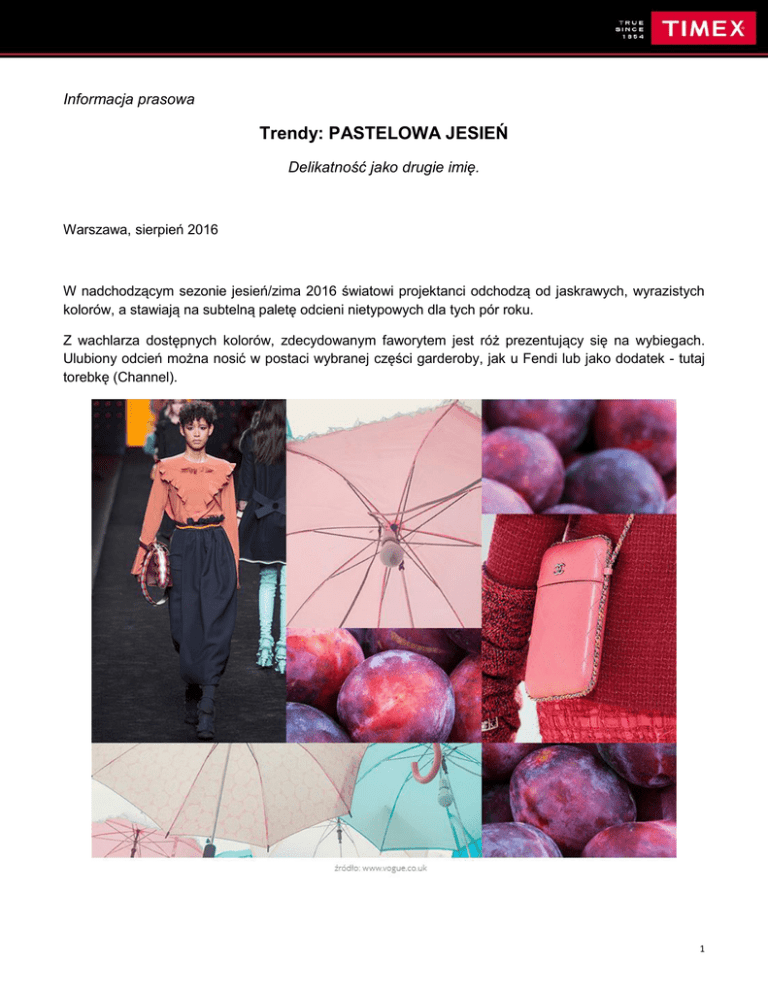 Informacja prasowa Trendy: PASTELOWA JESIEŃ Delikatność jako drugie imię. Warszawa, sierpień 2016 W nadchodzącym sezonie jesień/zima 2016 światowi projektanci odchodzą od jaskrawych, wyrazistych kolorów, a stawiają na subtelną paletę odcieni nietypowych dla tych pór roku. Z wachlarza dostępnych kolorów, zdecydowanym faworytem jest róż prezentujący się na wybiegach. Ulubiony odcień można nosić w postaci wybranej części garderoby, jak u Fendi lub jako dodatek - tutaj torebkę (Channel). 1 Innymi odcieniami nadającymi delikatności tej jesieni są jasne brązy, beże, błękity oraz delikatne zielenie. W swoich kolekcjach użyli ich m.in. Gucci i Trussardi. Pastelowe kolory można łączyć z granatem, czernią czy czerwienią. Dzięki temu odcienie będą kontrastowo uzupełniać stylizację i nadadzą jej wyrafinowania. Dodatkiem wpasowującym się w jesienne światowe trendy jest minimalistyczny Originals Tonal w pastelowych kolorach od producenta zegarków Timex. Wybierać można spośród pięciu delikatnych odcieni pasków: zieleni, szarości, błękitu pruskiego, bordo i białego. W zależności od pory dnia czy nastroju wytrzymałe, nylonowe paski łatwo wymienić dzięki zaczepom typu slip-through. Dostępne zegarki z kolekcji Originals Tonal są wyposażone w okrągłe koperty w modnych w tym sezonie kolorach złota i srebra. Projektanci zadbał także o eleganckie, minimalistyczne wykończenie zdobiąc tarczę jedynie indeksami godzin. Dodatkowymi atutami modeli są wodoszczelność 30WR oraz podświetlenie tarczy INDIGLO®. 2 Ceny zegarków (od lewej): TW2P88700 – 299PLN, TW2P88600, TW2P88500, TW2P78200 i TW2P88800 – 329PLN. Więcej inspiracji znajdziecie na stronie http://www.timex.pl/. Informacje o Timex Group: Timex Group jest jednym z największych w skali globalnej producentów oraz sprzedawców innowacyjnych zegarków i biżuterii. Założony w 1854 roku Timex jest częścią Timex Group – firmy, do której należy kilka marek, i która zatrudnia ponad 5 tysięcy osób na całym świecie. Polskie przedstawicielstwo Timex, z siedzibą w Warszawie działa od 1994 roku. Zegarki Timex dostępne są w sklepie internetowym www.timex.pl oraz w autoryzowanych sklepach na terenie całego kraju. Więcej informacji: Aleksandra Szafraniec, Omega Communication [email protected] 22 854 16 29, 692 059 401 ### 3