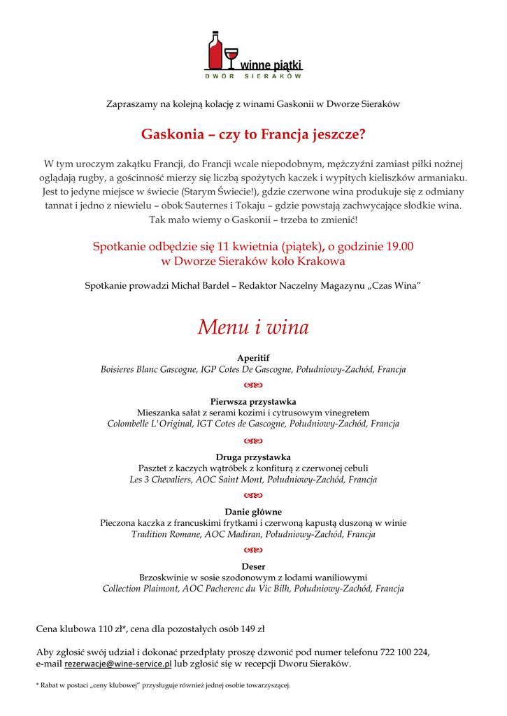 Zapraszamy na kolejną kolację z winami Gaskonii w Dworze Sieraków Gaskonia – czy to Francja jeszcze? W tym uroczym zakątku Francji, do Francji wcale niepodobnym, mężczyźni zamiast piłki nożnej oglądają rugby, a gościnność mierzy się liczbą spożytych kaczek i wypitych kieliszków armaniaku. Jest to jedyne miejsce w świecie (Starym Świecie!), gdzie czerwone wina produkuje się z odmiany tannat i jedno z niewielu – obok Sauternes i Tokaju – gdzie powstają zachwycające słodkie wina. Tak mało wiemy o Gaskonii – trzeba to zmienić! Spotkanie odbędzie się 11 kwietnia (piątek), o godzinie 19.00 w Dworze Sieraków koło Krakowa Spotkanie prowadzi Michał Bardel – Redaktor Naczelny Magazynu „Czas Wina” Menu i wina Aperitif Boisieres Blanc Gascogne, IGP Cotes De Gascogne, Południowy-Zachód, Francja Pierwsza przystawka Mieszanka sałat z serami kozimi i cytrusowym vinegretem Colombelle L'Original, IGT Cotes de Gascogne, Południowy-Zachód, Francja Druga przystawka Pasztet z kaczych wątróbek z konfiturą z czerwonej cebuli Les 3 Chevaliers, AOC Saint Mont, Południowy-Zachód, Francja Danie główne Pieczona kaczka z francuskimi frytkami i czerwoną kapustą duszoną w winie Tradition Romane, AOC Madiran, Południowy-Zachód, Francja Deser Brzoskwinie w sosie szodonowym z lodami waniliowymi Collection Plaimont, AOC Pacherenc du Vic Bilh, Południowy-Zachód, Francja Cena klubowa 110 zł*, cena dla pozostałych osób 149 zł Aby zgłosić swój udział i dokonać przedpłaty proszę dzwonić pod numer telefonu 722 100 224, e-mail [email protected] lub zgłosić się w recepcji Dworu Sieraków. * Rabat w postaci „ceny klubowej” przysługuje również jednej osobie towarzyszącej.
