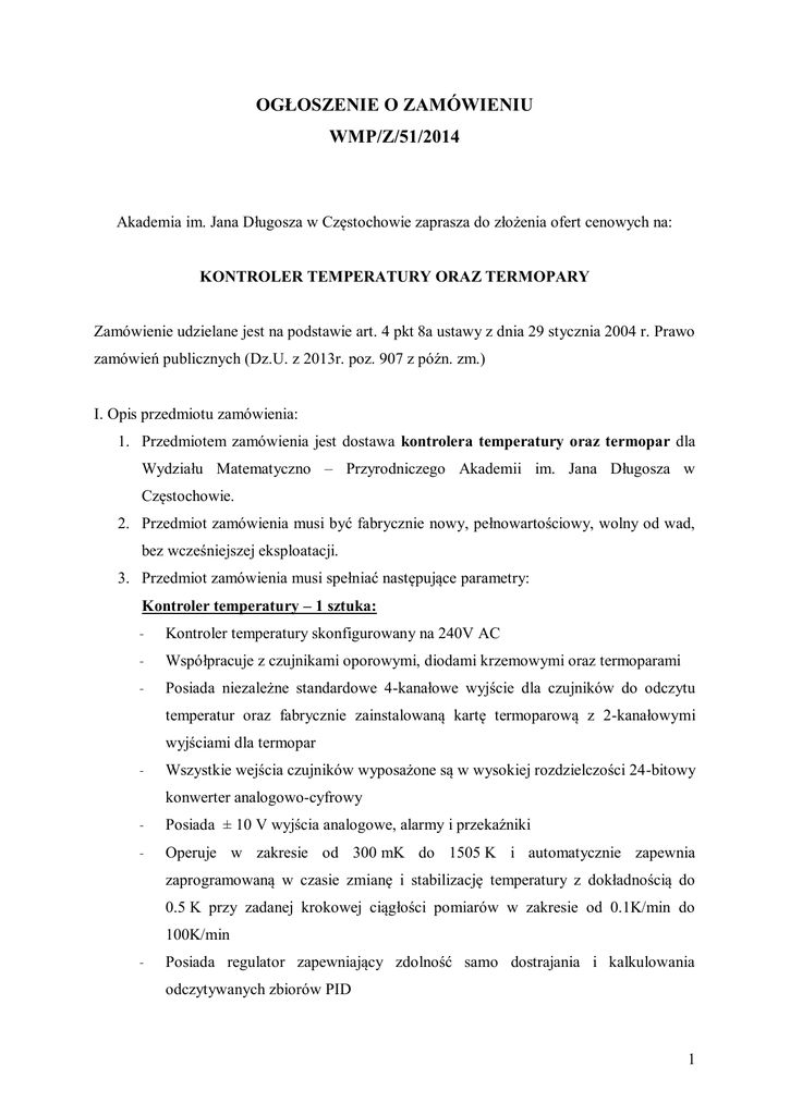 OGŁOSZENIE O ZAMÓWIENIU WMP/Z/51/2014 Akademia im. Jana Długosza w Częstochowie zaprasza do złożenia ofert cenowych na: KONTROLER TEMPERATURY ORAZ TERMOPARY Zamówienie udzielane jest na podstawie art. 4 pkt 8a ustawy z dnia 29 stycznia 2004 r. Prawo zamówień publicznych (Dz.U. z 2013r. poz. 907 z późn. zm.) I. Opis przedmiotu zamówienia: 1. Przedmiotem zamówienia jest dostawa kontrolera temperatury oraz termopar dla Wydziału Matematyczno – Przyrodniczego Akademii im. Jana Długosza w Częstochowie. 2. Przedmiot zamówienia musi być fabrycznie nowy, pełnowartościowy, wolny od wad, bez wcześniejszej eksploatacji. 3. Przedmiot zamówienia musi spełniać następujące parametry: Kontroler temperatury – 1 sztuka: Kontroler temperatury skonfigurowany na 240V AC Współpracuje z czujnikami oporowymi, diodami krzemowymi oraz termoparami Posiada niezależne standardowe 4-kanałowe wyjście dla czujników do odczytu temperatur oraz fabrycznie zainstalowaną kartę termoparową z 2-kanałowymi wyjściami dla termopar Wszystkie wejścia czujników wyposażone są w wysokiej rozdzielczości 24-bitowy konwerter analogowo-cyfrowy Posiada ± 10 V wyjścia analogowe, alarmy i przekaźniki Operuje w zakresie od 300 mK do 1505 K i automatycznie zapewnia zaprogramowaną w czasie zmianę i stabilizację temperatury z dokładnością do 0.5 K przy zadanej krokowej ciągłości pomiarów w zakresie od 0.1K/min do 100K/min Posiada regulator zapewniający zdolność samo dostrajania i kalkulowania odczytywanych zbiorów PID 1 Dysponuje podwójną pętlą czujnika grzałki z wyjściami o wartościach mocy 100 W i 50 W Posiada wyjścia ETHERNET, USB oraz IEEE-488 Port USB emuluje port szeregowy RS-232C Posiada oprogramowanie umożliwiające sterowanie z poziomu komputera PC pracującego pod systemem MS Windows XP/7 Posiada certyfikat CE oraz spełnia wymagania Komisji Europejskiej dotyczące warunków bezpieczeństwa i ochrony środowiska oraz procedur utylizacji Homologacja CE Posiada 3-letnią gwarancję producenta Termopara typu K– 1 sztuka: zakres temperatur od 3,15 K do 1543 K czułość 4,1 mV/K w temp. 20 K średnica drutu 0,127 mm (bez otuliny), długość 3 m Termopara typu K– 1 sztuka: zakres temperatur od 3,15 K do 1543 K czułość 4,1 mV/K w temp. 20 K średnica drutu 0,254 mm (bez otuliny), długość 3 m Gwarancja na termopary nie mniej niż 12 miesięcy. 4. Przedmiot zamówienia obejmuje dostarczenie do Zamawiającego zamawianego sprzętu, na koszt i ryzyko Wykonawcy. Miejsce dostawy: Instytut Fizyki, Zakład Luminescencji i Biofotoniki, Al. Armii Krajowej 13/15, 42-200 Częstochowa. 5. Termin realizacji: w ciągu do 4 tygodni licząc od dnia otrzymania zamówienia. II. Składanie ofert Oferty cenowe należy składać za pośrednictwem poczty elektronicznej na adres: [email protected] (Magdalena Biernacka) Termin składania ofert upływa dnia 11.12.2014 roku o godz. 12:00 2 III. Kryteria wyboru 1. Dokonując wyboru oferty Zamawiający będzie kierował się kryterium najniżej ceny brutto z wagą 100%. Zamawiający wybierze ofertę najkorzystniejszą, za którą zostanie uznana oferta z najniższą ceną (brutto) realizacji całości zamówienia spośród ofert spełniających wymagania określone przez Zamawiającego. 2. W przypadku, gdy niemożliwy będzie wybór oferty najkorzystniejszej, z uwagi na to, iż zostały złożone oferty o takiej samej cenie, Zamawiający wezwie Wykonawców, którzy złożyli te oferty do złożenia ofert dodatkowych. Wykonawcy składając oferty dodatkowe nie mogą zaoferować cen wyższych niż w złożonych ofertach. IV. Osoby do kontaktu 1. Wykonawca może kontaktować się z Zamawiającym: Instytut Fizyki Magdalena Biernacka Al. Armii Krajowej 13/15 24-200 Częstochowa [email protected] Tel. 605-632-558 2. Wszelkie zmiany oraz wyjaśnienia dotyczące niniejszego zamówienia, mogące mieć wpływ na złożenie oferty o udzieleniu zamówienia będą publikowane na stronie Biuletynu Informacji Publicznej Akademii im. Jana Długosza w Częstochowie. 3