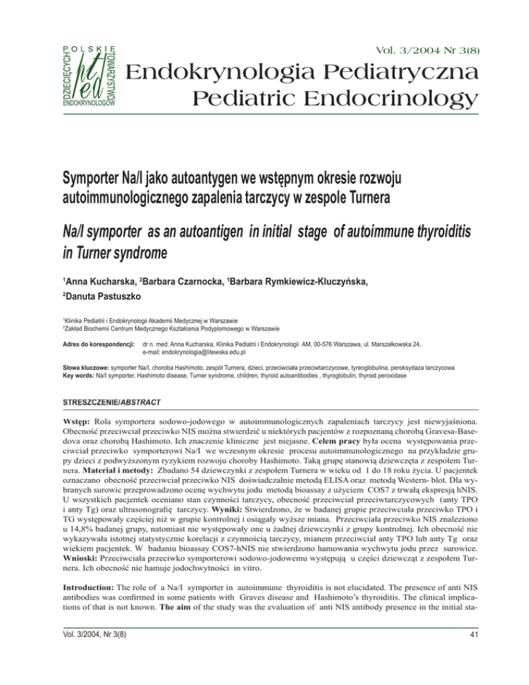 Vol. 3/2004 Nr 3(8) Endokrynologia Pediatryczna Pediatric Endocrinology Symporter Na/I jako autoantygen we wstępnym okresie rozwoju autoimmunologicznego zapalenia tarczycy w zespole Turnera Na/I symporter as an autoantigen in initial stage of autoimmune thyroiditis in Turner syndrome Anna Kucharska, 2Barbara Czarnocka, 1Barbara Rymkiewicz-Kluczyńska, 2 Danuta Pastuszko 1 1 2 Klinika Pediatrii i Endokrynologii Akademii Medycznej w Warszawie Zakład Biochemii Centrum Medycznego Kształcenia Podyplomowego w Warszawie Adres do korespondencji: dr n. med. Anna Kucharska, Klinika Pediatrii i Endokrynologii AM, 00-576 Warszawa, ul. Marszałkowska 24, e-mail: [email protected] Słowa kluczowe: symporter Na/I, choroba Hashimoto, zespół Turnera, dzieci, przeciwciała przeciwtarczycowe, tyreoglobulina, peroksydaza tarczycowa Key words: Na/I symporter, Hashimoto disease, Turner syndrome, children, thyroid autoantibodies , thyroglobulin, thyroid peroxidase STRESZCZENIE/ STRESZCZENIE/ABSTRACT Wstęp: Rola symportera sodowo-jodowego w autoimmunologicznych zapaleniach tarczycy jest niewyjaśniona. Obecność przeciwciał przeciwko NIS można stwierdzić u niektórych pacjentów z rozpoznaną chorobą Gravesa-Basedova oraz chorobą Hashimoto. Ich znaczenie kliniczne jest niejasne. Celem pracy była ocena występowania przeciwciał przeciwko symporterowi Na/I we wczesnym okresie procesu autoimmunologicznego na przykładzie grupy dzieci z podwyższonym ryzykiem rozwoju choroby Hashimoto. Taką grupę stanowią dziewczęta z zespołem Turnera. Materiał i metody: Zbadano 54 dziewczynki z zespołem Turnera w wieku od 1 do 18 roku życia. U pacjentek oznaczano obecność przeciwciał przeciwko NIS doświadczalnie metodą ELISA oraz metodą Western- blot. Dla wybranych surowic przeprowadzono ocenę wychwytu jodu metodą bioassay z użyciem COS7 z trwałą ekspresją hNIS. U wszystkich pacjentek oceniano stan czynności tarczycy, obecność przeciwciał przeciwtarczycowych (anty TPO i anty Tg) oraz ultrasonografię tarczycy. Wyniki: Stwierdzono, że w badanej grupie przeciwciała przeciwko TPO i TG występowały częściej niż w grupie kontrolnej i osiągały wyższe miana. Przeciwciała przeciwko NIS znaleziono u 14,8% badanej grupy, natomiast nie występowały one u żadnej dziewczynki z grupy kontrolnej. Ich obecność nie wykazywała istotnej statystycznie korelacji z czynnością tarczycy, mianem przeciwciał anty TPO lub anty Tg oraz wiekiem pacjentek. W badaniu bioassay COS7-hNIS nie stwierdzono hamowania wychwytu jodu przez surowice. Wnioski: Przeciwciała przeciwko symporterowi sodowo-jodowemu występują u części dziewcząt z zespołem Turnera. Ich obecność nie hamuje jodochwytności in vitro. Introduction: The role of a Na/I symporter in autoimmune thyroiditis is not elucidated. The presence of anti NIS antibodies was confirmed in some patients with Graves disease and Hashimoto’s thyroiditis. The clinical implications of that is not known. The aim of the study was the evaluation of anti NIS antibody presence in the initial staVol. 3/2004, Nr 3(8) 41 Praca oryginalna Endokrynol. Ped., 3/2004;3(8):41-49 ge of autoimmune thyroiditis in model group of children with a high risk for Hashimoto’s disease development: girls with Turner syndrome. Material and methods: 54 girls with Turner syndrome were examined, at the age between 1 to 18 year of life. Anti NIS antibodies were evaluated by ELISA and Western-blot. In elected sera we examined the iodine uptake in bioassay using COS7 with stable expression of hNIS. In all patients thyroid hormones, antithyroid antibodies (anti TPO, anti Tg) and thyroid ultrasonography were evaluated. Results: Autoantibodies against TPO and Tg were more often and reached higher titres in patients than in controls. Anti NIS antibodies were present in 14.8% girls with Turner syndrome, and in none of the control group. Their presence did not correlate with thyroid function, TPO or Tg autoantibodies titres and patients age. NIS antibody-positive sera did not suppress iodine uptake in bioassay COS7-hNIS. Conclusions: NIS antibodies are present in some young patients with Turner syndrome. They does not suppress the iodine uptake in vitro. Wstęp Stan autotolerancji jest utrzymywany dzięki złożonym mechanizmom. Działają one na różnych etapach rozwoju limfocytów i nie dopuszczają do powstania odpowiedzi komórkowej i humoralnej na własne antygeny. Delecja klonalna zapewnia apoptozę limfocytów T zdolnych do rozpoznawania własnych cząsteczek MHC i antygenów prezentowanych w ich kontekście. Dzięki anergii klonalnej autoreaktywne limfocyty T, które uniknęły delecji, są w stanie „uśpienia” i nie mogą zapoczątkować reakcji immunologicznej. Kolejnym mechanizmem utrzymywania autotolerancji jest aktywna supresja poprzez limfocyty T CD8+ i przeciwciała antyidiotypowe jako ochrona przed nadmiernym rozwojem odpowiedzi immunologicznej. Istotne znaczenie ma również dostępność antygenu dla układu immunologicznego: tzw anatomiczna lub molekularna sekwestracja. Zaburzenie stanu autotolerancji może powstać na każdym z wymienionych etapów w wyniku działania czynników modyfikujących: genetycznych lub środowiskowych [1]. Nie wiadomo jaki czynnik lub zespół czynników inicjuje nieprawidłową odpowiedź układu immunologicznego. Do wywołania odpowiedzi immunologicznej jest konieczna prezentacja odpowiednio skonfigurowanego antygenu wobec receptora limfocytu T. Dotychczas poznane antygeny tarczycowe wywołujące reakcję immunologiczną, to: receptor dla TSH (TSH-R), tyreoglobulina (Tg), peroksydaza tarczycowa (TPO) oraz symporter sodowo-jodowy (NIS) i pendryna. Lokalizację komórkową tych antygenów pokazuje rycina 1. Ryc. 1. Schemat lokalizacji komórkowej głównych antygenów tarczycowych Fig. 1. Cellular localisation of thyroid antigens 42 Kucharska A. i inni – Symporter Na/I jako autoantygen we wstępnym okresie rozwoju... Przeciwciała przeci