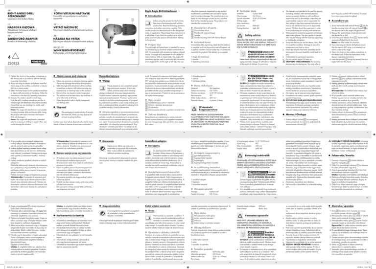 Right Angle Drill Attachment KOTNI VRTALNI NASTAVEK R IGHT ANGLE DRILL ATTACHMENT O peration and Safety Notes N avodila za upravljanje in varnostna opozorila NASADKA KĄTOWA VRTACÍ NÁSTAVEC Q Introduction 4 Wskazówki dotyczące obsługi i bezpieczeństwa P okyny pro obsluhu a bezpečnostní pokyny SAROKFÚRÓ ADAPTER N ÁSADA NA VRTÁK K ezelési és biztonsági utalások 1 Before using the product for the first time, take time to familiarise yourself with the product first. Read the following operation instructions and safety instructions carefully. Only use the product as described and for the designated areas of application. Please keep these instructions in a safe place. If you hand this product on to a third party, you must also pass on all documents relating to the product. P okyny pre obsluhu a bezpečnostné pokyny Q Proper WINKELBOHRVORSATZ B edienungs- und Sicherheitshinweise 4 3 Use The right angle drill attachment is intended for use as an attachment to a standard cordless screwdriver or drill. It is compatible with conventional keyless or keyed chucks. The angle drill attachment is not suitable for rotary hammer drills or impact drills. The angle drill attachment can be used to screw and drill into wood at an angle of 90°, to the right or left side. Any use 2 Z30825 Q Description 1 2 3 4 Quick-release chuck Handle with external thread Spindle Handle mounting hole with internal thread Q Included Q Maintenance and cleaning Nasadka kątowa Never use corrosive or abrasive cleaning agents. These may damage the surface of the product. Take the angle drill attachment off the cordless screwdriver or electric drill before carrying any maintenance or cleaning tasks on the product. Do not allow any liquids to enter the product. The product must be kept clean, dry and free of oil or lubricants at all times. Clean the product with a slightly dampened, non-fluffing cloth. Q Disposal The packaging is made entirely of recyclable materials, which you may dispose of at local recycling facilities. Contact your local refuse disposal authority for more details of how to dispose of your worn-out product. GB GB 8.W przypadku użycia wiertarki elektrycznej: Należy włożyć wtyczkę wkrętarki akumulatorowej lub wiertarki elektrycznej do gniazdka. ����������������������������������������������� 9.Należy wybrać najniższy moment obrotu wkrętarki akumulatorowej lub wiertarki elektrycznej oraz załączyć urządzenie. Należy tutaj postępować zgodnie z poleceniami każdej z instrukcji obsługi. 10.Należy zwiększać prędkość obrotów w małych odstępach. Wiertarkę elektryczną / wkrętarkę akumulatorową oraz połączoną z nią przystawkę do wiercenia pod kątem należy mocno trzymać na poszczególnych uchwytach. Należy zwracać uwagę na bezpieczną pozycję. Wskazówka: Przystawka do wiercenia pod kątem nie nadaje się do młotów udarowo-obrotowych oraz wiertarek udarowych. Podczas zastosowania z młotami udarowo-obrotowymi oraz wiertarkami udarowymi dojdzie do uszkodzenia produktu. Wskazówka: Przystawka do wiercenia pod kątem nadaje się jedynie do wkręcania lub wiercenia w drewnie. Wszelkie inne zastosowanie prowadzi do uszkodzenia produktu. PL PL 6.Dugja a forgótengelyt 3 a kívánt irányítással (jobb / bal) a fúrótokmányba. ������������������������������������������������� 7.Húzza az akkus csavarozó vagy a fúrógép fúrótokmányát a mindenkori használati útmutató utasításainak megfelelően újra szorosra. 8.Elektromos fúrógép használata esetén: Dugja az akkus csavarozó vagy a fúrógép hálózati csatlakozó dugóját a csatlakozó dugaljzatba. 9.Állítsa be az akkus csavarozón vagy a fúrógépen a legkisebb forgató nyomatékot és kapcsolja be a készüléket. Ebből a célból kövesse a mindenkori használati útmutató utasításait. 10.Növelje meg kis lépésekben a forgási sebességet. Tartsa a fúrógépet / akkus csavarozógépet és a hozzá csatlakoztatott szögletfúró feltétet a fogantyúiknál fogva. Ügyeljen a biztos állásra. Utalás: A szögletfúró feltét nem alkalmas fúrókalapácsokhoz és ütvefúró gépekhez. Fúrókalapácsokkal és ütvefúró gépekkel való használat esetén a termák megkárosodik. Utalás: A szögletfúró feltét csak fákba történő csavarozásokra vagy fúrásokra alkalmas. Másfajta használatok esetén a terméket károsodás éri. HU HU 78474_PL_CZ_SK_.indd 1 Q Konserwacja Proszę zapoznać się z produktem przed jego pierwszym użyciem. W tym celu należy uważnie przeczytać instrukcję obsługi i wskazówki dotyczące bezpieczeństwa. Produkt używać wyłącznie zgodnie z jego poniżej opisanym przeznaczeniem. Prosimy o zachowanie instrukcji io jej dobre przechowywanie. W przypadku przekazania produktu w ręce osoby trzeciej, prosimy o przekazanie także wszystkich należących do produktu instrukcji i innych dokumentów. Q Użycie és tisztítás J A tisztításhoz semmiképpen se használjon maró vagy súroló hatású tisztítószereket. Ellenkező esetben a termék felületét károsodás érheti. J Mindenfajta karbantartási és tisztítási munkák előtt válassza le a szögletfúró feltétet az akkus csavarozóról vagy a fúrógépről. J Folyadékoknak nem szabad a termék belsejébe bejutni. J A terméknek mindig tisztának, száraznak és olaj- vagy kenőzsírmentesnek kell lennie. j A tisztításhoz használjon egy enyhén megnedvesített és szöszmentes kendőt. zgodne z przeznaczeniem Przystawka do wiercenia pod kątem przewidziana jest jako nasadka do standardowych wkrętarek akumulatorowych oraz wiertarek elektrycznych. Nadaje ona się do konwencjonalnych kluczowych uchwytów wiertarskich lub uchwytów samozaciskowych. Przystawka do wiercenia pod kątem nie nadaje si