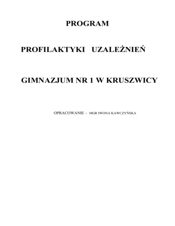 PROGRAM PROFILAKTYKI UZALEŻNIEŃ GIMNAZJUM NR 1 W KRUSZWICY OPRACOWANIE – MGR IWONA KAWCZYŃSKA Czym jest profilaktyka uzależnień? Spośród wielu działań profilaktycznych, profilaktyka używania substancji psychoaktywnych ma dość długą tradycję i bogaty zasób doświadczeń. Wiele jest badań, prowadzonych nad czynnikami ryzyka i chroniącymi przed odurzaniem się, czy strategiami, stosowanymi w programach profilaktycznych. Profilaktyka ogólnie rozumiana jest jako: „działanie i środki stosowane w celu zapobiegania chorobom; ogólnie: stosowanie różnych środków zapobiegawczych w celu niedopuszczenia do wypadków, uszkodzeń, katastrof itp.” (Mały Słownik Języka Polskiego, Wydawnictwo Naukowe PWN, Warszawa 1997). Można więc przyjąć, że profilaktyka to odpowiednie działanie, które ma na celu zapobieganie pojawianiu się i/lub rozwojowi niekorzystnego zjawiska, w konkretnej społeczności. Jest też jednym ze sposobów reagowania na rozmaite zjawiska społeczne, które oceniane są jako szkodliwe i niepożądane. Ocena skłania do traktowania takich zjawisk w kategoriach zagrożeń i podejmowania wysiłków w celu ich eliminacji lub choćby ograniczania. Powszechnie uważa się, że skuteczna profilaktyka jest optymalnym sposobem hamowania rozwoju lub ograniczania skali zjawisk uznanych za dolegliwe społecznie. Głównie z tego względu jest znacznie bardziej opłacalna niż kosztowne działania zaradcze konieczne w sytuacji, gdy wzrasta skala niepożądanych zjawisk. Zgodnie z takim rozumieniem profilaktyka używania substancji psychoaktywnych to zmniejszanie ryzyka ich używania oraz związanych z tym problemów, poprzez opóźnienie lub przeciwdziałanie inicjacji, niedopuszczanie do poszerzania się kręgu osób - szczególnie ludzi młodych, eksperymentujących z legalnymi i nielegalnymi substancjami. Pojawiła się także definicja, która profilaktykę uzależnień przedstawia również jako zmniejszanie strat związanych z używaniem środków odurzających poprzez ograniczanie do minimum potencjalnych szkód, jakich mogą doznawać szczególnie osoby młode, używające substancje psychoaktywne. W tym najszerszym ujęciu profilaktyka pojmowana jest jako postępowanie zapobiegające różnorodnym problemom, które towarzyszą używaniu tych substancji. Dzieci i młodzież w różnym stopniu narażeni są na ryzyko użycia legalnych lub nielegalnych środków uzależniających i wynikające z tego szkody. Odpowiednio do stopnia ryzyka profilaktyka prowadzona jest na kilku poziomach. Tradycyjnie w literaturze są one przedstawiane następująco: (Z. B. Gaś, 1993, 2003; J. Szymańska, 2002; B. Kałdon, 2003). • Profilaktyka pierwszorzędowa adresowana jest do grupy niskiego ryzyka. Są to działania kierowane do ludzi zdrowych, wspomagające prawidłowe procesy rozwoju fizycznego i psychicznego. Ma na celu promocję zdrowego stylu życia oraz opóźnienie wieku inicjacji, a przez to zmniejszenie zasięgu zachowań ryzykownych. Ważne jest więc rozwijanie różnych umiejętności życiowych, prospołecznych, które pozwolą młodym ludziom radzić sobie z wymogami życia, emocjami. Dostarczane informacje powinny być rzetelne, dostosowane do specyfiki odbiorców. • Profilaktyka drugorzędowa adresowana jest do grupy podwyższonego ryzyka, do osób przejawiających pierwsze objawy zaburzeń (choroby). Celem działań jest ograniczenie głębokości i czasu trwania dysfunkcji, tworzenie warunków, które umożliwią wycofania się z zachowań ryzykownych. • Profilaktyka trzeciorzędowa adresowana jest do grupy wysokiego ryzyka, do osób, u których występują już symptomy choroby (zaburzeń). Ma ona na celu przeciwdziałanie pogłębianiu się procesu chorobowego i degradacji społecznej oraz umożliwienie powrotu do normalnego życia w społeczeństwie. Z jednej strony przeciwdziała nawrotowi zaburzeń, z drugiej umożliwia osobom uzależnionym prowadzenie społecznie akceptowanego stylu życia. Coraz częściej profilaktycy posługują się następującą klasyfikacją, aby uniknąć nieostrego podziału między profilaktyką i leczeniem (za: Mrazek i Haggerty, 1994): • Profilaktyka uniwersalna (ang. universal prevention intervention) jest adresowana do wszystkich uczniów w określonym wieku, bez względu na stopień ryzyka wystąpienia zachowań problemowych lub zaburzeń psychicznych i dotyczy znanych, w znacznym stopniu rozpowszechnionych zagrożeń, np. przemocy, czy używania substancji psychoaktywnych. Na tym poziomie wykorzystywana jest ogólna wiedza na temat zachowań ryzykownych, czynników ryzyka i chroniących, danych epidemiologicznych (są to głównie wyniki badań naukowych, dotyczące między innymi palenia papierosów, picia alkoholu, informacje o wieku inicjacji). Celem ma być opóźnianie inicjacji, przeciwdziałanie pierwszym próbom podejmowania zachowań ryzykownych. W dużej mierze działania profilaktyczne skupiają się na tworzeniu wspierającego, przyjaznego klimatu szkoły, który pozytywnie wpływa na zdrowie psychiczne i poczucie wartości, motywację do osiągnięć uczniów i nauczycieli. Pozwalają także na czynny udział rodziców w życiu szkoły. • Profilaktyka ukierunkowana na grupy zwiększonego ryzyka (ang. selective prevention intervention) wymaga dobrego rozpoznania w społeczności szkolnej grup uczniów zachowujących się ryzykownie lub znajdujących się w specyficznej sytuacji społecznej, rodzinnej. Informacje o uczniach szkoła gromadzi w toku codziennego procesu edukacji, szczególnie dotyczy to uczniów z deficytami poznawczymi, z rodzin dysfunkcyjnych itp. Dla dzieci i młodzieży znajdujących się w grupie podwyższonego ryzyka (np. z rodzin z problemem alkoholowym) organizowane są indywidualne lub grupowe działania profilaktyczne (terapia pedagogiczna, treningi umiejętności społecznych, socjoterapia). • Profilaktyka na rzecz jednostki wysokiego ryzyka (ang. indicated prevent