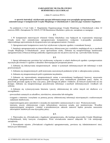 ZARZĄDZENIE NR 536-PR.139/2012 BURMISTRZA GŁUCHOŁAZ z dnia 21 czerwca 2012 r. w sprawie instrukcji użytkowania sprzętu informatycznego oraz przeglądu oprogramowania zainstalowanego w komputerach Urzędu Miejskiego w Głuchołazach w zakresie jego ważności i legalności Na podstawie § 8 ust 4 pkt. f Regulaminu Organizacyjnego Urzędu Miejskiego w Głuchołazach z dnia 12 czerwca 2008 r Zarządzenie Nr 328-Pr.157/08 Burmistrza Głuchołaz z późn.zm. zarządzam co następuje : § 1. 1. W komputerach stanowiących własność Gminy Głuchołazy oraz będących na wyposażeniu tutejszego Urzędu może być zainstalowane oprogramowanie komputerowe wyłącznie w przypadku posiadania odpowiedniego upoważnienia do dysponowania tym oprogramowaniem ( licencji). 2. Oprogramowanie komputerowe może być użytkowane wyłącznie zgodnie z warunkami licencji. 3. Instalacje oprogramowania na stanowiskach pracy dokonywane jest z nośników znajdujących się w zasobach Urzędu Miejskiego w Głuchołazach przez upoważnione osoby. Zabrania się nieuprawnionego instalowania oprogramowania zwłaszcza którego jednostka organizacyjna nie ma prawa używać np. z powodu braku licencji. § 2. 1. Sprzęt informatyczny powinien być użytkowany wyłącznie w celach służbowych zgodnie z postępowaniem etycznym jak również w zgodzie z aktualnie obowiązującymi przepisami prawa . 2. Zabrania się dokonywania nieuprawnionych zmian w systemach informatycznych lub informacji w nich przetwarzanych 3. Zabrania się nieuprawnionych prób testowania zauważonych podatności tj luk w zabezpieczeniu systemu, 4. Zabrania się nieuprawnionych prób wyjaśnienia incydentów, 5. Zabrania się wprowadzania nieuprawnionych zmian w zatwierdzonej konfiguracji bazowej, stosowania nielegalnego oprogramowania, nieuprawnionego logowania poza nominalnymi godzinami pracy, chyba, że pracownik poosiada zgodę na inny czas pracy, prób dostępu do plików i folderów, do których użytkownik nie ma dostępu. Zabrania się nieuprawnionego pozyskiwania informacji o zasobach informatycznych i środkach ich ochrony. 6. Zabrania się wykorzystywania Internetu i poczty elektronicznej do celów innych niż służbowe a w szczególności : - powszechnie uznanych za szkodliwe, niewłaściwe, niemoralne lub nielegalne - ściąganie z internetu i rozsyłanie za pomocą poczty elektronicznej informacji niezwiązanych z realizowanymi zadaniami służbowymi, - nieprzestrzegania praw autorskich w stosunku do materiałów zamieszczonych w sieci Wykorzystywanie internetu, poczty elektronicznej z tejże infrastruktury sieciowej urzędu, jest monitorowane. Wszelkie nieprzestrzeganie przepisów i ustaleń w przedmiotowym zakresie stanowić będzie poważne naruszenie obowiązków służbowych oraz dyscypliny pracy . § 3. 1. Wprowadza się „Oświadczenie o legalności oprogramowania„ dla każdego pracownika Urzędu Miejskiego w Głuchołazach, który korzysta z komputera. Wzór oświadczenia stanowi załącznik Nr 1 do niniejszego zarządzenia. 2. Prowadzenie rejestru „Oświadczeń o legalności oprogramowania„ powierza się Administratorowi sieci, którym jest Informatyk . ————————————————————————————————————————————————————————— Id: 32709EF0-F291-45F6-943A-EE5CDFCAECA6. Przyjety Strona 1 3. Administrator sieci jest zobowiązany do przeprowadzenia przeglądu oprogramowania wykorzystywanego w komputerach Urzędu Miejskiego w Głuchołazach oraz do odebrania oświadczeń o których mowa w § 3 ust.1 zarządzenia do dnia 31 sierpnia 2012 r. 4. Administrator sieci będzie przeprowadzać kontrolę legalności oprogramowania do której mogą być wykorzystywane programy kontrolne. 5. Kontrole będą przeprowadzane raz w roku tzw. „ogólne” oraz „doraźne” na wybranych stanowiskach pracy. 6. Z przeprowadzonych kontroli Administrator sieci sporządzi raporty, które przedkładane będą Burmistrzowi Głuchołaz . § 4. Dodatkowe legalne oprogramowanie może być zainstalowane na pisemny wniosek pracownika , zaakceptowany przez Burmistrza Głuchołaz .W przypadku zainstalowania nowego oprogramowania, Administrator sieci odnotowuje aktualizację „Oświadczenia o legalności oprogramowania „o którym mowa w § 3 ust.1 zarządzenia, poprzez wprowadzenia nowo zainstalowanego oprogramowania. § 5. 1. Pracownicy, którzy korzystając z przydzielonych lub udostępnionych im do pracy komputerów, dokonają w zainstalowanym oprogramowaniu zmian nieobjętych licencją albo samodzielnie zainstalują oprogramowanie bez odpowiedniej licencji lub wbrew jej warunkom , poniosą odpowiedzialność służbową, nie wyłączając możliwości odpowiedzialności karnej. 2. Za zainstalowanie oprogramowania na serwerach Urzędu Miejskiego w Głuchołazach odpowiada Administrator sieci wg posiadanych uprawnień . § 6. 1. Wszyscy pracownicy przyjmują do wiadomości i stosowania powyższe ustalenia, składając stosowne oświadczenie , sporządzone na piśmie wg wzoru stanowiącego załącznik Nr 2 do niniejszego zarządzenia 2. Niniejsze oświadczenie , zostaje dołączone do akt osobowych pracownika § 7. Zarządzenie wchodzi w życie z dniem podjęcia . Burmistrz Głuchołaz Edward Szupryczyński ————————————————————————————————————————————————————————— Id: 32709EF0-F291-45F6-943A-EE5CDFCAECA6. Przyjety Strona 2 Załącznik Nr 1 do Zarządzenia Nr 536-Pr.139/2012 Burmistrza Głuchołaz z dnia 21 czerwca 2012 r. Imię i nazwisko …............................................................ Wydział/Komórka …................................................................................................ Wykaz sprzętu, za który odpowiedzialny jest pracownik Nazwa/model Typ procesora Nr seryjny System operacyjny Data instalac