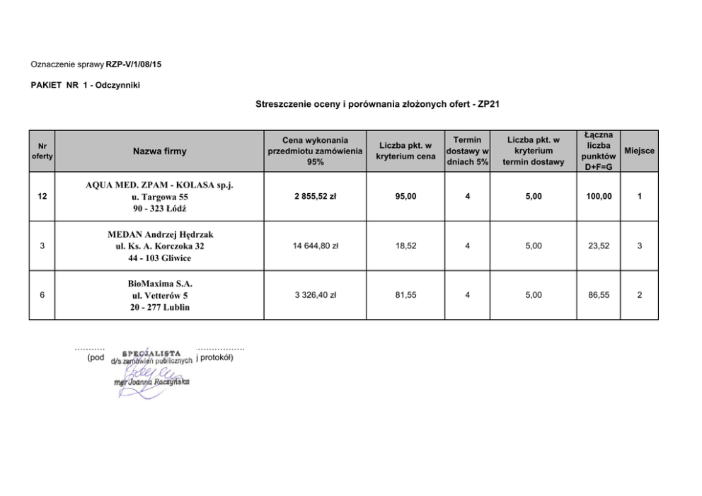 Oznaczenie sprawy RZP-V/1/08/15 PAKIET NR 1 - Odczynniki Streszczenie oceny i porównania złożonych ofert - ZP21 Nazwa firmy Cena wykonania przedmiotu zamówienia 95% Liczba pkt. w kryterium cena Termin dostawy w dniach 5% Liczba pkt. w kryterium termin dostawy Łączna liczba punktów D+F=G Miejsce 12 AQUA MED. ZPAM - KOLASA sp.j. u. Targowa 55 90 - 323 Łódź 2 855,52 zł 95,00 4 5,00 100,00 1 3 MEDAN Andrzej Hędrzak ul. Ks. A. Korczoka 32 44 - 103 Gliwice 14 644,80 zł 18,52 4 5,00 23,52 3 6 BioMaxima S.A. ul. Vetterów 5 20 - 277 Lublin 3 326,40 zł 81,55 4 5,00 86,55 2 Nr oferty ……………………………………………………. (podpis osoby sporządzającej protokół) Oznaczenie sprawy RZP-V/1/08/15 PAKIET NR 2 - Testy narkotyczne kasetkowe, testy Streszczenie oceny i porównania złożonych ofert - ZP21 Liczba pkt. w kryterium cena Termin dostawy w dniach 5% Liczba pkt. w kryterium termin dostawy Łączna liczba punktów D+F=G Miejsce Nr oferty Nazwa firmy Cena wykonania przedmiotu zamówienia 95% 6 BioMaxima S.A. ul. Vetterów 5 20 - 277 Lublin 2 413,80 zł 95,00 4 5,00 100,00 1 3 MEDAN Andrzej Hędrzak ul. Ks. A. Korczoka 32 44 - 103 Gliwice 4 618,08 zł 49,66 4 5,00 54,66 2 ……………………………………………………. (podpis osoby sporządzającej protokół) Oznaczenie sprawy RZP-V/1/08/15 PAKIET NR 3 - Paski do moczu - OFERTY DODATKOWE Streszczenie oceny i porównania złożonych ofert - ZP21 Nazwa firmy Cena wykonania przedmiotu zamówienia 95% Liczba pkt. w kryterium cena Termin dostawy w dniach 5% Liczba pkt. w kryterium termin dostawy Łączna liczba punktów D+F=G Miejsce 5 PZ CORMAY S.A. ul. Wiosenna 22 05-092 Łomianki 5 832,00 zł 95,00 4 5,00 100,00 1 11 AMP Polska Sp. z o.o. ul. Bolesława Prusa 37/1 30-117 Kraków 6 314,76 zł 87,74 4 5,00 92,74 2 3 MEDAN Andrzej Hędrzak ul. Ks. A. Korczoka 32 44 - 103 Gliwice 9 396,00 zł 58,97 4 5,00 63,97 4 13 P.H.P.U. ALLMED Andrzej Biedroń ul. Pawła z Krosna 7 30-389 Kraków 9 396,00 zł 58,97 7 2,86 61,82 5 12 AQUA MED. ZPAM - KOLASA sp.j. u. Targowa 55 90 - 323 Łódź 7 452,00 zł 74,35 4 5,00 79,35 3 6 BioMaxima S.A. ul. Vetterów 5 20 - 277 Lublin 11 664,00 zł 47,50 4 5,00 52,50 6 Nr oferty 9 STAMAR Zakład Odczynników do Diagnostyki Laboratoryjnej mgr inż. Dorota Szewczyk ul. F Perla 6 41 - 300 Dąbrowa Górnicza ……………………………………………………. (podpis osoby sporządzającej protokół) 12 312,00 zł 45,00 4 5,00 50,00 7 Oferta dodatkowa Oferta dodatkowa Oznaczenie sprawy RZP-V/1/08/15 PAKIET NR 4 - Odczynniki Streszczenie oceny i porównania złożonych ofert - ZP21 Nazwa firmy Cena wykonania przedmiotu zamówienia 95% Liczba pkt. w kryterium cena Termin dostawy w dniach 5% Liczba pkt. w kryterium termin dostawy Łączna liczba punktów D+F=G Miejsce 9 STAMAR Zakład Odczynników do Diagnostyki Laboratoryjnej mgr inż. Dorota Szewczyk ul. F Perla 6 41 - 300 Dąbrowa Górnicza 4 484,91 zł 95,00 4 5,00 100,00 1 12 AQUA MED. ZPAM - KOLASA sp.j. u. Targowa 55 90 - 323 Łódź _____ Oferta odrzucona na podst. art.. 89 ust. 1 pkt 2 Pzp Nr oferty ……………………………………………………. (podpis osoby sporządzającej protokół) 5 083,14 zł _______ 4 _______ Oznaczenie sprawy RZP-V/1/08/15 PAKIET NR 5 - Zestaw do szybkiego barwienia Streszczenie oceny i porównania złożonych ofert - ZP21 Nr oferty 12 3 Nazwa firmy AQUA MED. ZPAM - KOLASA sp.j. u. Targowa 55 90 - 323 Łódź MEDAN Andrzej Hędrzak ul. Ks. A. Korczoka 32 44 - 103 Gliwice ……………………………………………………. (podpis osoby sporządzającej protokół) Cena wykonania przedmiotu zamówienia 95% Liczba pkt. w kryterium cena Termin dostawy w dniach 5% Liczba pkt. w kryterium termin dostawy Łączna liczba punktów D+F=G Miejsce 2 980,80 zł 95,00 4 5,00 100,00 1 5 857,92 zł 48,34 4 5,00 53,34 2 Oznaczenie sprawy RZP-V/1/08/15 PAKIET NR 6 - Prokalcytonina test Streszczenie oceny i porównania złożonych ofert - ZP21 Nazwa firmy Cena wykonania przedmiotu zamówienia 95% Liczba pkt. w kryterium cena Termin dostawy w dniach 5% Liczba pkt. w kryterium termin dostawy Łączna liczba punktów D+F=G Miejsce 10 NOBIPHARM Sp. z o.o. ul. Rydygiera 8 01 - 793 Warszawa 5 313,60 zł 95,00 4 5,00 100,00 1 3 MEDAN Andrzej Hędrzak ul. Ks. A. Korczoka 32 44 - 103 Gliwice 9 007,20 zł 56,04 4 5,00 61,04 1 Nr oferty ……………………………………………………. (podpis osoby sporządzającej protokół) Oznaczenie sprawy RZP-V/1/08/15 PAKIET NR 7 - Podłoża Streszczenie oceny i porównania złożonych ofert - ZP21 Nr oferty 14 Nazwa firmy Cena wykonania przedmiotu zamówienia 95% Liczba pkt. w kryterium cena Termin dostawy w dniach 5% Liczba pkt. w kryterium termin dostawy Łączna liczba punktów D+F=G Miejsce GRASO Zenon Sobiecki 83 - 200 Starogard Gd. Krąg 4 A 18 130,50 zł 95,00 4 5,00 100,00 1 ……………………………………………………. (podpis osoby sporządzającej protokół) Oznaczenie sprawy RZP-V/1/08/15 PAKIET NR 8 - Krążki Streszczenie oceny i porównania złożonych ofert - ZP21 Liczba pkt. w kryterium cena Termin dostawy w dniach 5% Liczba pkt. w kryterium termin dostawy Łączna liczba punktów D+F=G Miejsce Nr oferty Nazwa firmy Cena wykonania przedmiotu zamówienia 95% 4 BioMaxima S.A. ul. Vetterów 5 20 - 277 Lublin Adres do korespondencji: BioMaxima S.A. CENTRUM MIKROBIOLOGII EMAPOL ul. Budowlanych 68 80-298 Gdańsk 6 254,39 zł 95,00 7 5,00 100,00 1 7 Argenta Spółka z ograniczoną odpowiedzialnością Sp. k. ul. Polska 114 60 - 401 Poznań 6 441,47 zł 92,24 7 5,00 97,24 2 ……………………………………………………. (podpis osoby sporządzającej protokół) Oznaczenie sprawy RZP-V/1/08/15 PAKIET NR 9 - Podłoża do posiewu krwi - aparat Streszczenie oceny i porównania złożonych ofert - ZP21 Nr oferty 2 Nazwa firmy Cena wykonania przedmiotu zamówienia 95% Liczba pkt. w kryterium cena 