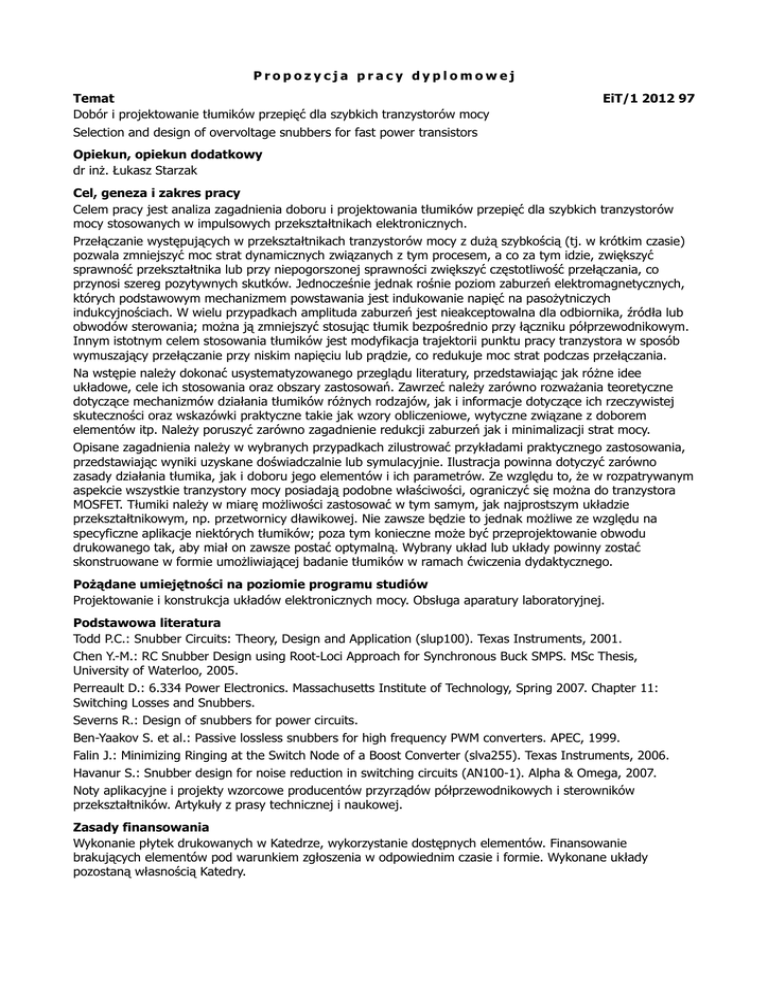 Propozycja pracy dyplomowej Temat Dobór i projektowanie tłumików przepięć dla szybkich tranzystorów mocy Selection and design of overvoltage snubbers for fast power transistors EiT/1 2012 97 Opiekun, opiekun dodatkowy dr inż. Łukasz Starzak Cel, geneza i zakres pracy Celem pracy jest analiza zagadnienia doboru i projektowania tłumików przepięć dla szybkich tranzystorów mocy stosowanych w impulsowych przekształtnikach elektronicznych. Przełączanie występujących w przekształtnikach tranzystorów mocy z dużą szybkością (tj. w krótkim czasie) pozwala zmniejszyć moc strat dynamicznych związanych z tym procesem, a co za tym idzie, zwiększyć sprawność przekształtnika lub przy niepogorszonej sprawności zwiększyć częstotliwość przełączania, co przynosi szereg pozytywnych skutków. Jednocześnie jednak rośnie poziom zaburzeń elektromagnetycznych, których podstawowym mechanizmem powstawania jest indukowanie napięć na pasożytniczych indukcyjnościach. W wielu przypadkach amplituda zaburzeń jest nieakceptowalna dla odbiornika, źródła lub obwodów sterowania; można ją zmniejszyć stosując tłumik bezpośrednio przy łączniku półprzewodnikowym. Innym istotnym celem stosowania tłumików jest modyfikacja trajektorii punktu pracy tranzystora w sposób wymuszający przełączanie przy niskim napięciu lub prądzie, co redukuje moc strat podczas przełączania. Na wstępie należy dokonać usystematyzowanego przeglądu literatury, przedstawiając jak różne idee układowe, cele ich stosowania oraz obszary zastosowań. Zawrzeć należy zarówno rozważania teoretyczne dotyczące mechanizmów działania tłumików różnych rodzajów, jak i informacje dotyczące ich rzeczywistej skuteczności oraz wskazówki praktyczne takie jak wzory obliczeniowe, wytyczne związane z doborem elementów itp. Należy poruszyć zarówno zagadnienie redukcji zaburzeń jak i minimalizacji strat mocy. Opisane zagadnienia należy w wybranych przypadkach zilustrować przykładami praktycznego zastosowania, przedstawiając wyniki uzyskane doświadczalnie lub symulacyjnie. Ilustracja powinna dotyczyć zarówno zasady działania tłumika, jak i doboru jego elementów i ich parametrów. Ze względu to, że w rozpatrywanym aspekcie wszystkie tranzystory mocy posiadają podobne właściwości, ograniczyć się można do tranzystora MOSFET. Tłumiki należy w miarę możliwości zastosować w tym samym, jak najprostszym układzie przekształtnikowym, np. przetwornicy dławikowej. Nie zawsze będzie to jednak możliwe ze względu na specyficzne aplikacje niektórych tłumików; poza tym konieczne może być przeprojektowanie obwodu drukowanego tak, aby miał on zawsze postać optymalną. Wybrany układ lub układy powinny zostać skonstruowane w formie umożliwiającej badanie tłumików w ramach ćwiczenia dydaktycznego. Pożądane umiejętności na poziomie programu studiów Projektowanie i konstrukcja układów elektronicznych mocy. Obsługa aparatury laboratoryjnej. Podstawowa literatura Todd P.C.: Snubber Circuits: Theory, Design and Application (slup100). Texas Instruments, 2001. Chen Y.-M.: RC Snubber Design using Root-Loci Approach for Synchronous Buck SMPS. MSc Thesis, University of Waterloo, 2005. Perreault D.: 6.334 Power Electronics. Massachusetts Institute of Technology, Spring 2007. Chapter 11: Switching Losses and Snubbers. Severns R.: Design of snubbers for power circuits. Ben-Yaakov S. et al.: Passive lossless snubbers for high frequency PWM converters. APEC, 1999. Falin J.: Minimizing Ringing at the Switch Node of a Boost Converter (slva255). Texas Instruments, 2006. Havanur S.: Snubber design for noise reduction in switching circuits (AN100-1). Alpha & Omega, 2007. Noty aplikacyjne i projekty wzorcowe producentów przyrządów półprzewodnikowych i sterowników przekształtników. Artykuły z prasy technicznej i naukowej. Zasady finansowania Wykonanie płytek drukowanych w Katedrze, wykorzystanie dostępnych elementów. Finansowanie brakujących elementów pod warunkiem zgłoszenia w odpowiednim czasie i formie. Wykonane układy pozostaną własnością Katedry.