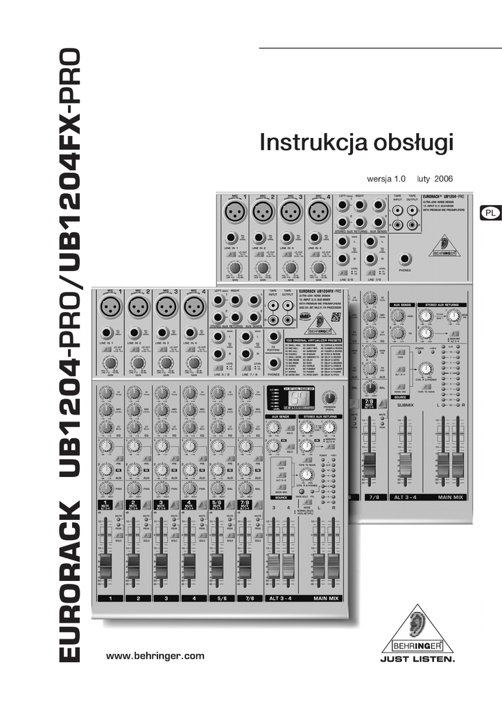 EURORACK UB1204-PRO/UB1204FX-PRO Instrukcja obs³ugi wersja 1.0 luty 2006 EURORACK UB1204-PRO/UB1204FX-PRO WA¯NE INFORMACJE O BEZPIECZEÑSTWIE UWAGA: W celu wykluczenia zagro¿enia pora¿enia pr¹dem zabrania siê zdejmowania obudowy lub tylnej cianki urz¹dzenia. Elementy znajduj¹ce siê we wnêtrzu urz¹dzenia nie mog¹ byæ naprawiane przez u¿ytkownika. Naprawy mog¹ byæ wykonywane jedynie przez wykwalifikowany personel. OSTRZE¯ENIE: W celu wykluczenia zagro¿enia pora¿enia pr¹dem lub zapalenia siê urz¹dzenia nie wolno wystawiaæ go na dzia³anie deszczu i wilgotnoci oraz dopuszczaæ do tego, aby do wnêtrza dosta³a siê woda lub inna ciecz. Nie nale¿y stawiaæ na urz¹dzeniu nape³nionych ciecz¹ przedmiotów tj. np. wazony z kwiatami. Ten symbol sygnalizuje obecnoæ nie izolowanego i niebezpiecznego napiêcia we wnêtrzu urz¹dzenia i oznacza zagro¿enie pora¿enia pr¹dem. Ten symbol informuje o wa¿nych wskazówkach dotycz¹cych obs³ugi i konserwacji urz¹dzenia w do³¹czonej dokumentacji. Proszê przeczytaæ stosowne informacje w instrukcji obs³ugi. Zastrzega siê prawo wprowadzania bez uprzedzenia zmian parametrów technicznych i wygl¹du. Niniejsza informacja jest aktualna na moment druku. Nazwy firm, instytucji lub publikacji, które zosta³y wspomniane lub których zdjêcia zosta³y umieszczone oraz ich logo s¹ zarejestrowanymi znakami handlowymi nale¿¹cymi do poszczególnych w³acicieli. Ich u¿ycie w ¿aden sposób nie uprawnia BEHRINGER® do u¿ywania tych znaków handlowych ani do afiliowania w³acicieli znaków z firm¹ BEHRINGER®. BEHRINGER® nie ponosi odpowiedzialnoci za jakiekolwiek straty, które mog¹ ponieæ jakiekolwiek osoby, które opar³y siê w ca³oci lub w czêci na jakichkolwiek opisach, fotografiach lub owiadczeniach tu zawartych. Kolorystyka i parametry mog¹ siê nieznacznie ró¿niæ od tych, które posiada produkt. Sprzeda¿ produktów odbywa siê wy³¹cznie przez autoryzowan¹ sieæ dealersk¹. Dystrybutorzy i dealerzy nie s¹ przedstawicielami BEHRINGER® i nie maj¹ ¿adnego prawa zaci¹gaæ w imieniu BEHRINGER® jakichkolwiek zobowi¹zañ, w sposób bezporedni lub dorozumiany, ani te¿ reprezentowaæ BEHRINGER®. Niniejsza instrukcja obs³ugi podlega ochronie prawem autorskim. Powielanie, kopiowanie, równie¿ czêciowe oraz jakiekolwiek reprodukowanie ilustracji z niniejszej instrukcji, równie¿ w zmienionej formie, dopuszczalne jest jedynie na podstawie zgody wyra¿onej na pimie przez BEHRINGER Spezielle Studiotechnik GmbH. BEHRINGER® jest zarejestrowanym znakiem handlowym. WSZELKIE PRAWA ZASTRZE¯ONE © 2006 BEHRINGER Spezielle Studiotechnik GmbH, Hanns-Martin-Schleyer-Str. 36-38, 47877 Willich-Münchheide II, Germany. tel. +49 2154 9206 0, fax +49 2154 9206 4903 2 WSKAZÓWKI DOTYCZ¥CE BEZPIECZEÑSTWA: 1) Proszê przeczytaæ poni¿sze wskazówki. 2) Proszê przechowywaæ niniejsz¹ instrukcjê. 3) Przestrzegaæ wszystkich wskazówek ostrzegawczych. 4) Postêpowaæ zgodnie z instrukcj¹ obs³ugi. 5) Urz¹dzenia nie u¿ywaæ w pobli¿u wody. 6) Urz¹dzenie czyciæ such¹ szmatk¹. 7) Nie zas³aniaæ otworów wentylacyjnych. W czasie pod³¹czania urz¹dzenia przestrzegaæ zaleceñ producenta. 8) Nie stawiaæ urz¹dzenia w pobli¿u róde³ ciep³a. ród³ami ciep³a s¹ np. grzejniki, piece lub inne produkuj¹ce ciep³o urz¹dzenia (równie¿ wzmacniacze). 9) W ¿adnym wypadku nie nale¿y usuwaæ zabezpieczeñ z wtyczek dwubiegunowych oraz wtyczek z uziemieniem. Wtyczka dwubiegunowa posiada dwa wtyki kontaktowe o ró¿nej szerokoci. Wtyczka z uziemieniem ma dwa wtyki kontaktowe i trzeci wtyk uziemienia. Szerszy wtyk kontaktowy lub dodatkowy wtyk uziemienia s³u¿¹ do zapewnienia bezpieczeñstwa u¿ytkownikowi. Jeli format wtyczki urz¹dzenia nie odpowiada standardowi gniazdka, proszê zwróciæ siê do elektryka z prob¹ o wymienienie gniazda. 10) Kabel sieciowy nale¿y u³o¿yæ tak, aby nie by³ nara¿ony na deptanie i dzia³anie ostrych krawêdzi, co mog³oby doprowadziæ do jego uszkodzenia. Szczególn¹ uwagê zwróciæ nale¿y na odpowiedni¹ ochronê miejsc w pobli¿u wtyczek i przed³u¿aczy oraz miejsce, w którym kabel sieciowy przymocowany jest do urz¹dzenia. 11) U¿ywaæ jedynie sprzêtu dodatkowego i akcesoriów zgodnie z zaleceniami producenta. 12) U¿ywaæ jedynie zalecanych przez producenta lub znajduj¹cych siê w zestawie wózków, stojaków, statywów, uchwytów i sto³ów. W przypadku pos³ugiwania siê wózkiem nale¿y zachowaæ szczególn¹ ostro¿noæ w trakcie przesuwania zestawu, aby unikn¹æ niebezpieczeñstwa potkniêcia siê i zranienia. 13) W trakcie burzy oraz na czas d³u¿szego nieu¿ywania urz¹dzenia nale¿y wyj¹æ wtyczkê z gniazdka sieciowego. 14) Wykonywanie wszelkich napraw zlecaæ nale¿y jedynie wykwalifikowanym pracownikom serwisu. Przeprowadzenie przegl¹du technicznego staje siê konieczne, jeli urz¹dzenie zosta³o uszkodzone w jakiejkolwiek formie (np. uszkodzenie kabla sieciowego lub wtyczki), jeli do wnêtrza urz¹dzenia dosta³y siê przedmioty lub ciecz, jeli urz¹dzenie wystawione by³o na dzia³anie deszczu lub wilgoci oraz jeli urz¹dzenie nie funkcjonuje poprawnie lub kiedy spad³o na pod³ogê. 15) UWAGA! Instrukcje serwisowe mog¹ byæ wykonywane jedynie przez wykwalifikowany personel. W celu unikniêcia zagro¿enia pora¿enia pr¹dem nie nale¿y wykonywaæ ¿adnych napraw, które nie s¹ opisane w instrukcji obs³ugi. Naprawy wykonywane mog¹ byæ jedynie przez wykwalifikowany personel techniczny. EURORACK UB1204-PRO/UB1204FX-PRO SPIS TRECI 1. WPROWADZENIE ..............................................................................................4 1.1 Ogólne funkcje miksera ..................................................................................................................................... 4 1.2 Podrêcznik .............................................................................................................................................