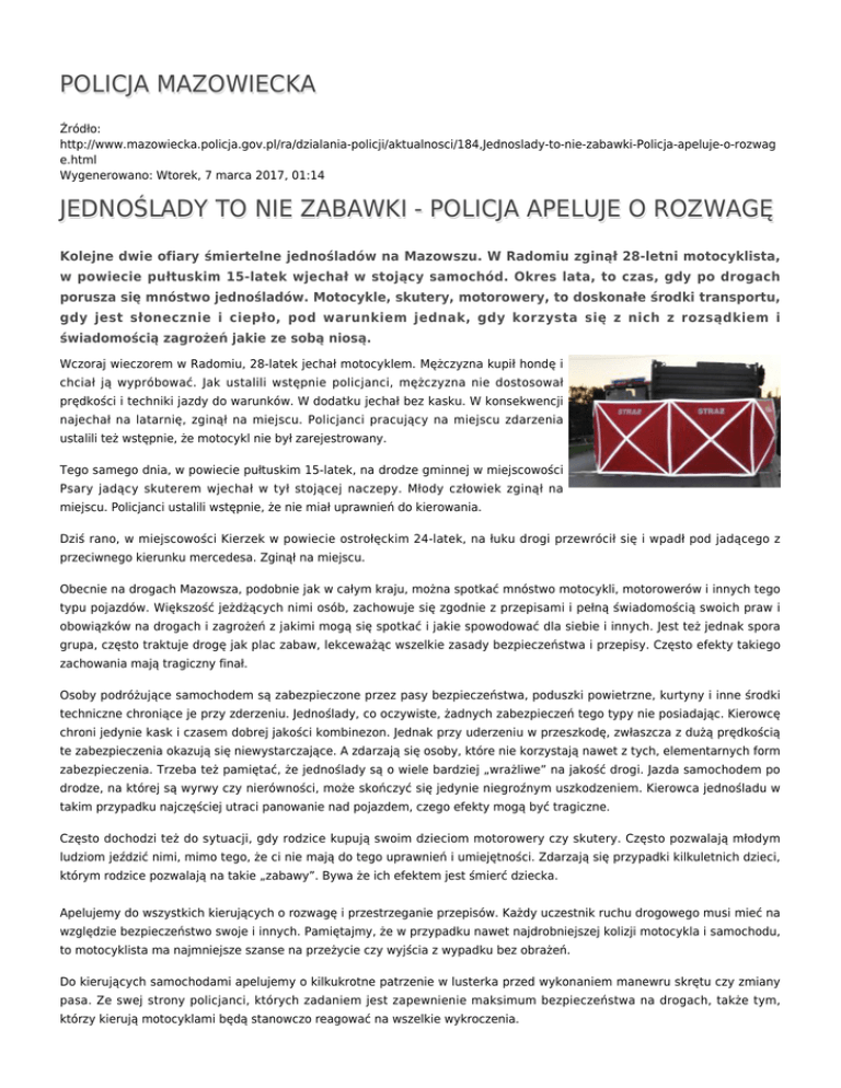 POLICJA MAZOWIECKA Źródło: http://www.mazowiecka.policja.gov.pl/ra/dzialania-policji/aktualnosci/184,Jednoslady-to-nie-zabawki-Policja-apeluje-o-rozwag e.html Wygenerowano: Wtorek, 7 marca 2017, 01:14 JEDNOŚLADY TO NIE ZABAWKI - POLICJA APELUJE O ROZWAGĘ Kolejne dwie ofiary śmiertelne jednośladów na Mazowszu. W Radomiu zginął 28-letni motocyklista, w powiecie pułtuskim 15-latek wjechał w stojący samochód. Okres lata, to czas, gdy po drogach porusza się mnóstwo jednośladów. Motocykle, skutery, motorowery, to doskonałe środki transportu, gdy jest słonecznie i ciepło, pod warunkiem jednak, gdy korzysta się z nich z rozsądkiem i świadomością zagrożeń jakie ze sobą niosą. Wczoraj wieczorem w Radomiu, 28-latek jechał motocyklem. Mężczyzna kupił hondę i chciał ją wypróbować. Jak ustalili wstępnie policjanci, mężczyzna nie dostosował prędkości i techniki jazdy do warunków. W dodatku jechał bez kasku. W konsekwencji najechał na latarnię, zginął na miejscu. Policjanci pracujący na miejscu zdarzenia ustalili też wstępnie, że motocykl nie był zarejestrowany. Tego samego dnia, w powiecie pułtuskim 15-latek, na drodze gminnej w miejscowości Psary jadący skuterem wjechał w tył stojącej naczepy. Młody człowiek zginął na miejscu. Policjanci ustalili wstępnie, że nie miał uprawnień do kierowania. Dziś rano, w miejscowości Kierzek w powiecie ostrołęckim 24-latek, na łuku drogi przewrócił się i wpadł pod jadącego z przeciwnego kierunku mercedesa. Zginął na miejscu. Obecnie na drogach Mazowsza, podobnie jak w całym kraju, można spotkać mnóstwo motocykli, motorowerów i innych tego typu pojazdów. Większość jeżdżących nimi osób, zachowuje się zgodnie z przepisami i pełną świadomością swoich praw i obowiązków na drogach i zagrożeń z jakimi mogą się spotkać i jakie spowodować dla siebie i innych. Jest też jednak spora grupa, często traktuje drogę jak plac zabaw, lekceważąc wszelkie zasady bezpieczeństwa i przepisy. Często efekty takiego zachowania mają tragiczny finał. Osoby podróżujące samochodem są zabezpieczone przez pasy bezpieczeństwa, poduszki powietrzne, kurtyny i inne środki techniczne chroniące je przy zderzeniu. Jednoślady, co oczywiste, żadnych zabezpieczeń tego typy nie posiadając. Kierowcę chroni jedynie kask i czasem dobrej jakości kombinezon. Jednak przy uderzeniu w przeszkodę, zwłaszcza z dużą prędkością te zabezpieczenia okazują się niewystarczające. A zdarzają się osoby, które nie korzystają nawet z tych, elementarnych form zabezpieczenia. Trzeba też pamiętać, że jednoślady są o wiele bardziej „wrażliwe” na jakość drogi. Jazda samochodem po drodze, na której są wyrwy czy nierówności, może skończyć się jedynie niegroźnym uszkodzeniem. Kierowca jednośladu w takim przypadku najczęściej utraci panowanie nad pojazdem, czego efekty mogą być tragiczne. Często dochodzi też do sytuacji, gdy rodzice kupują swoim dzieciom motorowery czy skutery. Często pozwalają młodym ludziom jeździć nimi, mimo tego, że ci nie mają do tego uprawnień i umiejętności. Zdarzają się przypadki kilkuletnich dzieci, którym rodzice pozwalają na takie „zabawy”. Bywa że ich efektem jest śmierć dziecka. Apelujemy do wszystkich kierujących o rozwagę i przestrzeganie przepisów. Każdy uczestnik ruchu drogowego musi mieć na względzie bezpieczeństwo swoje i innych. Pamiętajmy, że w przypadku nawet najdrobniejszej kolizji motocykla i samochodu, to motocyklista ma najmniejsze szanse na przeżycie czy wyjścia z wypadku bez obrażeń. Do kierujących samochodami apelujemy o kilkukrotne patrzenie w lusterka przed wykonaniem manewru skrętu czy zmiany pasa. Ze swej strony policjanci, których zadaniem jest zapewnienie maksimum bezpieczeństwa na drogach, także tym, którzy kierują motocyklami będą stanowczo reagować na wszelkie wykroczenia. Zespół Prasowy KWP zs. w Radomiu Ocena: 0/5 (0) Tweetnij