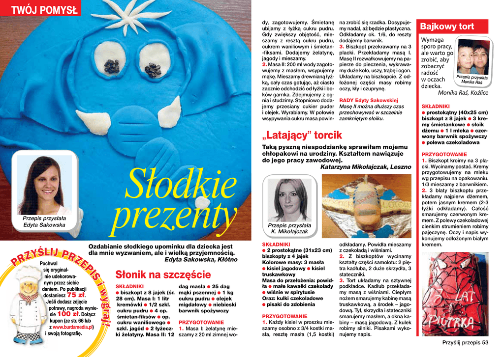 TWÓJ POMYSŁ dy, zagotowujemy. Śmietanę ubijamy z łyżką cukru pudru. Gdy zwiększy objętość, mieszamy z resztą cukru pudru, cukrem waniliowym i śmietan-fiksami. Dodajemy żelatynę, jagody i mieszamy. 2. Masa II: 200 ml wody zagotowujemy z masłem, wsypujemy mąkę. Mieszamy drewnianą łyżką, cały czas gotując, aż ciasto zacznie odchodzić od łyżki i boków garnka. Zdejmujemy z ognia i studzimy. Stopniowo dodajemy przesiany cukier puder i olejek. Wyrabiamy. W połowie wsypywania cukru masa powin- na zrobić się rzadka. Dosypujemy nadal, aż będzie plastyczna. Odkładamy ok. 1/6, do reszty dodajemy barwnik. 3. Biszkopt przekrawamy na 3 placki. Przekładamy masą I. Masę II rozwałkowujemy na papierze do pieczenia, wykrawamy duże koło, uszy, trąbę i ogon. Układamy na biszkopcie. Z odłożonej części masy robimy oczy, kły i czuprynę. RADY Edyty Sakowskiej Masę II można dłuższy czas przechowywać w szczelnie zamkniętym słoiku. „Latający” torcik Słodkie prezenty Przepis przysłała Edyta Sakowska Ozdabianie słodkiego upominku dla dziecka jest dla mnie wyzwaniem, ale i wielką przyjemnością. Edyta Sakowska, Kłótno Pochwal się oryginalnie udekorowanym przez siebie daniem. Po publikacji dostaniesz 75 zł. Jeśli dodasz zdjęcie potrawy, nagroda wyniesie 100 zł. Dołącz kupon (ze str. 66 lub z www.burdamedia.pl) i swoją fotografię. Słonik na szczęście SKŁADNIKI ● biszkopt z 8 jajek (śr. 28 cm). Masa I: 1 litr kremówki ● 1/2 szkl. cukru pudru ● 4 op. śmietan-fiksów ● op. cukru waniliowego ● szkl. jagód ● 2 łyżeczki żelatyny. Masa II: 12 dag masła ● 25 dag mąki pszennej ● 1 kg cukru pudru ● olejek migdałowy ● niebieski barwnik spożywczy PRZYGOTOWANIE 1. Masa I: żelatynę mieszamy z 20 ml zimnej wo- Taką pyszną niespodziankę sprawiłam mojemu chłopakowi na urodziny. Kształtem nawiązuje do jego pracy zawodowej. Katarzyna Mikołajczak, Leszno Przepis przysłała K. Mikołajczak odkładamy. Powidła mieszamy z czekoladą i wiśniami. 2. Z biszkoptów wycinamy kształty części samolotu: 2 piętra kadłuba, 2 duże skrzydła, 3 stateczniki. 3. Tort układamy na sztywnej podkładce. Kadłub przekładamy masą z wiśniami. Ciepłym nożem smarujemy kabinę masą truskawkową, a środek – jagodową. Tył, skrzydła i stateczniki PRZYGOTOWANIE smarujemy masłem, a okna ka1. Każdy kisiel w proszku mie- biny – masą jagodową. Z kulek szamy osobno z 3/4 kostki ma- robimy silniki. Pisakami wykosła, resztę masła (1,5 kostki) nujemy napis. SKŁADNIKI ● 2 prostokątne (31x23 cm) biszkopty z 4 jajek Kolorowe masy: 3 masła ● kisiel jagodowy ● kisiel truskawkowy Masa do przełożenia: powidła ● małe kawałki czekolady ● wiśnie w spirytusie Oraz: kulki czekoladowe ● pisaki do zdobienia Bajkowy tort Wymaga sporo pracy, ale warto go zrobić, aby zobaczyć radość Przepis przysłała w oczach Monika Raś dziecka. Monika Raś, Koźlice SKŁADNIKI ● prostokątny (40x25 cm) biszkopt z 8 jajek ● 3 kremy śmietankowe ● słoik dżemu ● 1 l mleka ● czerwony barwnik spożywczy ● polewa czekoladowa PRZYGOTOWANIE 1. Biszkopt kroimy na 3 placki. Wycinamy postać. Kremy przygotowujemy na mleku wg przepisu na opakowaniu. 1/3 mieszamy z barwnikiem. 2. 3 blaty biszkoptu przekładamy najpierw dżemem, potem jasnym kremem (2-3 łyżki odkładamy). Całość smarujemy czerwonym kremem. Z polewy czekoladowej cienkim strumieniem robimy pajęczynę. Oczy i napis wykonujemy odłożonym białym kremem. Przyślij przepis 53