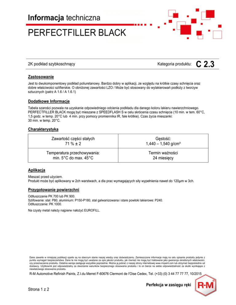 Informacja techniczna PERFECTFILLER BLACK 2K podkład szybkoschnący Kategoria produktu: C 2.3 Zastosowanie Jest to dwukomponentowy podkład poliuretanowy. Bardzo dobry w aplikacji, ze względu na krótkie czasy schnięcia oraz dobre właściwości szlifierskie. O obniżonej zawartości LZO / Może być stosowany do wylakierowań podłoży z tworzyw sztucznych (patrz A 1.6 / A 1.6.1) Dodatkowe Informacje Tabela szarości pozwala na uzyskanie odpowiedniego odcienia podkładu dla danego koloru lakieru nawierzchniowego. PERFECTFILLER BLACK mogą być mieszane z SPEEDFLASH S w celu skrócenia czasu schnięcia (10 min. w tem. 60°C, 1,5 godz. w temp. 20°C lub 4 min. przy pomocy promiennika IR, fale krótkie). Czas życia mieszanki: 30 min. w temp. 20°C. Charakterystyka Zawartość części stałych 71 % ± 2 Gęstość: 1,440 – 1,540 g/cm³ Temperatura przechowywania: min. 5°C do max. 45°C Termin ważności 24 miesięcy Aplikacja Mieszać przed użyciem. Produkt może być aplikowany w 2ch warstwach, a dla prac wymagających siły wypełnienia nawet do 120µm w 3ch. Przygotowanie powierzchni Odtłuszczanie PK 700 lub PK 900. Szlifowanie: stal: P80, aluminium: P150-P180, stal galwanizowana i stare powłoki lakierowe: P240. Odtłuszczanie: PK 1000. Na czysty metal należy najpierw nałożyć EUROFILL. Dane zawarte w niniejszej publikacji oparte są na obecnym stanie naszej wiedzy oraz doświadczeniu. Zamieszczone informacje mają na celu opisanie produktu jedynie z punktu wymagań bezpieczeństwa. Dane te nie mogą być uważane za opis jakości produktu, jak również nie mogą być traktowane jako gwarancja określonych właściwości, czy przeznaczenia produktu. Ostatnia wersja zastępuje wszystkie poprzednie. Można ją pobrać z naszej strony internetowej www.rmpaint.com lub otrzymać bezpośrednio od dostawcy. Użytkownik jest odpowiedzialny za stworzenie warunków bezpiecznego stosowania produktu i to on bierze na siebie odpowiedzialność za skutki wynikające z niewłaściwego stosowania produktu. R-M Automotive Refinish Paints, Z.I.du Merret F-60676 Clermont de l'Oise Cedex, Tel. (+33) (0) 3 44 77 77 77, 10/2015 Strona 1 z 2 Perfekcja w zasięgu ręki Informacja techniczna PERFECTFILLER BLACK PERFECTFILLER BLACK D 70 / D 80 FR 500 / R 2100 / R 2200 / R 2300 100 (obj.) 25 (obj.) 25 (obj.) Lepkość natrysku w 20°C: Kubek ISO 4: Kubek DIN 4: 40 do 58 sekund 18 do 23 sekund 100 g 17 g 15 g Czas życia: 1 godz. w 20°C HVLP ze zbiornikiem górnym Konwencjonalny ze zbiornikiem górnym 1,7 – 1,9 mm 1,6 – 1,8 mm 0,7 bar na wyjściu 2,0 – 2,5 bar Liczba warstw: Grubość powłoki: 2 50 – 70 µm 3 80 – 120 µm Schnięcie w 20°C Schnięcie w 60°C 3 godz. 20 min. (fale krótkie) 9 min. Prace wykończeniowe P400 – P500 na sucho Instrukcja bezpieczeństwa 2004/42/IIB(cII)(540)539: Dopuszczalna zawartość LZO (kategoria produktu: IIB.cII) w gotowej do użycia mieszance wynosi 540g/l. Zawartość LZO w produkcie – 539 g/l. Produkt może zawierać części mniejsze od < 0.1 µm. Produkt do użytku profesjonalnego. Przy pracy z produktem należy stosować się do ogólnych zasad bezpieczeństwa oraz używać niezbędnych środków ochrony indywidualnej odpowiednich do występującego zagrożenia. Strona 2 z 2 Perfekcja w zasięgu ręki