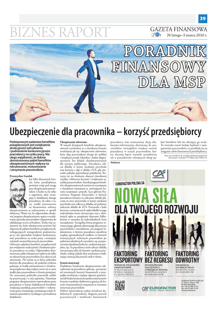 39 BIZNES RAPORT GAZETA FINANSOWA 26 lutego–3 marca 2016 r. PORADNIK FINANSOWY DLA MSP Ubezpieczenie dla pracownika – korzyść przedsiębiorcy Podstawowym zadaniem benefitów pozapłacowych jest zwiększenie atrakcyjności zatrudnienia i podniesienie konkurencyjności pracodawcy na rynku pracy. Nie ulega wątpliwości, że dobrze skonstruowany pakiet benefitów ubezpieczeniowych wpływa na rekrutowanie, motywowanie i utrzymanie pracowników. Przemysław Gawlak Jest kilka kluczowych kwestii, które przedsiębiorca powinien wziąć pod uwagę przy ubezpieczaniu pracowników. Chodzi tu nie tylko o zagrożenia, jakie występują w działalności danego pracodawcy, ale także o to, czy środki przeznaczone na finansowanie ochrony ubezpieczeniowej są wykorzystane w sposób efektywny. Ważne też, by odpowiednio zbudować program ubezpieczeniowy oparty o oczekiwania i potrzeby pracowników i dopasowany do zakładanego na ten cel budżetu. Trzeba więc zastanowić się, które ubezpieczenia powinny być włączone do pakietu benefitów pozapłacowych, wzbogacających wynagrodzenie podstawowe, po to, aby optymalnie zwiększyć konkurencyjność pracodawcy na rynku pracy i zmniejszyć wskaźnik retencji kluczowych pracowników. Głównym zadaniem benefitów pozapłacowych jest zwiększenie atrakcyjności i konkurencyjności pracodawcy na rynku. Odpowiednio skonstruowany pakiet ubezpieczeń wpływa nie tylko na rekrutowanie pracowników, lecz także na ich utrzymanie. Nie zawsze są to łatwo policzalne korzyści dla pracodawcy, ale praktyka rynkowa pokazuje, że środki zainwestowane w świadczenia pozapłacowe dają większy zwrot niż te same środki dane pracownikom w formie pieniężnej. Do otrzymanej podwyżki pracownik szybko się przyzwyczaja i o niej zapomina. Natomiast programy ubezpieczeniowe wprowadzone przez pracodawcę w formie dodatkowych benefitów zwiększają satysfakcję pracowników z wykonywanej pracy zmniejszają i zmniejszają ryzyko finansowe pracodawcy wynikające z prowadzonej działalności. Ubezpieczenie zdrowotne W ramach dostępnych benefitów ubezpieczeniowych wyróżniamy te o charakterze korzyści teraźniejszej jak np. ubezpieczenia zdrowotne, które dają pracownikom dostęp do szybkiej i bezpłatnej porady lekarskiej i badań diagnostycznych, bez kolejek charakterystycznych dla systemu publicznego. Pracodawca zalicza składkę w koszty uzyskania przychodu oraz korzysta z ulgi w składce ZUS, gdy prowadzi politykę optymalizacji podatkowej. Korzysta też na obniżeniu absencji chorobowej (szybkie i efektywne leczenie) i zwiększeniu satysfakcji pracowników. Szeroki program benefitów ubezpieczeniowych zawiera też rozwiązania o charakterze mieszanym tj. zawierającym korzyści teraźniejsze i przyszłe. Są to głównie Pracownicze Programy Emerytalne, w których pracodawca korzysta na zaliczaniu składki płaconej na rzecz pracownika w koszty uzyskania przychodu oraz odlicza tę składkę od podstawy naliczenia składki do ZUS. Pracownik z kolei korzysta z comiesięcznych wpłat składki na jego indywidualne konto inwestycyjne oraz z obniżonych opłat za zarządzanie aktywami (kilkukrotnie w stosunku do indywidualnych form oszczędzania). Szczególną formą programu inwestycyjnego, głównie oferowanego kluczowym pracownikom i menedżerom, jest program lojalnościowy, w którym pracodawca umożliwia wypłatę zgromadzonych środków na kontach inwestycyjnych wybranych pracowników po spełnieniu określonych warunków, np. przepracowaniu określonej liczby lat, zrealizowaniu projektu, itp. Tu pracodawca może zaliczyć składkę inwestycyjną tylko do kosztów uzyskania przychodu, zyskuje jednak silny mechanizm zwiększający retencję kluczowych osób w firmie. System motywacji Dodatkowe świadczenia ubezpieczeniowe zdecydowanie się pracodawcy opłacają – począwszy od wymiernych korzyści finansowych w przypadku zwolnienia z wypłaty odprawy pośmiertnej lub braku konieczności pokrywania kosztów leczenia w podróży służbowej za granicą, do korzyści niematerialnych związanych ze wzrostem motywacji pracowników. Dobrze wprowadzony pakiet świadczeń dodatkowych, poprzedzony diagnozą potrzeb pracowniczych i możliwości finansowych pracodawcy oraz wzmocniony akcją edukacyjno-informacyjną skierowaną do pracowników, niewątpliwie zwiększa wartość pracodawcy w oczach pracowników, którzy docenią lepsze warunki zatrudnienia niż u pracodawców oferujących ubogi paReklama kiet benefitów lub nie oferujący go wcale. To wszystko razem buduje lojalność i zaangażowanie pracowników, co przekłada się na osiąganie celów biznesowych przedsiębiorcy. Autor jest menedżerem ds. sprzedaży ubezpieczeń grupowych, zdrowotnych i osobowych TU Allianz Życie Polska S.A. 40 PORADNIK FINANSOWY DLA MSP GAZETA FINANSOWA 26 lutego–3 marca 2016 r. BIZNES RAPORT Leasing, kredyt czy faktoring? Jak pokazują badania realizowane od lat przez rozmaite instytucje i ośrodki badawcze, blisko 60 proc. nakładów inwestycyjnych firm z segmentu MMŚP pochodzi ze środków własnych. Bardzo często koncentracja na własnych zasobach uniemożliwia dalszy rozwój firm i ich zagraniczną ekspansję. Z tego względu, warto skupić się na analizie zewnętrznych instrumentów. Andrzej Sugajski W wyborze odpowiedniego dla profilu firmy narzędzia pomocne będą następujące wskaźniki: dostępność instrumentu, wymagane zabezpieczenia, czas oczekiwania na decyzję kredytową, koszty czy wreszcie cel i specyfika przedsięwzięcia. O ofertę leasingu, kredytu i faktoringu możemy poprosić: banki (kredyt), spółki bankowe lub niezależne podmioty (leasing i faktoring). Definicja kredytu wynika z prawa bankowego, podczas gdy definicja leasingu została uregulowana w Kodeksie Cywilnym. W Polsce nie ma odrębnych regulacji prawnych odnoszących się do faktoringu, wykorzystywane są przepisy Kodeksu Cywilnego i Kodeksu prawa handlowego. Zarówno kredyt, jak i leasi