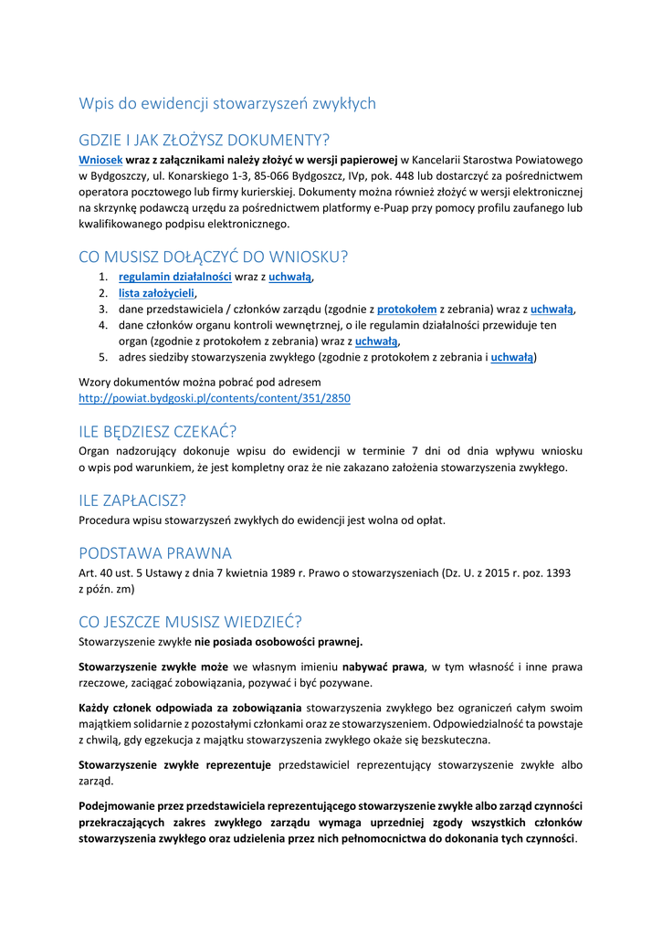 Wpis do ewidencji stowarzyszeń zwykłych GDZIE I JAK ZŁOŻYSZ DOKUMENTY? Wniosek wraz z załącznikami należy złożyć w wersji papierowej w Kancelarii Starostwa Powiatowego w Bydgoszczy, ul. Konarskiego 1-3, 85-066 Bydgoszcz, IVp, pok. 448 lub dostarczyć za pośrednictwem operatora pocztowego lub firmy kurierskiej. Dokumenty można również złożyć w wersji elektronicznej na skrzynkę podawczą urzędu za pośrednictwem platformy e-Puap przy pomocy profilu zaufanego lub kwalifikowanego podpisu elektronicznego. CO MUSISZ DOŁĄCZYĆ DO WNIOSKU? 1. 2. 3. 4. regulamin działalności wraz z uchwałą, lista założycieli, dane przedstawiciela / członków zarządu (zgodnie z protokołem z zebrania) wraz z uchwałą, dane członków organu kontroli wewnętrznej, o ile regulamin działalności przewiduje ten organ (zgodnie z protokołem z zebrania) wraz z uchwałą, 5. adres siedziby stowarzyszenia zwykłego (zgodnie z protokołem z zebrania i uchwałą) Wzory dokumentów można pobrać pod adresem http://powiat.bydgoski.pl/contents/content/351/2850 ILE BĘDZIESZ CZEKAĆ? Organ nadzorujący dokonuje wpisu do ewidencji w terminie 7 dni od dnia wpływu wniosku o wpis pod warunkiem, że jest kompletny oraz że nie zakazano założenia stowarzyszenia zwykłego. ILE ZAPŁACISZ? Procedura wpisu stowarzyszeń zwykłych do ewidencji jest wolna od opłat. PODSTAWA PRAWNA Art. 40 ust. 5 Ustawy z dnia 7 kwietnia 1989 r. Prawo o stowarzyszeniach (Dz. U. z 2015 r. poz. 1393 z późn. zm) CO JESZCZE MUSISZ WIEDZIEĆ? Stowarzyszenie zwykłe nie posiada osobowości prawnej. Stowarzyszenie zwykłe może we własnym imieniu nabywać prawa, w tym własność i inne prawa rzeczowe, zaciągać zobowiązania, pozywać i być pozywane. Każdy członek odpowiada za zobowiązania stowarzyszenia zwykłego bez ograniczeń całym swoim majątkiem solidarnie z pozostałymi członkami oraz ze stowarzyszeniem. Odpowiedzialność ta powstaje z chwilą, gdy egzekucja z majątku stowarzyszenia zwykłego okaże się bezskuteczna. Stowarzyszenie zwykłe reprezentuje przedstawiciel reprezentujący stowarzyszenie zwykłe albo zarząd. Podejmowanie przez przedstawiciela reprezentującego stowarzyszenie zwykłe albo zarząd czynności przekraczających zakres zwykłego zarządu wymaga uprzedniej zgody wszystkich członków stowarzyszenia zwykłego oraz udzielenia przez nich pełnomocnictwa do dokonania tych czynności. Stowarzyszenie zwykłe powstaje i może rozpocząć działalność z chwilą wpisu do ewidencji. Organ nadzorujący dokonuje wpisu do ewidencji w terminie 7 dni od dnia wpływu wniosku o wpis pod warunkiem, że nie zakazano założenia stowarzyszenia zwykłego. Jeżeli wniosek o wpis zawiera braki, organ nadzorujący wzywa do jego uzupełnienia w terminie 14 dni od dnia otrzymania wezwania. Termin na dokonanie wpisu liczy się wtedy od dnia uzupełnienia wniosku o wpis. Nieuzupełnienie wniosku o wpis w terminie 14 dni powoduje jego bezskuteczność. Organ nadzorujący informuje niezwłocznie przedstawiciela reprezentującego stowarzyszenie zwykłe albo zarząd o dokonaniu wpisu do ewidencji albo bezskuteczności wniosku o wpis. Prawo tworzenia stowarzyszeń przysługuje obywatelom polskim mającym pełną zdolność do czynności prawnych i niepozbawionym praw publicznych. Cudzoziemcy mający miejsce zamieszkania na terytorium Rzeczypospolitej Polskiej mogą zrzeszać się w stowarzyszeniach, zgodnie z przepisami obowiązującymi obywateli polskich, natomiast cudzoziemcy niemający miejsca zamieszkania na terytorium Rzeczypospolitej Polskiej mogą wstępować do stowarzyszeń, których statuty przewidują taką możliwość. Małoletni w wieku od 16 do 18 lat, którzy mają ograniczoną zdolność do czynności prawnych, mogą należeć do stowarzyszeń i korzystać z czynnego i biernego prawa wyborczego, z tym że w składzie zarządu stowarzyszenia większość muszą stanowić osoby o pełnej zdolności do czynności prawnych. Małoletni poniżej 16 lat mogą, za zgodą przedstawicieli ustawowych, należeć do stowarzyszeń według zasad określonych w ich statutach, bez prawa udziału w głosowaniu na walnych zebraniach członków oraz bez korzystania z czynnego i biernego prawa wyborczego do władz stowarzyszenia. Jeżeli jednak jednostka organizacyjna stowarzyszenia zrzesza wyłącznie małoletnich, mogą oni wybierać i być wybierani do władz tej jednostki. Nadzór nad działalnością stowarzyszeń należy do starosty właściwego ze względu na siedzibę stowarzyszenia. Stowarzyszenie zwykłe, w przypadku podjęcia uchwały o rozwiązaniu, podlega procedurze likwidacji. Stowarzyszenie zwykłe składa organowi nadzorującemu, w terminie 7 dni od dnia wystąpienia zdarzenia uzasadniającego zmianę danych, wniosek o zamieszczenie w ewidencji zmienionych danych, załączając dokumenty stanowiące podstawę zmiany. Stowarzyszenie zwykłe ma obowiązek informować o zmianie adresu zamieszkania przedstawiciela i członków komisji rewizyjnej, jeżeli taki organ ustanowiono. Stowarzyszenie zwykłe nie może: powoływać terenowych jednostek organizacyjnych, zrzeszać osób prawnych, prowadzić działalności gospodarczej, prowadzić odpłatnej działalności pożytku publicznego. Szczegółowa informacja jest dostępna pod adresem http://powiat.bydgoski.pl/contents/content/351/2873 KTO ZAŁATWI TWOJĄ SPRAWĘ? Sprawy związane z wpisem do ewidencji stowarzyszeń zwykłych prowadzi Wydział Rozwoju i Funduszy Europejskich, ul. Konarskiego 1-3, 85-066 Bydgoszcz. W celu uzyskania szczegółowych informacji można zadzwonić pod nr 52 5835 440, w godzinach pracy urzędu. 2016 V 19 AJ BIP Strona 2 z 2