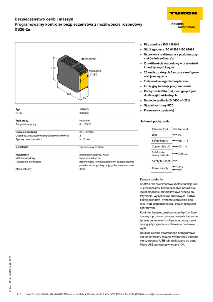Bezpieczeństwo osób i maszyn Programowalny kontroler bezpieczeństwa z możliwością rozbudowy XS26-2e ■ PLe zgodne z ISO 13849-1 ■ SIL 3 zgodny z IEC 61508 i IEC 62061 ■ Ustawienia realizowane z poziomu przycisków lub software'u ■ Z możliwością rozbudowy o przekaźniki i moduły wejść i wyjść ■ 26 wejść, z których 8 można skonfigurować jako wyjścia ■ 2 niezależne wyjścia bezpieczne ■ Intuicyjny interfejs programowania ■ Podłączenie Ethernet, dostępnych jest do 64 wyjść wirtualnych ■ Napięcie zasilania 24 VDC +/- 20% ■ Stopień ochrony IP20 Typ Nr kat. XS26-2e 3085063 ■ Freeware (w zestawie) Tryb pracy Temperatura pracy Kontroler 0…+55 °C Schemat podłączenia Napięcie zasilania Liczba bezpiecznych wyjść półprzewodnikowych Typowy czas odpowiedzi 20… 28VDC 2 < 10 ms Certyfikaty CE, cULus w wykazie Wykonanie Materiał obudowy Połączenie elektryczne prostopadłościenna, XS26 tworzywo sztuczne zdejmowalny terminal zaciskowy, zabezpieczenie przed odwrotną polaryzacją, połączenie śrubowe IP20 Klasa ochrony Zasada działania Kontroler bezpieczeństwa spełnia funkcje wielu przekaźników bezpieczeństwa umożliwiając podłączenie przycisków awaryjnego zatrzymania, wyłączników drzwiowych, kurtyn bezpieczeństwa, systemu sterowania oburącz, mat bezpieczeństwa i innych urządzeń ochronnych. Kontroler bezpieczeństwa może być konfigurowany z poziomu oprogramowania i automatycznie generować konfigurację podłączenia i podgląd programu w schemacie drabinkowym. Edition • 2016-11-09T16:14:40+01:00 Do skopiowania stworzonego oprogramowania do kontrolera można wykorzystać połączenie szeregowe USB lub podłączaną do portu Micro USB pamięć zewnętrzną XM. 1/3 Hans Turck GmbH & Co.KG ñ D-45472 Mülheim an der Ruhr ñ Witzlebenstraße 7 ñ Tel. 0208 4952-0 ñ Fax 0208 4952-264 ñ [email protected] ñ www.turck.com Bezpieczeństwo osób i maszyn Programowalny kontroler bezpieczeństwa z możliwością rozbudowy XS26-2e Akcesoria - okablowanie Typ Nr kat. SC-TC2 3085078 Terminale klatkowe; 8 portów Rysunek wymiarowy SC-TS2 3085076 Terminale klatkowe; 8 portów SC-XMP2 3029482 Adapter programujący Akcesoria - funkcja Typ Nr kat. SC-USB2 3029480 Rysunek wymiarowy SC-XM2 3029481 Zewnętrzna karta pamięci, Micro-B; konfiguracja EEPROM Resource CD 3090443 CD-ROM, oprogramowanie konfiguracyjne, instrukcja uru- XS8si 3085070 Moduł wejść bezpieczeństwa (8 wejść) XS16si 3085069 Moduł wejść bezpieczeństwa (16 wejść) XS2so 3085072 Moduł wyjść bezpieczeństwa (2 wyjścia) XS4so 3085073 Moduł wyjść bezpieczeństwa (4 wyjścia) Przewód USB połączenia szeregowego, typ A do Micro-B; długość: 1,8m Edition • 2016-11-09T16:14:40+01:00 chomienia; 2/3 Hans Turck GmbH & Co.KG ñ D-45472 Mülheim an der Ruhr ñ Witzlebenstraße 7 ñ Tel. 0208 4952-0 ñ Fax 0208 4952-264 ñ [email protected] ñ www.turck.com Bezpieczeństwo osób i maszyn Programowalny kontroler bezpieczeństwa z możliwością rozbudowy XS26-2e Akcesoria - funkcja Nr kat. XS1ro 3085074 2-kanałowy przekaźnik bezpieczeństwa (1 wyjście) Rysunek wymiarowy XS2ro 3085075 2-kanałowy przekaźnik bezpieczeństwa (2 wyjścia) Edition • 2016-11-09T16:14:40+01:00 Typ 3/3 Hans Turck GmbH & Co.KG ñ D-45472 Mülheim an der Ruhr ñ Witzlebenstraße 7 ñ Tel. 0208 4952-0 ñ Fax 0208 4952-264 ñ [email protected] ñ www.turck.com