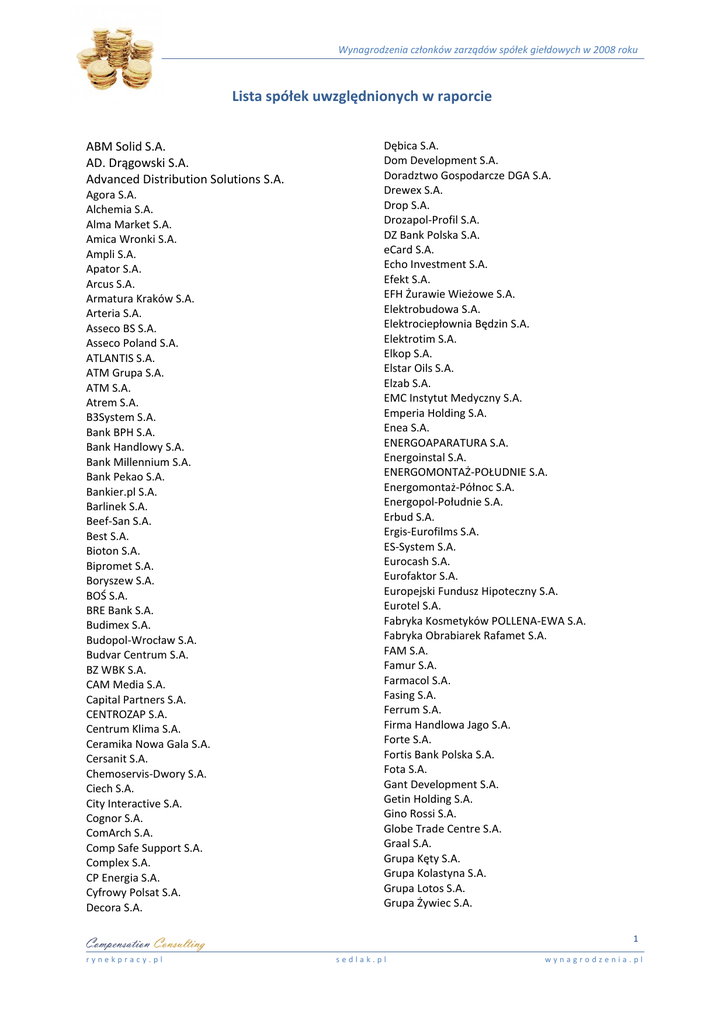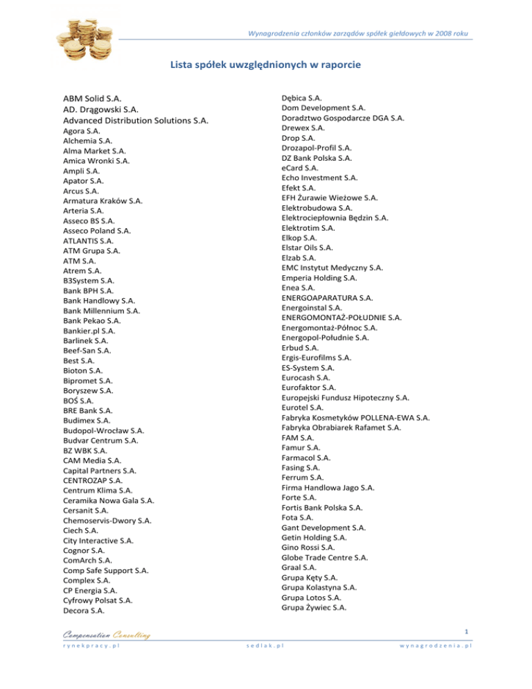 Wynagrodzenia członków zarządów spółek giełdowych w 2008 roku Lista spółek uwzględnionych w raporcie ABM Solid S.A. AD. Drągowski S.A. Advanced Distribution Solutions S.A. Agora S.A. Alchemia S.A. Alma Market S.A. Amica Wronki S.A. Ampli S.A. Apator S.A. Arcus S.A. Armatura Kraków S.A. Arteria S.A. Asseco BS S.A. Asseco Poland S.A. ATLANTIS S.A. ATM Grupa S.A. ATM S.A. Atrem S.A. B3System S.A. Bank BPH S.A. Bank Handlowy S.A. Bank Millennium S.A. Bank Pekao S.A. Bankier.pl S.A. Barlinek S.A. Beef-San S.A. Best S.A. Bioton S.A. Bipromet S.A. Boryszew S.A. BOŚ S.A. BRE Bank S.A. Budimex S.A. Budopol-Wrocław S.A. Budvar Centrum S.A. BZ WBK S.A. CAM Media S.A. Capital Partners S.A. CENTROZAP S.A. Centrum Klima S.A. Ceramika Nowa Gala S.A. Cersanit S.A. Chemoservis-Dwory S.A. Ciech S.A. City Interactive S.A. Cognor S.A. ComArch S.A. Comp Safe Support S.A. Complex S.A. CP Energia S.A. Cyfrowy Polsat S.A. Decora S.A. Dębica S.A. Dom Development S.A. Doradztwo Gospodarcze DGA S.A. Drewex S.A. Drop S.A. Drozapol-Profil S.A. DZ Bank Polska S.A. eCard S.A. Echo Investment S.A. Efekt S.A. EFH Żurawie Wieżowe S.A. Elektrobudowa S.A. Elektrociepłownia Będzin S.A. Elektrotim S.A. Elkop S.A. Elstar Oils S.A. Elzab S.A. EMC Instytut Medyczny S.A. Emperia Holding S.A. Enea S.A. ENERGOAPARATURA S.A. Energoinstal S.A. ENERGOMONTAŻ-POŁUDNIE S.A. Energomontaż-Północ S.A. Energopol-Południe S.A. Erbud S.A. Ergis-Eurofilms S.A. ES-System S.A. Eurocash S.A. Eurofaktor S.A. Europejski Fundusz Hipoteczny S.A. Eurotel S.A. Fabryka Kosmetyków POLLENA-EWA S.A. Fabryka Obrabiarek Rafamet S.A. FAM S.A. Famur S.A. Farmacol S.A. Fasing S.A. Ferrum S.A. Firma Handlowa Jago S.A. Forte S.A. Fortis Bank Polska S.A. Fota S.A. Gant Development S.A. Getin Holding S.A. Gino Rossi S.A. Globe Trade Centre S.A. Graal S.A. Grupa Kęty S.A. Grupa Kolastyna S.A. Grupa Lotos S.A. Grupa Żywiec S.A. 1 rynekpracy.pl sedlak.pl wynagrodzenia.pl Wynagrodzenia członków zarządów spółek giełdowych w 2008 roku HARDEX S.A. Hawe S.A. Herman S.A. HTL-Strefa S.A. Hutmen S.A. Hydrobudowa Polska S.A. Hydrotor S.A. Hygienika S.A. Hyperion S.A. IB System S.A. Iławskie Zakłady Naprawy Samochodów S.A. Impel S.A. Impexmetal S.A. Indykpol S.A. Infovide-Matrix S.A. ING Bank Śląski S.A. INSTAL KRAKÓW S.A. Integer.pl S.A. Inter Cars S.A. Inter Groclin Auto S.A. Interferie S.A. Internet Group S.A. Intersport S.A. Introl S.A. Inwest Consulting S.A. IZOLACJA-JAROCIN S.A. JUTRZENKA S.A. K2 Internet S.A. Karen S.A. KGHM Polska Miedź S.A. Koelner S.A. Komputronik S.A. Kopex S.A. KPPD S.A. Krakchemia S.A. Kredyt Bank S.A. Krośnieoskie Huty Szkła Krosno S.A. LC Corp S.A. Lena Lighting S.A. Lentex S.A. LSI Software S.A. Lubawa S.A. LZPS Protektor S.A. M.W. Trade S.A. Magellan S.A. Makarony Polskie S.A. Makrum S.A. Marvipol S.A. MCI Management S.A. Mediatel S.A. Mennica Paostwowa S.A. Mercor S.A. Mewa S.A. Mieszko S.A. Mirbud S.A. Mispol S.A. MNI S.A. MOJ S.A. Mondi Paper Świecie S.A. Monnari Trade S.A. MOSTOSTAL Płock S.A. Mostostal Warszawa S.A. Mostostal Zabrze - Holding S.A. MOSTOSTAL-EXPORT S.A. Multimedia Polska S.A. Muza S.A. NAFTOBUDOWA S.A. Nepentes S.A. Netia S.A. Netmedia S.A. NG2 S.A. Noble Bank S.A. Nordea Bank Polski S.A. North Coast S.A. Novitus S.A. NTT System S.A. Odlewnie Polskie S.A. One-2-One S.A. Oponeo.pl S.A. Optimus S.A. Optopol Technology S.A. Orbis S.A. Orzeł Biały S.A. Orzeł S.A. OZC S.A. P.A. Nova S.A. Paged S.A. Pamapol S.A. Pani Teresa Medica S.A. PBG S.A. PC Guard S.A. Pekaes S.A. Pepees S.A. Petrolinvest S.A. Pfleiderer Grajewo S.A. PGF S.A. PGNiG S.A. PKM Duda S.A. PKN Orlen S.A. PKO BP S.A. Plast-Box S.A. Pol-Aqua S.A. Polcolorit S.A. Police S.A. Polimex-Mostostal S.A. Polish Energy Partners S.A. Pol-Mot Warfama S.A. Polna S.A. Polnord S.A. Ponar Wadowice S.A. 2 rynekpracy.pl sedlak.pl wynagrodzenia.pl Wynagrodzenia członków zarządów spółek giełdowych w 2008 roku Power Media S.A. Pozbud T&R S.A. PPH Bomi S.A. PPWK S.A. Prima Moda S.A. Procad S.A. Prochem S.A. PROJPRZEM S.A. Pronox Technology S.A. Prosper S.A. Próchnik S.A. Przedsiębiorstwo Instalacji Przemysłowych INSTALLUBLIN S.A. Przedsiębiorstwo Montażu Konstrukcji Stalowych i Urządzeo Górniczych Pemug S.A. PZ Cormay S.A. Quantum Software S.A. Qumak-Sekom S.A. Radpol S.A. Rafako S.A. Rainbow Tours S.A. Redan S.A. Relpol S.A. Remak S.A. Resbud S.A. Ruch S.A. Sanockie Zakłady Przemysłu Gumowego STOMIL SANOK S.A. Sanwil S.A. Seco/Warwick S.A. Seko S.A. Selena FM S.A. Sfinks S.A. Simple S.A. Skotan S.A. Skyline Investment S.A. Sonel S.A. Spray S.A. Stalexport S.A. Stalprodukt S.A. STALPROFIL S.A. Stormm S.A. Suwary S.A. Swarzędz S.A. Swissmed S.A. Synthos S.A. Śnieżka S.A. Śrubex S.A. Talex S.A. Techmex S.A. Telekomunikacja Polska S.A. TelForceOne S.A. Tell S.A. Teta S.A. TIM S.A. Torfarm S.A. Towarzystwo Finansowe Spółdzielczych Kas Oszczędnościowo-Kredytowych S.A. Towarzystwo Ubezpieczeo Europa S.A. Trakcja Polska S.A. Travelplanet.pl S.A. Trion S.A. Triton Development S.A. TUP S.A. TVN S.A. Ulma S.A. Unibep S.A. Unima 2000 S.A. Variant S.A. Vistula & Wólczanka S.A. Wandalex S.A. Wasko S.A. Wawel S.A. Wielton S.A. Wikana S.A. Wilbo S.A. Wistil S.A. Wojas S.A. Wola Info S.A. WSiP S.A. Yawal S.A. Zakład Budowy Maszyn Zremb-Chojnice S.A. Zakład Urządzeo Kotłowych Stąporków S.A. Zakłady Azotowe w Tarnowie-Mościcach S.A. Zakłady Naprawcze Taboru Kolejowego w Łapach S.A. Zakłady Tłuszczowe KRUSZWICA S.A. Zakłady Tworzyw Sztucznych Ząbkowice-ERG S.A. Zastal S.A. ZEG S.A. Zelmer S.A. Zespół Elektrociepłowni Wrocławskich KOGENERACJA S.A. Zetkama S.A. ZM Ropczyce S.A. ZO Bytom S.A. ZPUE S.A. 3 rynekpracy.pl sedlak.pl wynagrodzenia.pl Wynagrodzenia członków zarządów spółek giełdowych w 2008 roku rynekpracy.pl sedlak.pl wynagrodzenia.pl
