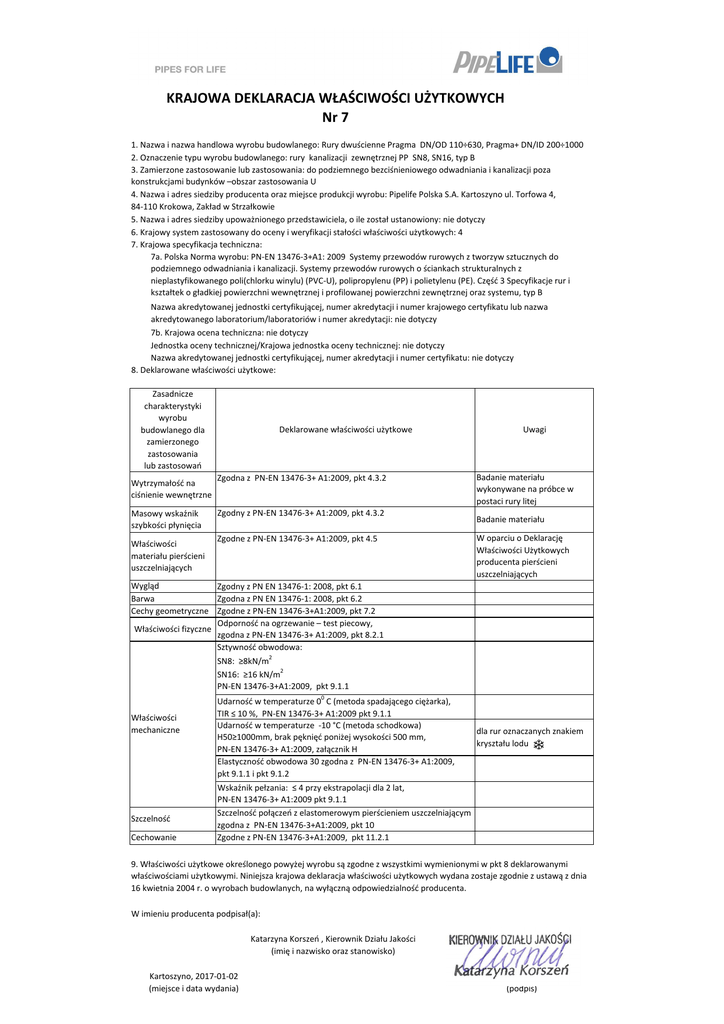 KRAJOWA DEKLARACJA WŁAŚCIWOŚCI UŻYTKOWYCH Nr 7 1. Nazwa i nazwa handlowa wyrobu budowlanego: Rury dwuścienne Pragma DN/OD 110÷630, Pragma+ DN/ID 200÷1000 2. Oznaczenie typu wyrobu budowlanego: rury kanalizacji zewnętrznej PP SN8, SN16, typ B 3. Zamierzone zastosowanie lub zastosowania: do podziemnego bezciśnieniowego odwadniania i kanalizacji poza konstrukcjami budynków –obszar zastosowania U 4. Nazwa i adres siedziby producenta oraz miejsce produkcji wyrobu: Pipelife Polska S.A. Kartoszyno ul. Torfowa 4, 84-110 Krokowa, Zakład w Strzałkowie 5. Nazwa i adres siedziby upoważnionego przedstawiciela, o ile został ustanowiony: nie dotyczy 6. Krajowy system zastosowany do oceny i weryfikacji stałości właściwości użytkowych: 4 7. Krajowa specyfikacja techniczna: 7a. Polska Norma wyrobu: PN-EN 13476-3+A1: 2009 Systemy przewodów rurowych z tworzyw sztucznych do podziemnego odwadniania i kanalizacji. Systemy przewodów rurowych o ściankach strukturalnych z nieplastyfikowanego poli(chlorku winylu) (PVC-U), polipropylenu (PP) i polietylenu (PE). Część 3 Specyfikacje rur i kształtek o gładkiej powierzchni wewnętrznej i profilowanej powierzchni zewnętrznej oraz systemu, typ B Nazwa akredytowanej jednostki certyfikującej, numer akredytacji i numer krajowego certyfikatu lub nazwa akredytowanego laboratorium/laboratoriów i numer akredytacji: nie dotyczy 7b. Krajowa ocena techniczna: nie dotyczy Jednostka oceny technicznej/Krajowa jednostka oceny technicznej: nie dotyczy Nazwa akredytowanej jednostki certyfikującej, numer akredytacji i numer certyfikatu: nie dotyczy 8. Deklarowane właściwości użytkowe: Zasadnicze charakterystyki wyrobu budowlanego dla zamierzonego zastosowania lub zastosowań Wytrzymałość na ciśnienie wewnętrzne Masowy wskaźnik szybkości płynięcia Właściwości materiału pierścieni uszczelniających Deklarowane właściwości użytkowe Zgodna z PN-EN 13476-3+ A1:2009, pkt 4.3.2 Zgodny z PN-EN 13476-3+ A1:2009, pkt 4.3.2 Zgodne z PN-EN 13476-3+ A1:2009, pkt 4.5 Uwagi Badanie materiału wykonywane na próbce w postaci rury litej Badanie materiału W oparciu o Deklarację Właściwości Użytkowych producenta pierścieni uszczelniających Wygląd Zgodny z PN EN 13476-1: 2008, pkt 6.1 Barwa Zgodna z PN EN 13476-1: 2008, pkt 6.2 Cechy geometryczne Zgodne z PN-EN 13476-3+A1:2009, pkt 7.2 Odporność na ogrzewanie – test piecowy, Właściwości fizyczne zgodna z PN-EN 13476-3+ A1:2009, pkt 8.2.1 Sztywność obwodowa: SN8: ≥8kN/m2 SN16: ≥16 kN/m2 PN-EN 13476-3+A1:2009, pkt 9.1.1 Właściwości mechaniczne Szczelność Cechowanie Udarność w temperaturze 00 C (metoda spadającego ciężarka), TIR ≤ 10 %, PN-EN 13476-3+ A1:2009 pkt 9.1.1 Udarność w temperaturze -10 °C (metoda schodkowa) H50≥1000mm, brak pęknięć poniżej wysokości 500 mm, PN-EN 13476-3+ A1:2009, załącznik H Elastyczność obwodowa 30 zgodna z PN-EN 13476-3+ A1:2009, pkt 9.1.1 i pkt 9.1.2 dla rur oznaczanych znakiem kryształu lodu Wskaźnik pełzania: ≤ 4 przy ekstrapolacji dla 2 lat, PN-EN 13476-3+ A1:2009 pkt 9.1.1 Szczelność połączeń z elastomerowym pierścieniem uszczelniającym zgodna z PN-EN 13476-3+A1:2009, pkt 10 Zgodne z PN-EN 13476-3+A1:2009, pkt 11.2.1 9. Właściwości użytkowe określonego powyżej wyrobu są zgodne z wszystkimi wymienionymi w pkt 8 deklarowanymi właściwościami użytkowymi. Niniejsza krajowa deklaracja właściwości użytkowych wydana zostaje zgodnie z ustawą z dnia 16 kwietnia 2004 r. o wyrobach budowlanych, na wyłączną odpowiedzialność producenta. W imieniu producenta podpisał(a): Katarzyna Korszeń , Kierownik Działu Jakości (imię i nazwisko oraz stanowisko) Kartoszyno, 2017-01-02 (miejsce i data wydania) (podpis) KRAJOWA DEKLARACJA WŁAŚCIWOŚCI UŻYTKOWYCH Nr 8 1. Nazwa i nazwa handlowa wyrobu budowlanego: Rury o ściankach strukturalnych dwuwarstwowych z polipropylenu Pragma DN/OD 110÷630, Pragma+ DN/ID 200÷1000 2. Oznaczenie typu wyrobu budowlanego: rury PP SN2÷ SN16 3. Zamierzone zastosowanie lub zastosowania: jako osłony dla innych rur i przewodów oraz jako przepusty 4. Nazwa i adres siedziby producenta oraz miejsce produkcji wyrobu: Pipelife Polska S.A. Kartoszyno ul. Torfowa 4, 84-110 Krokowa, Zakład w Strzałkowie 5. Nazwa i adres siedziby upoważnionego przedstawiciela, o ile został ustanowiony: nie dotyczy 6. Krajowy system zastosowany do oceny i weryfikacji stałości właściwości użytkowych: 4 7. Krajowa specyfikacja techniczna: 7a. Polska Norma wyrobu: nie dotyczy Nazwa akredytowanej jednostki certyfikującej, numer akredytacji i numer krajowego certyfikatu lub nazwa akredytowanego laboratorium/laboratoriów i numer akredytacji: nie dotyczy 7b. Krajowa ocena techniczna: AT/2008-03-0506/2 z 1998 r. Rury i kształtki z polipropylenu (PP) do sieci drenażowej, osłony przewodów i kabli oraz przepustów drogowych. Jednostka oceny technicznej/Krajowa jednostka oceny technicznej: Instytut Badawczy Dróg i Mostów Nazwa akredytowanej jednostki certyfikującej, numer akredytacji i numer certyfikatu: nie dotyczy 8. Deklarowane właściwości użytkowe: Zasadnicze charakterystyki wyrobu budowlanego dla Deklarowane właściwości użytkowe zamierzonego zastosowania lub zastosowań Masowy wskaźnik Zgodny z AT/2008-03-0506/2 pkt.4 szybkości płynięcia Wytrzymałość na ciśnienie wewnętrzne bez uszkodzeń, zgodna z AT/2008-03-0506/2 pkt.4 Czas indukcji utleniania (OIT) Właściwości materiału pierścieni uszczelniających Zgodny z AT/2008-03-0506/2 pkt.4 Zgodne z AT/2008-03-0506/2 pkt.4 Uwagi Badanie materiału Badanie materiału wykonywane na próbce w postaci rury litej Badanie materiału W oparciu o Deklarację Właściwości Użytkowych producenta pierścieni uszczelniających Wygląd Barwa Zgodny z AT/2008-03-0506/2 pkt.4 Zgodna z AT/2008-03-0506/2 pkt.4 Cechy geometryczne Zgodne z AT/2008-03-0506/2 pkt.4 Odporność na uderzenie metodą spadającego ciężarka TIR ≤10%, AT/2008-03-