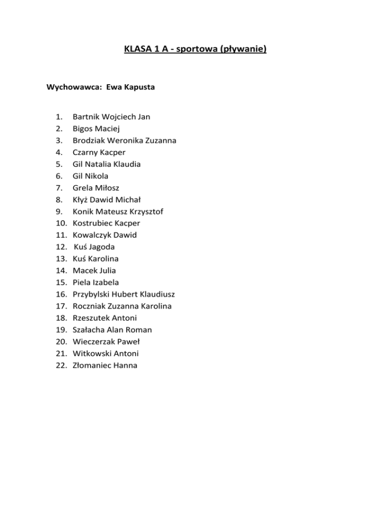 KLASA 1 A - sportowa (pływanie) Wychowawca: Ewa Kapusta 1. 2. 3. 4. 5. 6. 7. 8. 9. 10. 11. 12. 13. 14. 15. 16. 17. 18. 19. 20. 21. 22. Bartnik Wojciech Jan Bigos Maciej Brodziak Weronika Zuzanna Czarny Kacper Gil Natalia Klaudia Gil Nikola Grela Miłosz Kłyż Dawid Michał Konik Mateusz Krzysztof Kostrubiec Kacper Kowalczyk Dawid Kuś Jagoda Kuś Karolina Macek Julia Piela Izabela Przybylski Hubert Klaudiusz Roczniak Zuzanna Karolina Rzeszutek Antoni Szałacha Alan Roman Wieczerzak Paweł Witkowski Antoni Złomaniec Hanna KLASA 1 B - sportowa (pływanie) Wychowawca: Elżbieta Bryk 1. 2. 3. 4. 5. 6. 7. 8. 9. 10. 11. 12. 13. 14. 15. 16. 17. 18. 19. 20. 21. 22. 23. 24. 25. Balczyński Alan Dudziak Michał Gajak Karolina Gawron Martyna Janiuk Nikola Jurczyszyn Emilia Joanna Karpiński Karol Kawałko Mateusz Klus Gabriela Koniec Weronika Konik Daniel Tomasz Kossowska Gabriela Agnieszka Koza Julia Krasowska Kaja Maria Krztoń Iga Lechowicz Aleksandra Lechowicz Kacper Gabriel Matyjasek Filip Milczuk Krzysztof Palejewski Michał Różański Mateusz Wilczek Maciej Wilk Natalia Wiktoria Wróbel Alan Zychowicz Kacper KLASA 1 C Wychowawca: Anna Szuwara 1. 2. 3. 4. 5. 6. 7. 8. 9. 10. 11. 12. 13. 14. 15. 16. 17. 18. 19. 20. Bida Oliwia Bratkiewicz Tymoteusz Buczko Stanisław Dmitroca Kamila Gawron Martyna Łucja Harasim Ernest Jewuła Nikodem Juś Szymon Kwaśniak Krzysztof Łaśko Mikołaj Makowski Bartłomiej Maślona Maja Podgórny Michał Puchacz Julia Remiszewska Nadia Schab Małgorzata Stasiuk Maja Stefaniak Patryk Szewczuk Agata Ząbczyk Sebastian KLASA 1 D Wychowawca: Marta Lepa 1. 2. 3. 4. 5. 6. 7. 8. 9. 10. 11. 12. 13. 14. 15. 16. 17. 18. 19. 20. Antoszek Marcel Babicz Daria Biały Krystian Bochniak Olaf Bucior Magdalena Joniec Zofia Kiersztyn Szymon Kita Martyna Koza Amelia Kudełko Damian Kuśnierz Julia Luda Paulina Marć Miłosz Nizioł Zuzanna Orzeł Gabriela Piłat Julia Suchodolski Marcel Suseł Kamil Winiarska Wiktoria Zielińska Zofia KLASA 1 E Wychowawca: Anna Kurzempa 1. 2. 3. 4. 5. 6. 7. 8. 9. 10. 11. 12. 13. 14. 15. 16. 17. 18. 19. 20. 21. 22. Albingier Jakub Albingier Kacper Dudek Julia Dudek Martyna Hefner Piotr Hojda Aleksandra Huk Gabriela Maria Karwan Adam Klim Amelia Lipski Damian Mielniczuk Maja Niemczuk Adrian Niemczuk Sandra Ponahajba Bartłomiej Rasiak Ksawery Rycaj Sebastian Strzałkowska Julia Szkiryniec Kamila Trojanowska Diana Węcławik Oliwier Wojciechowski Tomasz Łukasz Zarzycki Oskar Oliwier KLASA 4 A – sportowa (pływanie) Wychowawca: Anna Iwan 1. 2. 3. 4. 5. 6. 7. 8. 9. 10. 11. 12. 13. 14. 15. 16. 17. 18. 19. 20. 21. 22. 23. 24. 25. Biały Maciej Bogdanowicz Gabriel Buryła Dominika Dworzycka Julia Dzińkowski Dawid Gałaszkiewicz Martyna Gawłowski Nikodem Gołębiowski Bartłomiej Hojda Patrycja Jasina Paweł Jewuła Samanta Klimek Kacper Łagowski Dawid Nowak Michał Pieńkosz Kamil Pietrzniak Natalia Segieda Martyna Szewczak Oliwia Szewczyk Ewa Szlendak Dawid Teterycz Sylwia Typiak Michał Widomska Aleksandra Witkowski Krzysztof Wójcik Jakub KLASA 4 B Wychowawca: Violetta Lachowicz 1. 2. 3. 4. 5. 6. 7. 8. 9. 10. 11. 12. 13. 14. 15. 16. 17. 18. 19. 20. 21. Chrzan Julia Ciuraszkiewicz Aleksandra Czerniawska Izabela Gontarz Maciej Kitka Ernest Kominek Jakub Łój Amelia Malczenko Szymon Mazurek Patrycja Ogórek Patryk Paszczuk Sandra Pędzierska Amelia Pilipczuk Kacper Sałamacha Filip Sasyn Oliwier Sokołowski Mateusz Sroczyński Kamil Staniecki Mateusz Stępniak Kacper Szaniawska Oliwia Witko Gabriel KLASA 4 C Wychowawca: Aneta Rudy 1. 2. 3. 4. 5. 6. 7. 8. 9. 10. 11. 12. 13. 14. 15. 16. 17. 18. 19. 20. Bakuła Ewa Brodziak Kacper Bucior Karina Dyrkacz Adam Dzieńkowski Wojciech Gleń Dawid Haczyk Aleksandra Moszczyńska Zuzanna Najda Milena Paluch Martyna Pałczyńska Olga Piasecki Mateusz Pikuziński Eryk Podgórny Maciej Przyczyna Mikołaj Różańska Klaudia Sobczuk Paulina Soczyński Igor Szostakiewicz Rafał Teterycz Jakub
