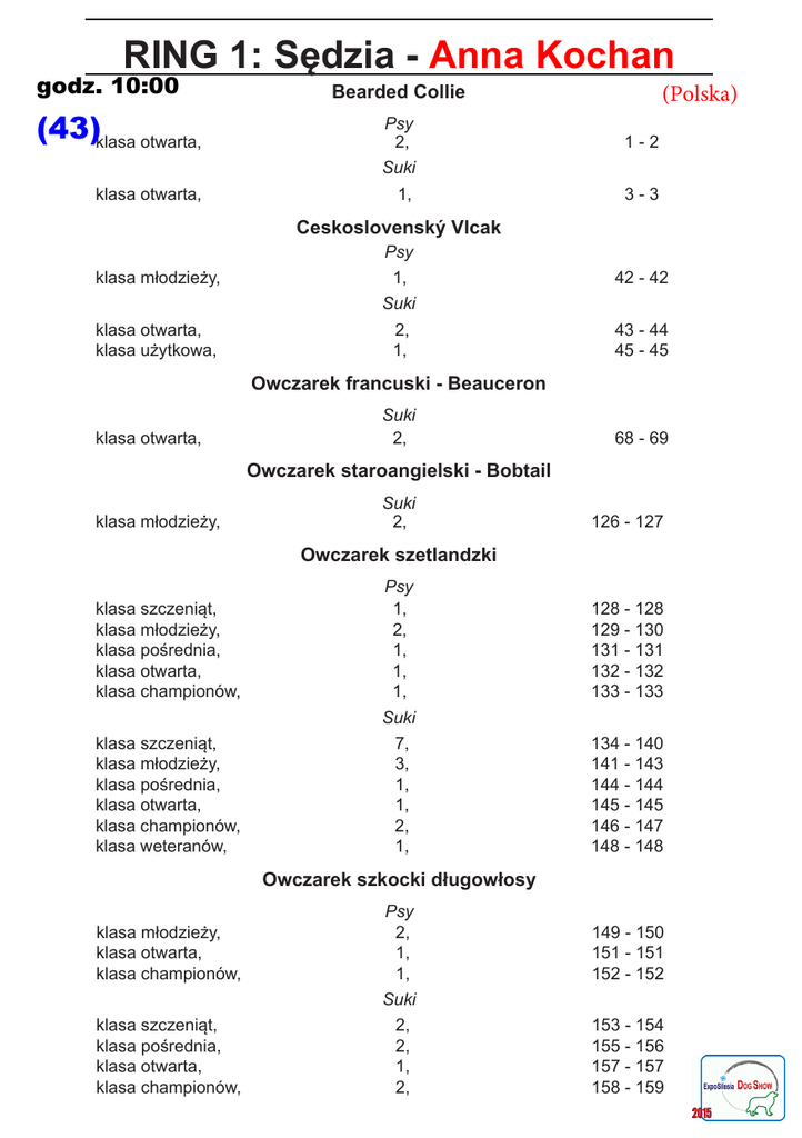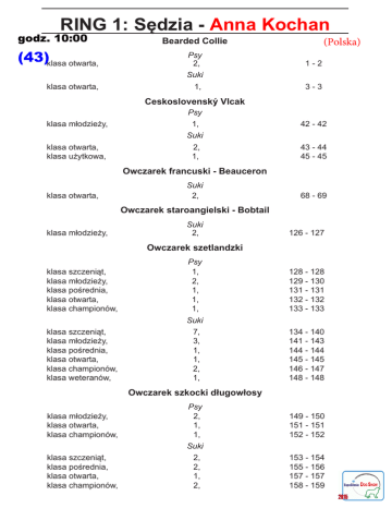 RING 1: Sędzia - Anna Kochan godz. 10:00 (43)klasa otwarta, (Polska) Bearded Collie Psy 2, 1-2 Suki klasa otwarta, 1, 3-3 Ceskoslovenský Vlcak Psy klasa młodzieży, 1, 42 - 42 Suki klasa otwarta, klasa użytkowa, 2, 1, 43 - 44 45 - 45 Owczarek francuski - Beauceron klasa otwarta, Suki 2, 68 - 69 Owczarek staroangielski - Bobtail klasa młodzieży, Suki 2, 126 - 127 Owczarek szetlandzki klasa szczeniąt, klasa młodzieży, klasa pośrednia, klasa otwarta, klasa championów, Psy 1, 2, 1, 1, 1, 128 - 128 129 - 130 131 - 131 132 - 132 133 - 133 Suki klasa szczeniąt, klasa młodzieży, klasa pośrednia, klasa otwarta, klasa championów, klasa weteranów, 7, 3, 1, 1, 2, 1, 134 - 140 141 - 143 144 - 144 145 - 145 146 - 147 148 - 148 Owczarek szkocki długowłosy klasa młodzieży, klasa otwarta, klasa championów, Psy 2, 1, 1, 149 - 150 151 - 151 152 - 152 Suki klasa szczeniąt, klasa pośrednia, klasa otwarta, klasa championów, 2, 2, 1, 2, 153 - 154 155 - 156 157 - 157 158 - 159 RING 2: Sędzia - Jan Gajewski (Polska) godz. 10:00 (61) Polski Owczarek podhalański Psy klasa szczeniąt, klasa młodzieży, klasa otwarta, klasa weteranów, 1, 2, 2, 1, 172 - 172 173 - 174 175 - 176 177 - 177 Suki klasa szczeniąt, klasa młodzieży, klasa pośrednia, 3, 2, 1, 178 - 180 181 - 182 183 - 183 Biały owczarek szwajcarski Psy klasa młodszych szczeniąt, klasa szczeniąt, klasa młodzieży, klasa pośrednia, 1, 1, 1, 2, 5-5 6-6 7-7 8-9 Suki klasa młodszych szczeniąt, klasa szczeniąt, klasa młodzieży, klasa pośrednia, klasa otwarta, 1, 2, 1, 1, 2, 10 - 10 11 - 12 13 - 13 14 - 14 15 - 16 Border Collie Psy klasa młodszych szczeniąt, klasa szczeniąt, klasa młodzieży, klasa pośrednia, klasa otwarta, klasa championów, klasa weteranów, 1, 1, 4, 2, 1, 1, 1, 17 - 17 18 - 18 19 - 22 23 - 24 25 - 25 26 - 26 27 - 27 Suki klasa szczeniąt, klasa młodzieży, klasa pośrednia, klasa otwarta, klasa championów, 1, 4, 5, 3, 28 - 28 29 - 32 33 - 37 38 - 40 41 - 41 RING 2 2 Polski owczarek nizinny Psy klasa otwarta, klasa championów, klasa weteranów, 1, 2, 3, 160 - 160 161 - 162 163 - 165 Suki klasa szczeniąt, klasa młodzieży, klasa pośrednia, klasa otwarta, 2, 2, 1, 1, 166 - 167 168 - 169 170 - 170 171 - 171 Schapendoes Suki klasa championów, 1, 187 - 187 RING 3: Sędzia - Grzegorz Robak (Polska) godz. 10:00 (59) Owczarek belgijski - Malinois Psy klasa otwarta, 1, 65 - 65 Suki klasa otwarta, 1, 66 - 66 Owczarek belgijski Tervueren Psy klasa szczeniąt, 1, 67 - 67 Owczarek francuski - Briard Psy klasa szczeniąt, klasa młodzieży, klasa pośrednia, klasa otwarta, 2, 2, 2, 1, 70 - 71 72 - 73 74 - 75 76 - 76 Suki klasa młodszych szczeniąt, klasa szczeniąt, klasa pośrednia, klasa otwarta, klasa użytkowa, klasa championów, 1, 1, 2, 3, 1, 2, 77 - 77 78 - 78 79 - 80 81 - 83 84 - 84 85 - 86 Owczarek holenderski krótkowłosy Suki klasa pośrednia, 1, 87 - 87 Puli biały Psy klasa młodzieży, 1, 184 - 184 Puli kolorowy Suki klasa pośrednia, klasa otwarta, 1, 1, 185 - 185 186 - 186 RING 3 Welsh Corgi Cardigan Psy 2 klasa młodszych szczeniąt, klasa szczeniąt, 1, 1, 188 - 188 189 - 189 Suki klasa młodzieży, klasa pośrednia, klasa otwarta, klasa championów, 1, 1, 1, 1, 190 - 190 191 - 191 192 - 192 193 - 193 Welsh Corgi Pembroke Psy klasa młodzieży, klasa pośrednia, 1, 1, 194 - 194 195 - 195 Suki klasa młodszych szczeniąt, klasa młodzieży, klasa pośrednia, klasa otwarta, klasa championów, 2, 2, 2, 1, 1, 196 - 197 198 - 199 200 - 201 202 - 202 203 - 203 Bergamasco Psy klasa pośrednia, 1, 4-4 Ciobanesc Romanesc Mioritic Psy klasa otwarta, 1, 46 - 46 Suki klasa szczeniąt, klasa championów, 1, 1, 47 - 47 48 - 48 Owczarek australijski (typ amerykański) Psy klasa szczeniąt, klasa młodzieży, klasa pośrednia, klasa championów, klasa weteranów, 1, 1, 2, 1, 1, 49 - 49 50 - 50 51 - 52 53 - 53 54 - 54 Suki klasa młodszych szczeniąt, klasa szczeniąt, klasa młodzieży, klasa pośrednia, klasa otwarta, klasa championów, 1, 2, 3, 2, 1, 1, 55 - 55 56 - 57 58 - 60 61 - 62 63 - 63 64 - 64 RING 4: Sędzia - Małgorzata Hałas godz. 10:00 Czarny terier (71) (Polska) Psy klasa młodszych szczeniąt, klasa szczeniąt, klasa pośrednia, klasa otwarta, klasa championów, 1, 1, 4, 2, 1, 332 - 332 333 - 333 334 - 337 338 - 339 340 - 340 Suki klasa młodszych szczeniąt, klasa szczeniąt, klasa młodzieży, klasa pośrednia, klasa otwarta, klasa championów, 1, 1, 1, 3, 1, 1, 341 - 341 342 - 342 343 - 343 344 - 346 347 - 347 348 - 348 Pinczer miniaturowy Psy klasa młodzieży, klasa pośrednia, 2, 1, 490 - 491 492 - 492 Suki klasa otwarta, klasa championów, 1, 1, 493 - 493 494 - 494 Pinczer średni Psy klasa pośrednia, 2, 495 - 496 Suki klasa szczeniąt, klasa pośrednia, 1, 1, 497 - 497 498 - 498 Sznaucer miniaturowy biały Psy klasa championów, 1, 520 - 520 Sznaucer miniaturowy czarno-srebrny Psy klasa młodzieży, klasa otwarta, 1, 1, 521 - 521 522 - 522 Suki klasa młodzieży, klasa pośrednia, klasa otwarta, 1, 3, 3, 523 - 523 524 - 526 527 - 529 RING 4 2 klasa młodzieży, klasa pośrednia, klasa otwarta, Sznaucer miniaturowy czarny Psy 1, 1, 1, 530 - 530 531 - 531 532 - 532 Suki klasa młodzieży, klasa pośrednia, klasa otwarta, klasa championów, 1, 1, 1, 1, 533 - 533 534 - 534 535 - 535 536 - 536 Sznaucer miniaturowy pieprz i sól Psy klasa szczeniąt, klasa młodzieży, klasa pośrednia, klasa weteranów, 1, 1, 1, 1, 537 - 537 538 - 538 539 - 539 540 - 540 Suki klasa młodzieży, klasa otwarta, klasa championów, 4, 1, 2, 541 - 544 545 - 545 546 - 547 Sznaucer olbrzym czarny Psy klasa młodzieży, klasa otwarta, 1, 1, 548 - 548 549 - 549 Suki klasa szczeniąt, klasa pośrednia, klasa otwarta, 1, 2, 1, 550 - 550 551 - 552 553 - 553 Sznaucer średni czarny Suki klasa młodzieży, klasa pośrednia, klasa otwarta, klasa championów, 2, 1, 2, 1, 554 - 555 556 - 556 557 - 558 559 - 559 Sznaucer średni pieprz i sól Psy klasa szczeniąt, klasa młodzieży, klasa pośrednia, klasa otwarta,