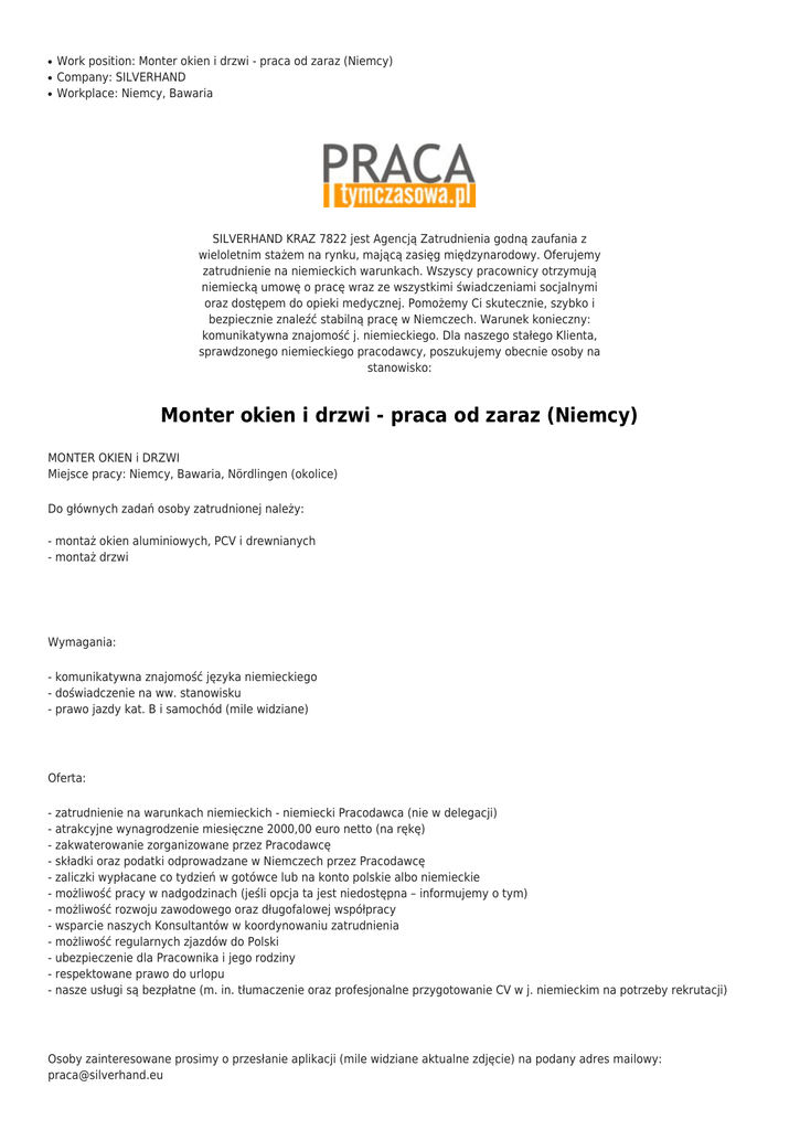 ● ● ● Work position: Monter okien i drzwi - praca od zaraz (Niemcy) Company: SILVERHAND Workplace: Niemcy, Bawaria SILVERHAND KRAZ 7822 jest Agencją Zatrudnienia godną zaufania z wieloletnim stażem na rynku, mającą zasięg międzynarodowy. Oferujemy zatrudnienie na niemieckich warunkach. Wszyscy pracownicy otrzymują niemiecką umowę o pracę wraz ze wszystkimi świadczeniami socjalnymi oraz dostępem do opieki medycznej. Pomożemy Ci skutecznie, szybko i bezpiecznie znaleźć stabilną pracę w Niemczech. Warunek konieczny: komunikatywna znajomość j. niemieckiego. Dla naszego stałego Klienta, sprawdzonego niemieckiego pracodawcy, poszukujemy obecnie osoby na stanowisko: Monter okien i drzwi - praca od zaraz (Niemcy) MONTER OKIEN i DRZWI Miejsce pracy: Niemcy, Bawaria, Nördlingen (okolice) Do głównych zadań osoby zatrudnionej należy: - montaż okien aluminiowych, PCV i drewnianych - montaż drzwi Wymagania: - komunikatywna znajomość języka niemieckiego - doświadczenie na ww. stanowisku - prawo jazdy kat. B i samochód (mile widziane) Oferta: - zatrudnienie na warunkach niemieckich - niemiecki Pracodawca (nie w delegacji) - atrakcyjne wynagrodzenie miesięczne 2000,00 euro netto (na rękę) - zakwaterowanie zorganizowane przez Pracodawcę - składki oraz podatki odprowadzane w Niemczech przez Pracodawcę - zaliczki wypłacane co tydzień w gotówce lub na konto polskie albo niemieckie - możliwość pracy w nadgodzinach (jeśli opcja ta jest niedostępna – informujemy o tym) - możliwość rozwoju zawodowego oraz długofalowej współpracy - wsparcie naszych Konsultantów w koordynowaniu zatrudnienia - możliwość regularnych zjazdów do Polski - ubezpieczenie dla Pracownika i jego rodziny - respektowane prawo do urlopu - nasze usługi są bezpłatne (m. in. tłumaczenie oraz profesjonalne przygotowanie CV w j. niemieckim na potrzeby rekrutacji) Osoby zainteresowane prosimy o przesłanie aplikacji (mile widziane aktualne zdjęcie) na podany adres mailowy: [email protected] w temacie wpisując nazwę stanowiska oraz numer referencyjny: SP/211/566 Prosimy o dołączenie klauzuli: Wyrażam zgodę na przetwarzanie moich danych osobowych zawartych w ofercie pracy dla potrzeb procesu rekrutacji zgodnie z ustawą z dnia 29.08.1997 r. o Ochronie Danych Osobowych, tekst jednolity: Dz. U. z 2002 r., Nr 101, poz. 926 z późn. zm. Kontaktujemy się telefonicznie wyłącznie z wybranymi kandydatami. Jesteśmy do Państwa dyspozycji pod poniższym numerem telefonu: 539-601-600 AKTUALNE OFERTY PRACY: silverhand.eu Facebook: facebook.com/praca.silverhand Zapraszamy również na: silverhand.eu/blog Kurs języka online: Helga czyta! Usługa dodatkowa: Od 20 lat świadczymy również usługi w zakresie rozliczeń podatków niemieckich oraz holenderskich, a także Kindergeld. Zadzwoń i dowiedz się więcej! SILVERHAND Dominik Matczak - bezpieczne i satysfakcjonujące zatrudnienie za granicą (KRAZ 7822). Aplikuj Dane kontaktowe: SILVERHAND Send Save Print Tweet