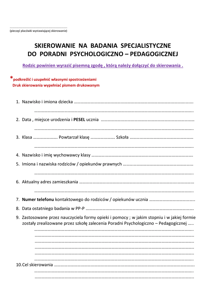 …………………………………………………………………….. (pieczęć placówki wystawiającej skierowanie) SKIEROWANIE NA BADANIA SPECJALISTYCZNE DO PORADNI PSYCHOLOGICZNO – PEDAGOGICZNEJ Rodzic powinien wyrazić pisemną zgodę , którą należy dołączyć do skierowania . *podkreślić i uzupełnić własnymi spostrzeżeniami Druk skierowania wypełniać pismem drukowanym 1. Nazwisko i imiona dziecka ……………………………………………………………………………………….……. …………………………………………………………………………………………………………………………….. 2. Data , miejsce urodzenia i PESEL ucznia ………………………………………………………………………… …………………………………………………………………………………………………………………………….. 3. Klasa …………………. Powtarzał klasę …………………. Szkoła ………………………………………………… …………………………………………………………………………………………………………………………….. 4. Nazwisko i imię wychowawcy klasy ………………………………………………………………………………. 5. Imiona i nazwiska rodziców / opiekunów prawnych ……………………………………………………… …………………………………………………………………………………………………………………………….. 6. Aktualny adres zamieszkania …………………………………………………………………………….…………… …………………………………………………………………………………………………………………………….. 7. Numer telefonu kontaktowego do rodziców / opiekunów ucznia ………………………………….. 8. Data ostatniego badania w PP-P ……………………………………………………………………………………. 9. Zastosowane przez nauczyciela formy opieki i pomocy ; w jakim stopniu i w jakiej formie zostały zrealizowane przez szkołę zalecenia Poradni Psychologiczno – Pedagogicznej ….. …………………………………………………………………………………………………………………………….. …………………………………………………………………………………………………………………………….. …………………………………………………………………………………………………………………………….. …………………………………………………………………………………………………………………………….. …………………………………………………………………………………………………………………………….. …………………………………………………………………………………………………………………………….. 10. Cel skierowania ………………………………………………………………………………..……………………………. …………………………………………………………………………………………………………………………….. …………………………………………………………………………………………………………………………….. …………………………………………………………………………………………………………………………….. …………………………………………………………………………………………………………………………….. …………………………………………………………………………………………………………………………….. …………………………………………………………………………………………………………………………….. 11. Aktualne trudności w nauce ( jakich szczegółowo przedmiotów dotyczą i w jakim zakresie ? ) ………………………………………………………………………………………………………..…………… …………………………………………………………………………………………………………………………….. …………………………………………………………………………………………………………………………….. …………………………………………………………………………………………………………………………….. …………………………………………………………………………………………………………………………….. …………………………………………………………………………………………………………………………….. …………………………………………………………………………………………………………………………….. …………………………………………………………………………………………………………………………….. …………………………………………………………………………………………………………………………….. …………………………………………………………………………………………………………………………….. …………………………………………………………………………………………………………………………….. ………………………………………………………………………………………………………
