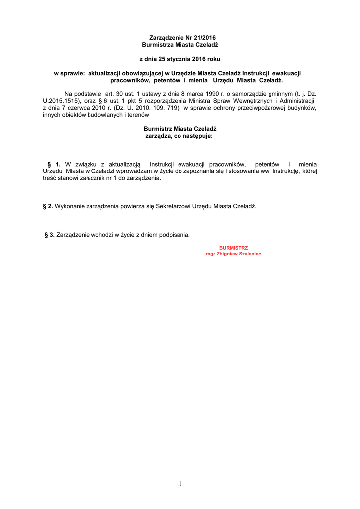 Zarządzenie Nr 21/2016 Burmistrza Miasta Czeladź z dnia 25 stycznia 2016 roku w sprawie: aktualizacji obowiązującej w Urzędzie Miasta Czeladź Instrukcji ewakuacji pracowników, petentów i mienia Urzędu Miasta Czeladź. Na podstawie art. 30 ust. 1 ustawy z dnia 8 marca 1990 r. o samorządzie gminnym (t. j. Dz. U.2015.1515), oraz § 6 ust. 1 pkt 5 rozporządzenia Ministra Spraw Wewnętrznych i Administracji z dnia 7 czerwca 2010 r. (Dz. U. 2010. 109. 719) w sprawie ochrony przeciwpożarowej budynków, innych obiektów budowlanych i terenów Burmistrz Miasta Czeladź zarządza, co następuje: § 1. W związku z aktualizacją Instrukcji ewakuacji pracowników, petentów i mienia Urzędu Miasta w Czeladzi wprowadzam w życie do zapoznania się i stosowania ww. Instrukcję, której treść stanowi załącznik nr 1 do zarządzenia. § 2. Wykonanie zarządzenia powierza się Sekretarzowi Urzędu Miasta Czeladź. § 3. Zarządzenie wchodzi w życie z dniem podpisania. BURMISTRZ mgr Zbigniew Szaleniec 1 Załącznik Nr 1 do Zarządzenia Nr 21/2016 Burmistrza Miasta Czeladź z dnia 25 stycznia 2016r. INSTRUKCJA EWAKUACJI PRACOWNIKÓW, PETENTÓW I MIENIA URZĘDU MIASTA w CZELADZI Podstawy Uruchomienia Instrukcji • • • • Pożar (kiedy nieskuteczna jest likwidacja pożaru podręcznymi środkami gaśniczymi). Zamach terrorystyczny (otrzymanie informacji o podłożeniu ładunku wybuchowego lub innego środka niebezpiecznego). Zagrożenia katastrofą budowlaną. Zagrożenia skażenia środkiem biologiczno – chemicznym. SPOSÓB OGŁOSZENIA ALARMU 1. Alarmowanie o zagrożeniach w budynku Urzędu Miasta odbywa się w ramach wewnętrznego systemu alarmowania: telefonicznie, syrena alarmowa lub głosem. 2. W każdym wypadku zagrożenia wymagającego ewakuacji przez Dyżurnego Służby Stałego Dyżuru uruchomiona zostanie ręczna syrena alarmowa, 3. Ewakuację należy prowadzić w sposób zorganizowany, kierując się ustaleniami procedury i aktualnie zaistniałą sytuacją, 4. W razie potrzeby komunikat o ewakuacji powinien być również słownie doprowadzony do wszystkich osób znajdujący się na terenie budynku urzędu Treść komunikatu : „UWAGA- ALARM POŻAROWY, Proszę o opuszczenie pomieszczeń i wyjście z budynku i udanie się do ( miejsce wyznaczone)” Kolejność powiadamiania o zagrożeniu(alarmie) w godzinach funkcjonowania urzędu 1. DYŻURNY STRAŻY MIEJSKIEJ bezzwłocznie powiadamia Burmistrza, który podejmuje decyzję o zakresie ewakuacji (w razie nieobecności zastępcę) oraz Sekretarza Miasta. – wykaz telefonów załącznik nr 1 2. Burmistrz, Sekretarz Miasta podejmując decyzje o ewakuacji nakazuje telefonicznie naczelnikom wydziałów przeprowadzenie ewakuacji 3. Dyżurny SSD uruchamia ręczną syrenę alarmową, oraz powiadamia specjalistyczne służby ratownicze (PSP, pogotowie ratunkowe, policję, pogotowie gazowe, energetyczne bądź inne zależnie od zagrożenia) - wykaz telefonów załącznik nr 1 4. Dyżurny SSD drogą radiową wzywa patrole Straży Miejskiej o natychmiastowego przyjazdu do budynku urzędu w celu pomocy przy ewakuacji. 5. Dyżurny SSD wprowadza zakaz wejścia osób postronnych do budynku – z jego polecenia pracownik punktu informacyjnego nie wpuszcza interesantów do budynku. 6. Burmistrz, Sekretarz Miasta w razie potrzeby zarządza ewakuację samochodów parkujących w pobliżu budynku Urzędu 7. Naczelnik Wydziału Administracyjno- Gospodarczego przekazuje instrukcję bezpieczeństwa pożarowego dla Urzędu Miasta w Czeladzi, oraz informuje o zagrożeniu powstałym w pomieszczeniach jak również o dotychczas poczynionych krokach ratunkowych dowódcy zastępu ratowniczego, który przejmuje dowodzenie akcją ratowniczą 8. Naczelnik Wydziału Administracyjno- Gospodarczego prowadzi nadzór nad zabezpieczeniem instalacji gazowej, elektrycznej i wodnej, oraz otwarciem wyjść ewakuacyjnych. Kolejność powiadamiania o zagrożeniu (alarmie) po godzinach funkcjonowania urzędu 9. DYŻURNY STRAŻY MIEJSKIEJ - bezzwłocznie powiadamia Burmistrza, który podejmuje decyzję o zakresie ewakuacji (w razie nieobecności zastępcę) oraz Sekretarza Miasta. – wykaz telefonów załącznik nr 1 10. Dyżurny SSD drogą radiową wzywa patrole Straży Miejskiej do natychmiastowego przyjazdu do budynku urzędu w celu pomocy przy ewakuacji. 11. Dyżurny SSD uruchamia ręczną syrenę alarmową, oraz powiadamia specjalistyczne służby ratownicze (PSP, pogotowie ratunkowe, policję, pogotowie gazowe, energetyczne bądź inne zależnie od zagrożenia) - wykaz telefonów załącznik nr 1 12. Pracownicy obsługi, oraz inni podwykonawcy przeprowadzający prace zlecone na terenie budynku Urzędu zobowiązani są do stosowania instrukcji ewakuacji 13. Dyżurny SSD przekazuje instrukcję bezpieczeństwa pożarowego dla Urzędu Miasta w Czeladzi, oraz zagrożeniu powstałym w pomieszczeniach jak również informuje o dotychczas poczynionych krokach ratunkowych dowódcy zastępu ratowniczego, który przejmuje dowodzenie akcją ratowniczą FUNKCJONARIUSZE STRAŻY MIEJSKIEJ 1. Po otrzymaniu informacji od dyżurnego SSD bezzwłocznie przybywają do budynku Urzędu Miasta. 2. Nadzorują zakaz wejścia do budynku Urzędu. 3. W razie potrzeby pomagają w ewakuacji ludzi i mienia z Urzędu, a w szczególności dokumentacji – archiwa wydziałów USC, SO 4. Zabezpieczają miejsce deponowania ewakuowanego mienia. PRACOWNICY URZĘDU MIASTA 1. W przypadku powstania zagrożenia w pomieszczeniu w którym się znajdują, bądź otrzymania informacji dotyczącej zagrożenia od osób trzecich przekazują treść otrzymanego komunikatu dyżurnemu SSD, oraz bezpośredniemu przełożonemu. 2. Po ogłoszeniu alarmu udają się do wyznaczonego przez Burmistrza Miasta miejsca zbiórki zabierając ze sobą niezbędne dokumenty i mienie Miejsce zbiórki – Wyznaczone przez BURMISTRZA MIASTA dla pracowników i mienia Urzędu Miasta Hala MOSiR ul. Sportowa dla Kierownictwa Urzędu Miasta