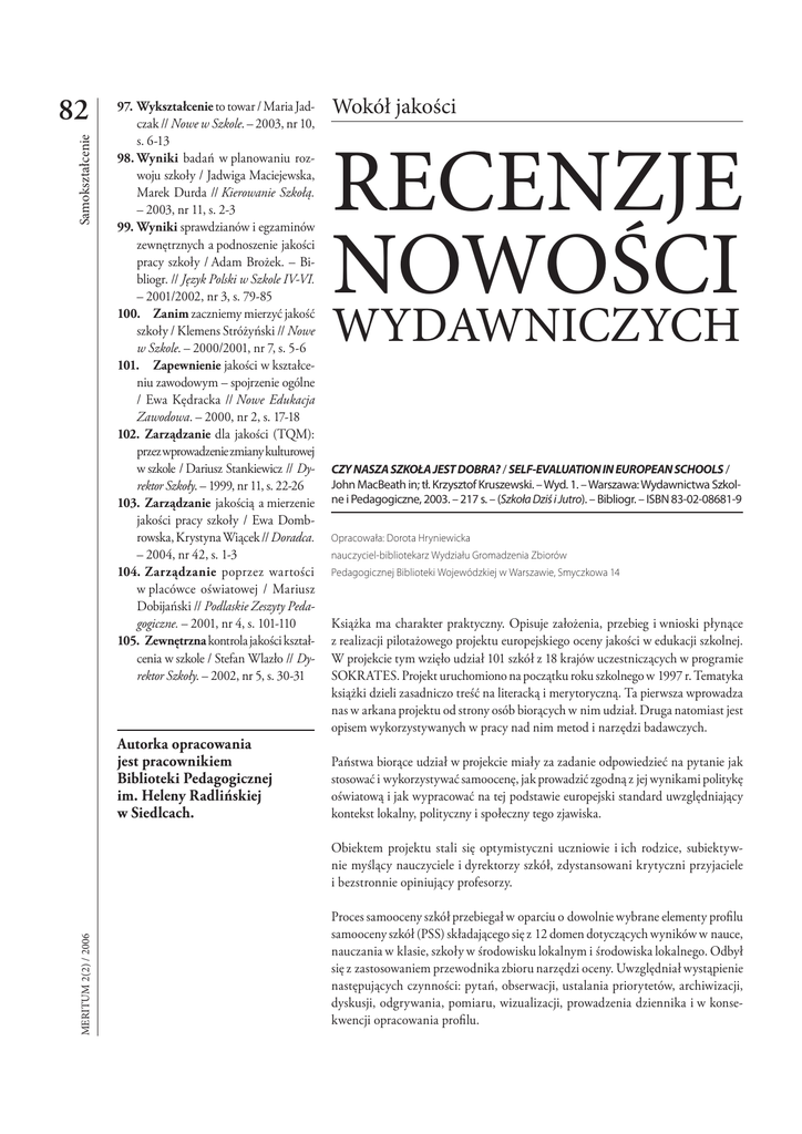 Samokształcenie 82 97. Wykształcenie to towar / Maria Jadczak // Nowe w Szkole. – 2003, nr 10, s. 6-13 98. Wyniki badań w planowaniu rozwoju szkoły / Jadwiga Maciejewska, Marek Durda // Kierowanie Szkołą. – 2003, nr 11, s. 2-3 99. Wyniki sprawdzianów i egzaminów zewnętrznych a podnoszenie jakości pracy szkoły / Adam Brożek. – Bibliogr. // Język Polski w Szkole IV-VI. – 2001/2002, nr 3, s. 79-85 100. Zanim zaczniemy mierzyć jakość szkoły / Klemens Stróżyński // Nowe w Szkole. – 2000/2001, nr 7, s. 5-6 101. Zapewnienie jakości w kształceniu zawodowym – spojrzenie ogólne / Ewa Kędracka // Nowe Edukacja Zawodowa. – 2000, nr 2, s. 17-18 102. Zarządzanie dla jakości (TQM): przez wprowadzenie zmiany kulturowej w szkole / Dariusz Stankiewicz // Dyrektor Szkoły. – 1999, nr 11, s. 22-26 103. Zarządzanie jakością a mierzenie jakości pracy szkoły / Ewa Dombrowska, Krystyna Wiącek // Doradca. – 2004, nr 42, s. 1-3 104. Zarządzanie poprzez wartości w placówce oświatowej / Mariusz Dobijański // Podlaskie Zeszyty Pedagogiczne. – 2001, nr 4, s. 101-110 105. Zewnętrzna kontrola jakości kształcenia w szkole / Stefan Wlazło // Dyrektor Szkoły. – 2002, nr 5, s. 30-31 Autorka opracowania jest pracownikiem Biblioteki Pedagogicznej im. Heleny Radlińskiej w Siedlcach. Wokół jakości RECENZJE NOWOŚCI WYDAWNICZYCH CZY NASZA SZKOŁA JEST DOBRA? / SELF-EVALUATION IN EUROPEAN SCHOOLS / John MacBeath in; tł. Krzysztof Kruszewski. – Wyd. 1. – Warszawa: Wydawnictwa Szkolne i Pedagogiczne, 2003. – 217 s. – (Szkoła Dziś i Jutro). – Bibliogr. – ISBN 83-02-08681-9 Opracowała: Dorota Hryniewicka nauczyciel-bibliotekarz Wydziału Gromadzenia Zbiorów Pedagogicznej Biblioteki Wojewódzkiej w Warszawie, Smyczkowa 14 Książka ma charakter praktyczny. Opisuje założenia, przebieg i wnioski płynące z realizacji pilotażowego projektu europejskiego oceny jakości w edukacji szkolnej. W projekcie tym wzięło udział 101 szkół z 18 krajów uczestniczących w programie SOKRATES. Projekt uruchomiono na początku roku szkolnego w 1997 r. Tematyka książki dzieli zasadniczo treść na literacką i merytoryczną. Ta pierwsza wprowadza nas w arkana projektu od strony osób biorących w nim udział. Druga natomiast jest opisem wykorzystywanych w pracy nad nim metod i narzędzi badawczych. Państwa biorące udział w projekcie miały za zadanie odpowiedzieć na pytanie jak stosować i wykorzystywać samoocenę, jak prowadzić zgodną z jej wynikami politykę oświatową i jak wypracować na tej podstawie europejski standard uwzględniający kontekst lokalny, polityczny i społeczny tego zjawiska. MERITUM 2(2) / 2006 Obiektem projektu stali się optymistyczni uczniowie i ich rodzice, subiektywnie myślący nauczyciele i dyrektorzy szkół, zdystansowani krytyczni przyjaciele i bezstronnie opiniujący profesorzy. Proces samooceny szkół przebiegał w oparciu o dowolnie wybrane elementy profilu samooceny szkół (PSS) składającego się z 12 domen dotyczących wyników w nauce, nauczania w klasie, szkoły w środowisku lokalnym i środowiska lokalnego. Odbył się z zastosowaniem przewodnika zbioru narzędzi oceny. Uwzględniał wystąpienie następujących czynności: pytań, obserwacji, ustalania priorytetów, archiwizacji, dyskusji, odgrywania, pomiaru, wizualizacji, prowadzenia dziennika i w konsekwencji opracowania profilu. John Jay Bonstingl SZKOŁY JAKOŚCI: WPROWADZENIE DO TOTAL QUALITY MANAGEMENT W EDUKACJI / tł. Marta Umińska – Warszawa: Wydawnictwo CODN, 2002. – 98 s. – ISBN 83-85910-23-9 Opracowała: Joanna Kamińska Kierownik Wydziału Gromadzenia Zbiorów Pedagogicznej Biblioteki Wojewódzkiej w Warszawie, Smyczkowa 14 Autor publikacji jest międzynarodowym konsultantem i specjalistą do spraw łączenia idei i praktyki zasad Total Quality Management i ich zastosowanie w edukacji. W swojej książce rozważa przyczyny, dla których Amerykanie zarzucili stosowanie TQM, a następnie powrócili do jego zastosowania po tym, jak skutecznie wykorzystała go Japonia do wsparcia własnego rozwoju gospodarczego po klęsce wojennej. Autor opisał Czternaście Punktów, na których Deming oparł ruch Jakości Totalnej i odniósł je do sfery edukacji. Tym samym stworzył dla szkół i innych placówek oświatowych propozycję odejścia od nauczania i testowania na rzecz rozwinięcia procesów wspierających ciągłe doskonalenie się wszystkich osób zaangażowanych w pracę szkoły. Doskonalenie to, zdaniem autora, powinno objąć nie tylko personel pedagogiczny, dyrekcję szkoły oraz pozostałych jej pracowników, ale także uczniów, rodziców oraz przedsiębiorców i członków społeczności lokalnej. Proces wprowadzania Jakości Totalnej do szkół oparł Bonstingl na zaproponowanych w swej publikacji narzędziach, które mają wspomóc budowanie TQM w placówce edukacyjnej. Narzędzia te stanowią podstawowy warsztat roboczy, szczególnie dla dyrektorów i osób pełniących funkcje kierownicze, a co za tym idzie odpowiadają za proces budowania jakości. Książka Bonstingla będzie dla nich dużą pomocą i ukierunkowaniem w pracy. Opracowała: Marta Jasińska nauczyciel-biliotekarz Wydziału Opracowania Zbiorów Pedagogicznej Biblioteki Wojewódzkiej w Warszawie, Smyczkowa 14 83 Samokształcenie Serdecznie zachęcam do sięgnięcia po szczegóły przytoczonych przeze mnie wyżej problemów. Nauczyciele biorący udział w projekcie chwalili go za wartości świeżo nabyte – samowiedzę, odporność na ocenianie zewnętrzne, ogólny wzrost odpowiedzialności, poznanie różnych punktów widzenia, wzrost świadomości oceniania i samorefleksji. Uczestnicy projektu, na Konferencji Wiedeńskiej w listopadzie 1998 r. uzgodnili i podpisali Deklarację, która zawiera wnioski z realizacji projektu. David Tuohy DUSZA SZKOŁY. O TYM, CO SPRZYJA ZMIANIE I ROZWOJOWI / tł. Krzysztof Kruszewski – Warszawa: Wydawnictwo Naukowe PWN SA, 2002