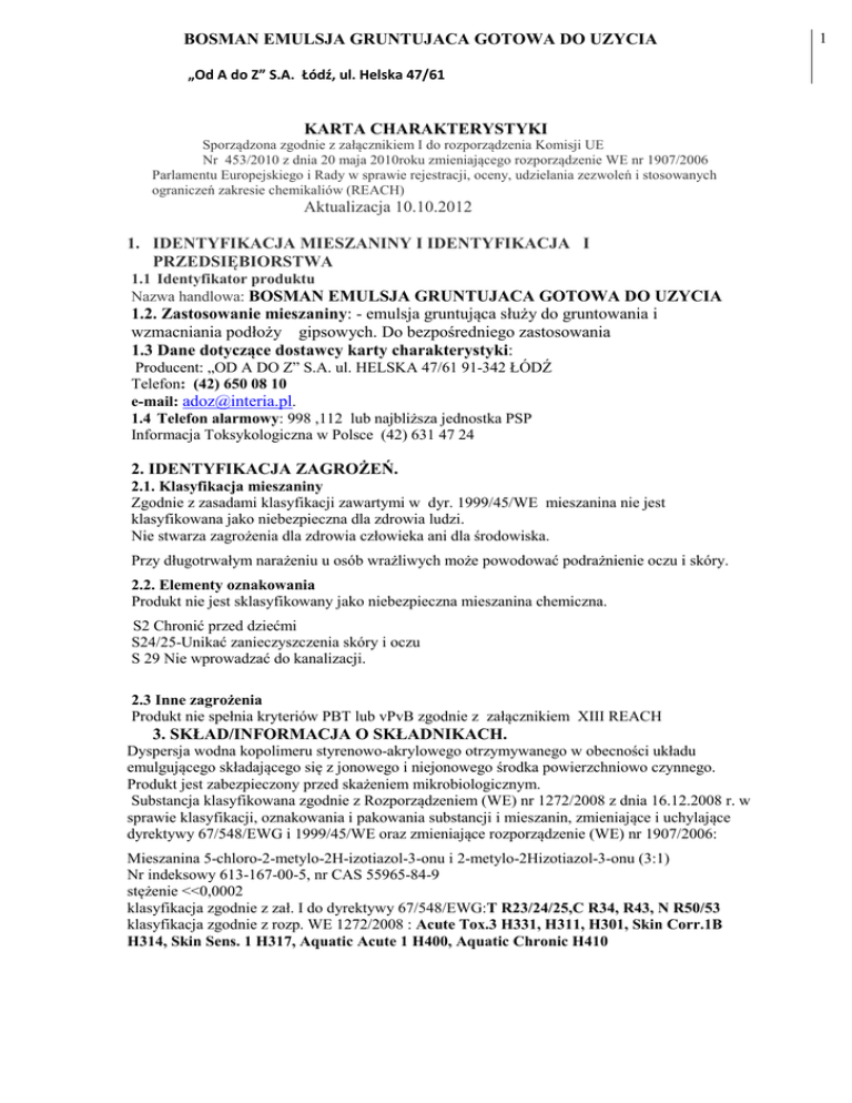BOSMAN EMULSJA GRUNTUJACA GOTOWA DO UZYCIA „Od A do Z” S.A. Łódź, ul. Helska 47/61 KARTA CHARAKTERYSTYKI Sporządzona zgodnie z załącznikiem I do rozporządzenia Komisji UE Nr 453/2010 z dnia 20 maja 2010roku zmieniającego rozporządzenie WE nr 1907/2006 Parlamentu Europejskiego i Rady w sprawie rejestracji, oceny, udzielania zezwoleń i stosowanych ograniczeń zakresie chemikaliów (REACH) Aktualizacja 10.10.2012 1. IDENTYFIKACJA MIESZANINY I IDENTYFIKACJA I PRZEDSIĘBIORSTWA 1.1 Identyfikator produktu Nazwa handlowa: BOSMAN EMULSJA GRUNTUJACA GOTOWA DO UZYCIA 1.2. Zastosowanie mieszaniny: - emulsja gruntująca służy do gruntowania i wzmacniania podłoży gipsowych. Do bezpośredniego zastosowania 1.3 Dane dotyczące dostawcy karty charakterystyki: Producent: „OD A DO Z” S.A. ul. HELSKA 47/61 91-342 ŁÓDŹ Telefon: (42) 650 08 10 e-mail: [email protected]. 1.4 Telefon alarmowy: 998 ,112 lub najbliższa jednostka PSP Informacja Toksykologiczna w Polsce (42) 631 47 24 2. IDENTYFIKACJA ZAGROŻEŃ. 2.1. Klasyfikacja mieszaniny Zgodnie z zasadami klasyfikacji zawartymi w dyr. 1999/45/WE mieszanina nie jest klasyfikowana jako niebezpieczna dla zdrowia ludzi. Nie stwarza zagrożenia dla zdrowia człowieka ani dla środowiska. Przy długotrwałym narażeniu u osób wrażliwych może powodować podrażnienie oczu i skóry. 2.2. Elementy oznakowania Produkt nie jest sklasyfikowany jako niebezpieczna mieszanina chemiczna. S2 Chronić przed dziećmi S24/25-Unikać zanieczyszczenia skóry i oczu S 29 Nie wprowadzać do kanalizacji. 2.3 Inne zagrożenia Produkt nie spełnia kryteriów PBT lub vPvB zgodnie z załącznikiem XIII REACH 3. SKŁAD/INFORMACJA O SKŁADNIKACH. Dyspersja wodna kopolimeru styrenowo-akrylowego otrzymywanego w obecności układu emulgującego składającego się z jonowego i niejonowego środka powierzchniowo czynnego. Produkt jest zabezpieczony przed skażeniem mikrobiologicznym. Substancja klasyfikowana zgodnie z Rozporządzeniem (WE) nr 1272/2008 z dnia 16.12.2008 r. w sprawie klasyfikacji, oznakowania i pakowania substancji i mieszanin, zmieniające i uchylające dyrektywy 67/548/EWG i 1999/45/WE oraz zmieniające rozporządzenie (WE) nr 1907/2006: Mieszanina 5-chloro-2-metylo-2H-izotiazol-3-onu i 2-metylo-2Hizotiazol-3-onu (3:1) Nr indeksowy 613-167-00-5, nr CAS 55965-84-9 stężenie <<0,0002 klasyfikacja zgodnie z zał. I do dyrektywy 67/548/EWG:T R23/24/25,C R34, R43, N R50/53 klasyfikacja zgodnie z rozp. WE 1272/2008 : Acute Tox.3 H331, H311, H301, Skin Corr.1B H314, Skin Sens. 1 H317, Aquatic Acute 1 H400, Aquatic Chronic H410 1 BOSMAN EMULSJA GRUNTUJACA GOTOWA DO UZYCIA „Od A do Z” S.A. Łódź, ul. Helska 47/61 ; Niebezpieczeństwo 4. ŚRODKI PIERWSZEJ POMOCY Wyprowadzić poszkodowaną osobę z zanieczyszczonego produktem środowiska. Wskazania ogólne: W przypadku wystąpienia jakichkolwiek niepokojących objawów wezwać natychmiast lekarza lub odwieźć poszkodowanego do szpitala, pokazać opakowanie preparatu, etykietę lub kartę charakterystyki. Zatrucie inhalacyjne Przenieść osobę poszkodowaną na świeże powietrze, jeśli osoba poszkodowana nie oddycha zastosować sztuczne oddychanie, wezwać pomoc medyczną. Skażenie oczu Usunąć szkła kontaktowe, przemyć oczy dużą ilością wody przez ok. 15 minut. Podczas płukania trzymać powieki szeroko otwarte i poruszać gałką oczną (unikać silnego strumienia wody ze względu na ryzyko uszkodzenia rogówki) Zwrócić się o pomoc do lekarza okulisty. Skażenie skóry Zdjąć zanieczyszczoną odzież, skażoną skórę zmyć dokładnie dużą ilością wody, najlepiej bieżącej(nie gorącej) i skonsultować się z lekarzem. Spożycie Jeśli poszkodowany jest przytomny powinien wypłukać jamę ustną wodą -skonsultować się z lekarzem, pokazać opakowanie, etykietę lub kartę charakterystyki 5. POSTĘPOWANIE W PRZYPADKU POŻARU Produkt jest niepalny Środki gaśnicze właściwe dla palącego się w otoczeniu materiału. Uwaga: Produkt po odparowaniu z niego wody, tworzy masę polimeru, która może ulec zapaleniu. Palne są również odpady skoagulowanej emulsji. 5.1 Środki gaśnicze : dwutlenek węgla, (gaśnica śniegowa), proszek gaśniczy, prądy wodne rozproszone, piana gaśnicza odporna na działanie alkoholu nie stosować zwartych strumieni wodnych. proszki gaśnicze, piany, rozproszone prądy wodne Nieodpowiednie środki gaśnicze nie stosować zwartych strumieni wody . 5.2 Szczególne zagrożenia związane z substancją lub mieszaniną Zalecenia ogólne: Zawiadomić otoczenie o pożarze. Usunąć z obszaru zagrożenia wszystkie osoby postronne. W razie potrzeby wezwać Straż Pożarną i Policję. Zbiorniki narażone na działanie ognia lub wysokiej temperatury chłodzić wodą z bezpiecznej odległości, a jeżeli to możliwe usunąć je z obszaru zagrożenia. Podczas spalania preparatu powstają dymy zawierające niebezpieczne dla zdrowia substancje chemiczne, m.in. tlenki węgla. 5.3 Informacje dla straży pożarnej -odzież ochronna gazoszczelna, aparat izolujący drogi oddechowe 6. POSTĘPOWANIE W PRZYPADKU NIEZAMIERZONEGO UWOLNIENIA DO ŚRODOWISKA 2 BOSMAN EMULSJA GRUNTUJACA GOTOWA DO UZYCIA „Od A do Z” S.A. Łódź, ul. Helska 47/61 Zalecenia ogólne: Zawiadomić otoczenie o awarii, usunąć z obszaru zagrożenia wszystkie osoby nie biorące udziału w likwidowaniu awarii – w razie potrzeby wezwać ekipy ratownicze – Straż Pożarną i Policję. 6.1 Indywidualne środki ostrożności, wyposażenie ochronne: Ubrania robocze ze zwartej tkaniny, rękawice z tworzywa odpornego na działanie węglowodorów, buty z tworzywa nitrylowego, okulary ochronne w szczelnej obudowie. 6.2 Środki ostrożności w zakresie ochrony środowiska: Nie dopuścić do przedostania się do kanalizacji i cieków wodnych. Zabezpieczyć studzienki ściekowe. Nie dopuszczać do zanieczyszczenia wód powierzchniowych i gruntowych lub niżej położonych terenów, jeśli to możliwe, zlik