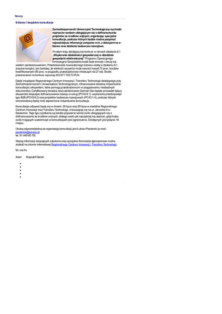 Newsy E-biznes i bezpłatne konsultacje Zachodniopomorski Uniwersytet Technologiczny wychodzi naprzeciw osobom ubiegającym się o dofinansowanie projektów ze środków unijnych, organizując specjalne konsultacje, podczas których będzie można pozyskać najważniejsze informacje związane m.in. z dotacjami na ebiznes oraz działania badawczo-rozwojowe. W całym kraju zbliżający się konkurs w ramach działania 8.1 „Wspieranie działalności gospodarczej w dziedzinie gospodarki elektronicznej” Programu Operacyjnego Innowacyjna Gospodarka budzi duże emocje i cieszy się wielkim zainteresowaniem. Przedstawiciele nowoczesnego biznesu widzą w działaniu 8.1 znaczne korzyści, tym bardziej, że wielkość wsparcia może wynosić nawet 70 proc. kosztów kwalifikowanych (80 proc. w przypadku przedsiębiorców młodszych niż 27 lat). Środki przeznaczone na konkurs wynoszą 320 871 702,73 PLN. Dzięki inicjatywie Regionalnego Centrum Innowacji i Transferu Technologii działającego przy Zachodniopomorskim Uniwersytecie Technologicznym, sfinansowane zostaną indywidualne konsultacje z ekspertem, które pomogą przedsiębiorcom w przygotowaniu niezbędnych dokumentów. Certyfikowany doradca oraz szkoleniowiec Damian Dec będzie prowadził dyżury eksperckie dotyczące dofinansowania rozwoju e-usług (PO IG 8.1), wspierania przedsięwzięć typu B2B (PO IG 8.2) oraz projektów badawczo-rozwojowych (PO IG 1.4), podczas których wnioskodawcy będą mieli zapewnione indywidualne konsultacje. Konsultacje odbywać będą się w dniach: 28 lipca oraz 29 lipca w siedzibie Regionalnego Centrum Innowacji oraz Transferu Technologii, mieszczącej się na ul. Janosika 8 w Szczecinie. Tego typu spotkania są bardzo popularne wśród osób ubiegających się o dofinansowanie ze środków unijnych, dlatego warto jak najszybciej się zapisać, gdyż liczba osób mogących uczestniczyć w konsultacjach jest ograniczona. Dostępnych jest jedynie 16 miejsc. Osobą odpowiedzialną za organizację konsultacji jest Łukasz Pasterski (e-mail: [email protected] tel. 91 449 60 79) Więcej informacji dotyczących szkolenia oraz specjalne formularze zgłoszeniowe można znaleźć na stronie internetowej Regionalnego Centrum Innowacji i Transferu Technologii. fot. sxc.hu Autor: Krzysztof Garski