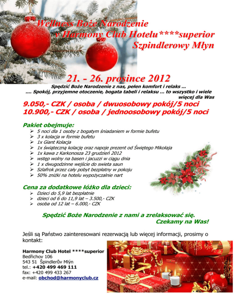 Wellness Boże Narodzenie v Harmony Club Hotelu****superior Szpindlerowy Młyn 21. - 26. prosince 2012 Spędzić Boże Narodzenie z nas, pełen komfort i relaks ... .... Spokój, przyjemne otoczenie, bogata tabeli i relaksu ... to wszystko i wiele więcej dla Was 9.050,- CZK / osoba / dwuosobowy pokój/5 noci 10.900,- CZK / osoba / jednoosobowy pokój/5 noci Pakiet obejmuje: 5 noci dla 1 osoby z bogatym śniadaniem w formie bufetu 3 x kolacja w formie bufetu 1x Giant Kolacja 1x świąteczną kolację oraz napoje prezent od Świętego Mikołaja 1x kawa z Karkonosza 23 grudzień 2012 wstęp wolny na basen i jacuzzi w ciągu dnia 1 x dwugodzinne wejście do swieta saun Szlafrok przez cały pobyt bezpłatny w pokoju 50% zniżki na hotelu wypożyczalnie nart Cena za dodatkowe łóżko dla dzieci: Dzieci do 5,9 lat bezpłatnie dzieci od 6 do 11,9 lat – 3.500,- CZK osoba od 12 lat – 6.000,- CZK Spędzić Boże Narodzenie z nami a zrelaksować się. Czekamy na Was! Jeśli są Państwo zainteresowani rezerwacją lub więcej informacji, prosimy o kontakt: Harmony Club Hotel ****superior Bedřichov 106 543 51 Špindlerův Mlýn tel.: +420 499 469 111 fax: +420 499 433 267 e-mail: [email protected]