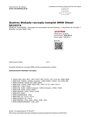 Zapraszamy do sklepu www.narzedziak.pl.pl Przedsiębiorstwo Handlowo Usługowe Gaabi Sławomir Gagatek ul. Legnicka 52A 54-204 Wrocław tel. 801 003 154 dla tel. kom.: 71 724 25 00 fax: 71 724 20 96 Quatros Blokada rozrządu komplet BMW Diesel QS10374 kategoria: KATEGORIE > Narzędzia do warsztatów samochodowych > Narzędzia do rozrządu > Blokady rozrządu BMW / Mini Producent: Quatros Cena brutto: 414,05 zł Cena netto: 336,63 zł Kod QR: Pojemność silnika: 3.0 L Komplet blokad do rozrządu BMW siliniki wysokoprężne Diesla Zastosowanie blokada rozrządu: Silniki: M41, M51, M47 - M47 TU/T2, M57 TU/T2: 2,0l / 3.0l rok: 1998–2008 BMW E36: 318tds / 318tds Compact (1994-2000) / 325td / tds (1991-99) BMW E34/E39: 525td/ tds (1991-2003) BMW E38: 725tds (1991-2003) M47 / M47 TU /T2 / M57 TU/T2 BMW E87: 118d / 120d BMW E46: 318d / 318td Compact / 320td Compact / 320d / 330d BMW E39: 520d / 525d / 530d BMW E60/E61: 525d / 530d / 535d BMW E63: 635d BMW E38/E65/E66: 730d BMW E83: X3, 2.0l d / 3.0l d BMW E53/E70: X5, 3.0l d BMW E90/E91: 316i, 316ti, 318ci, 318ti, 320i BMW E90/E91/E92/E93: 318i, 320i strona: 1/2 wydrukowano: 07-03-2017 http://www.narzedziak.pl/quatros-blokada-rozrzadu-komplet-bmw-diesel-qs10374.html Land-Rover Range Rover: 2.5 DT (1994-2002) Range Rover: 3.0 TD6 (2002-2006) Freelander: 2.0 TD4 (2002-2006) strona: 2/2 wydrukowano: 07-03-2017 http://www.narzedziak.pl/quatros-blokada-rozrzadu-komplet-bmw-diesel-qs10374.html