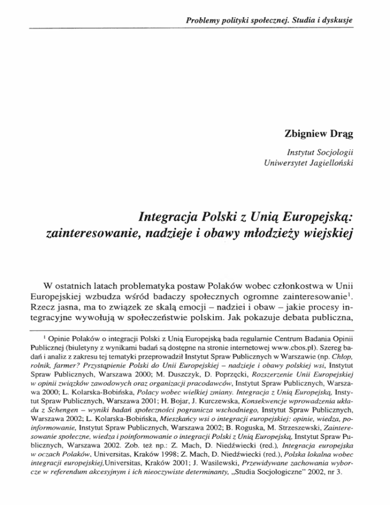 Problemy polityki społecznej. Studia i dyskusje Zbigniew Drąg Instytut Socjologii Uniwersytet Jagielloński Integracja Polski z Unią Europejską: zainteresowanie, nadzieje i obawy młodzieży wiejskiej W o statn ich latach p ro b le m a ty k a p o staw P o lak ó w w obec c z ło n k o stw a w U nii E u ro p ejsk iej w zb u d z a w śród b ad aczy sp o łeczn y ch ogro m n e z a in te re so w an ie 1. R zecz ja sn a , m a to zw iązek ze skalą em o cji - n ad ziei i obaw - ja k ie pro cesy in te g racy jn e w y w o łu ją w sp o łeczeń stw ie polskim . Jak p o k azu je d e b ata p u b liczna, 1 Opinie Polaków o integracji Polski z Unią Europejską bada regularnie Centrum Badania Opinii Publicznej (biuletyny z wynikami badań są dostępne na stronie internetowej www.cbos.pl). Szereg ba dań i analiz z zakresu tej tematyki przeprowadził Instytut Spraw Publicznych w Warszawie (np. Chłop, rolnik, farmer? Przystąpienie Polski do Unii Europejskiej - nadzieje i obawy polskiej wsi, Instytut Spraw Publicznych, Warszawa 2000; M. Duszczyk, D. Poprzęcki, Rozszerzenie Unii Europejskiej w opinii związków zawodowych oraz organizacji pracodawców, Instytut Spraw Publicznych, W arsza wa 2000; L. Kolarska-Bobińska, Polacy wobec wielkiej zmiany. Integracja z Unią Europejską, Insty tut Spraw Publicznych, Warszawa 2001; H. Bojar, J. Kurczewska, Konsekwencje wprowadzenia ukła du z Schengen - wyniki badań społeczności pogranicza wschodniego, Instytut Spraw Publicznych, Warszawa 2002; L. Kolarska-Bobińska, Mieszkańcy wsi o integracji europejskiej: opinie, wiedza, p o informowanie, Instytut Spraw Publicznych, W arszawa 2002; B. Roguska, M. Strzeszewski, Zaintere sowanie społeczne, wiedza i poinformowanie o integracji Polski z Unią Europejską, Instytut Spraw Pu blicznych, W arszawa 2002. Zob. też np.: Z. Mach, D. Niedźwiecki (red.), Integracja europejska w oczach Polaków, Universitas, Kraków 1998; Z. Mach, D. Niedźwiecki (red.), Polska lokalna wobec integracji europejskiej,Universitas, Kraków 2001; J. Wasilewski, Przewidywane zachowania wybor cze w referendum akcesyjnym i ich nieoczywiste determinanty, „Studia Socjologiczne” 2002, nr 3. 172 Zbigniew Drąg a tak że w y n ik i w ielu analiz, szczeg ó ln ie zró żn ico w an e opinie na te m a t integ racji w y stęp u ją w śró d lu d n o ści w iejsk iej2. P o staw y m ieszk ań có w w si w obec integ racji eu ropejskiej zn ajd u ją znaczące m iejsce w b a d an iach In sty tu tu S praw P u b lic z n y ch 3. C elem o statn ieg o - realiz o w an eg o p rzez In sty tu t S p raw P u b liczn y ch - p ro jektu b a d aw czeg o było p rz e p ro w ad zen ie w ielo asp ek to w ej analizy p o g ląd ó w i asp iracji m ło d y ch m ieszk ań có w w si, w ty m w k o n tek ście ak cesu P olski do U nii E u ro p ejsk iej. B ad an ie teren o w e zo stało p rz e p ro w a d zo n e w k w ietn iu 2002 roku p rzez P raco w n ię B ad ań S p o łe c z ny ch w S o p o cie na rep rezen taty w n ej p ró b ie 610 m ieszk ań có w w si w w ieku od 16 do 30 lat. N in iejszy arty k u ł p rezen tu je n iek tó re w yniki tych b ad ań d o ty czące p ro b le m a ty k i in teg racy jn ej4. B io rąc p od u w ag ę asp ek t „in te g ra c y jn y ” , b ad an ie k o n c en tro w ało się na n a stę p u jący ch k w estiach : w ja k im stopniu m ło d y ch m ieszk ań có w w si ang ażu je o g ó l n o n a ro d o w a d eb ata d o ty c z ą c a w stąp ien ia P olski do stru k tu r u n ijn y ch ? C zy za u w ażają, że w realizacji ich aspiracji ży cio w y ch u sy tu o w an ie P olski w tych stru k tu rach b ęd zie m iało isto tn e, a m oże i d ecy d u jące, zn aczen ie? C zy zn ajd u ją dla siebie m iejsce w zin teg ro w an ej E u ro p ie, czy p rz y jm u ją po staw ę o u tsid eró w ? N a p o w y ższe p y ta n ia m o żn a dać o d p o w ied ź an alizu jąc m iędzy innym i stopień za in te reso w a n ia m ło d zieży w iejskiej sp raw am i „ in te g rac y jn y m i” , a tak że ich n a d z ie je i ob aw y zw iązan e z p rz y stą p ie n ie m P olski do U nii E u ro pejskiej. Zainteresowanie sprawami „integracyjnym i” C zy m ło d zi m ieszk ań cy w si są z ain tereso w an i sp raw am i „ in te g racy jn y m i” ? C zy p o sia d a n a o tych sp raw ach w ied za k ształtu je ich ogólne n astaw ien ie do in tegracji, w z b u d z a o k reślo n e n ad zieje lub obaw y, d eterm in u je sposób p o strz e g a n ia k o n se k w e n c ji w stąp ien ia P olsk i do U nii E u ro p ejsk iej? W y n ik i b a d ań p o z w a la ją stw ierd zić, że z a in tereso w an ie m ło d zieży w iejskiej p ro b le m a ty k ą in te g ra c y jn ą je s t u m iark o w an e. N a py tan ie o stopień za in te re so w a nia sp raw am i d o ty czący m i in teg racji P olsk i z U n ią E u ro p e jsk ą je d y n ie n iesp ełn a 59% b ad an y ch o d p o w iad ało , że ta p ro b lem aty k a je st (bardzo lub raczej) dla nich interesu jąca. P raw ie 38% w y raziło (raczej lub zu p ełnie) brak zain tereso w an ia, po zo stali (4% ) za ś nie p o trafili dok o n ać sam o o k reślen ia (w y b ierając o d p o w ied ź „trudn o p o w ie d z ie ć ” ). T ru d n o nie zap y tać, d laczego aż tak zn ac ząca część m ło dych m ieszk ań có w w si nie w y raża zain te re so w an ia ty m tem atem ? C zy żb y nie d o strz e g a ła w p ły w u p ro cesó w in teg racy jn y ch na w łasne losy? W ja k ie jś m ierze św iad czą o ty m d an e d o ty czące oceny w łasn eg o p o in fo rm o w a n ia o sp raw ach d o 2 J. W asilewski, Przewidywane zachowania..., op. cit. 3 Chłop, rolnik, farmer? op. cit. 4 Artykuł jest skróconą i zmodyfikowaną wersją rozdziału VI raportu: Z. Drąg, K. Gorlach, Z. Seręga, Młode pokolenie III Rzeczypospolitej. Aspiracje życiowe w przeddzień integracji z Unią Europej ską, Instytut Spraw Publicznych, Warszawa 2003. Integracja Polski z Unią Europejską 173 ty czący ch in teg racji P o ls