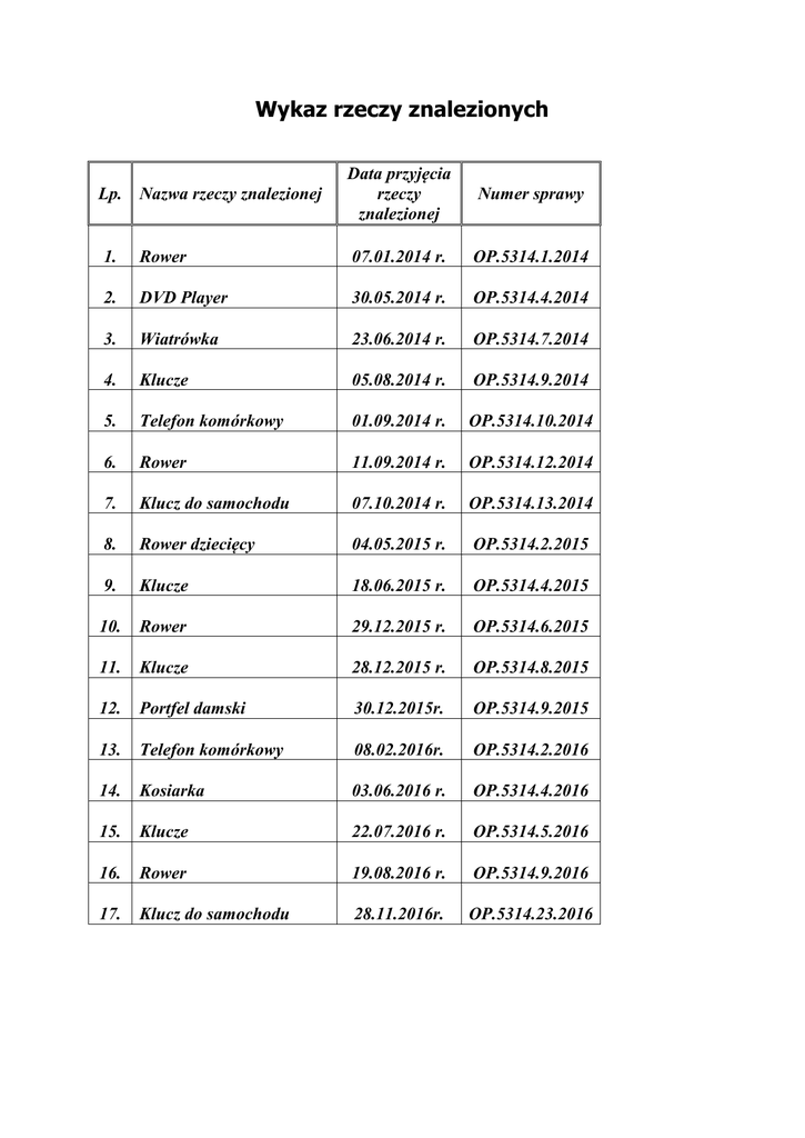 Wykaz rzeczy znalezionych Lp. Nazwa rzeczy znalezionej Data przyjęcia rzeczy znalezionej Numer sprawy 1. Rower 07.01.2014 r. OP.5314.1.2014 2. DVD Player 30.05.2014 r. OP.5314.4.2014 3. Wiatrówka 23.06.2014 r. OP.5314.7.2014 4. Klucze 05.08.2014 r. OP.5314.9.2014 5. Telefon komórkowy 01.09.2014 r. OP.5314.10.2014 6. Rower 11.09.2014 r. OP.5314.12.2014 7. Klucz do samochodu 07.10.2014 r. OP.5314.13.2014 8. Rower dziecięcy 04.05.2015 r. OP.5314.2.2015 9. Klucze 18.06.2015 r. OP.5314.4.2015 10. Rower 29.12.2015 r. OP.5314.6.2015 11. Klucze 28.12.2015 r. OP.5314.8.2015 12. Portfel damski 30.12.2015r. OP.5314.9.2015 13. Telefon komórkowy 08.02.2016r. OP.5314.2.2016 14. Kosiarka 03.06.2016 r. OP.5314.4.2016 15. Klucze 22.07.2016 r. OP.5314.5.2016 16. Rower 19.08.2016 r. OP.5314.9.2016 17. Klucz do samochodu 28.11.2016r. OP.5314.23.2016