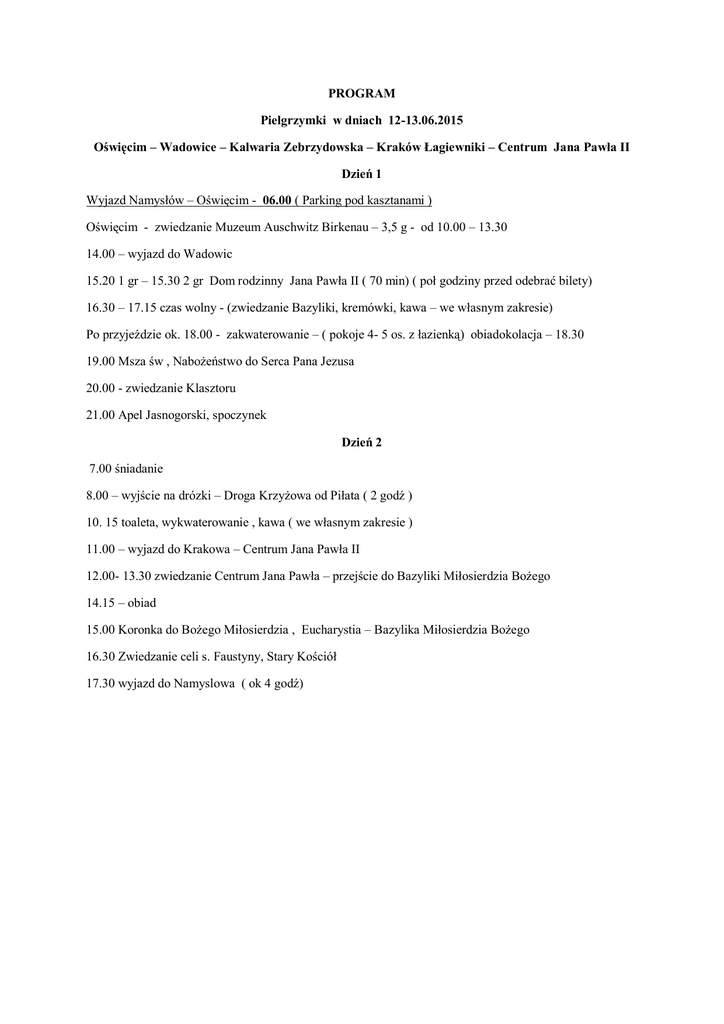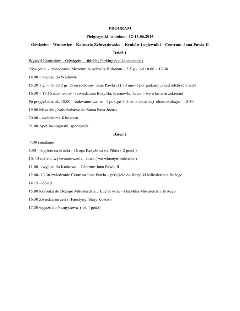 PROGRAM Pielgrzymki w dniach 12-13.06.2015 Oświęcim – Wadowice – Kalwaria Zebrzydowska – Kraków Łagiewniki – Centrum Jana Pawła II Dzień 1 Wyjazd Namysłów – Oświęcim - 06.00 ( Parking pod kasztanami ) Oświęcim - zwiedzanie Muzeum Auschwitz Birkenau – 3,5 g - od 10.00 – 13.30 14.00 – wyjazd do Wadowic 15.20 1 gr – 15.30 2 gr Dom rodzinny Jana Pawła II ( 70 min) ( poł godziny przed odebrać bilety) 16.30 – 17.15 czas wolny - (zwiedzanie Bazyliki, kremówki, kawa – we własnym zakresie) Po przyjeździe ok. 18.00 - zakwaterowanie – ( pokoje 4- 5 os. z łazienką) obiadokolacja – 18.30 19.00 Msza św , Nabożeństwo do Serca Pana Jezusa 20.00 - zwiedzanie Klasztoru 21.00 Apel Jasnogorski, spoczynek Dzień 2 7.00 śniadanie 8.00 – wyjście na drózki – Droga Krzyżowa od Piłata ( 2 godź ) 10. 15 toaleta, wykwaterowanie , kawa ( we własnym zakresie ) 11.00 – wyjazd do Krakowa – Centrum Jana Pawła II 12.00- 13.30 zwiedzanie Centrum Jana Pawła – przejście do Bazyliki Miłosierdzia Bożego 14.15 – obiad 15.00 Koronka do Bożego Miłosierdzia , Eucharystia – Bazylika Miłosierdzia Bożego 16.30 Zwiedzanie celi s. Faustyny, Stary Kościół 17.30 wyjazd do Namyslowa ( ok 4 godź)