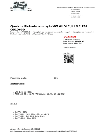 Zapraszamy do sklepu www.narzedziak.pl.pl Przedsiębiorstwo Handlowo Usługowe Gaabi Sławomir Gagatek ul. Legnicka 52A 54-204 Wrocław tel. 801 003 154 dla tel. kom.: 71 724 25 00 fax: 71 724 20 96 Quatros Blokada rozrządu VW AUDI 2,4 / 3,2 FSI QS10600 kategoria: KATEGORIE > Narzędzia do warsztatów samochodowych > Narzędzia do rozrządu > Blokady rozrządu VAG - VW / Audi / Seat / Skoda Producent: Quatros Cena brutto: 157,07 zł Cena netto: 127,70 zł Opcje produktu: Kod QR: Pojemność silnika: 5.2 L Zastosowanie: VW: Jetta od 2005r. AUDI: A4, RS4, S5, A6 / Allroad, A8, S8, R8, Q7 od 2005r. Silniki: 2,4 3,2 4,2 5,2 V6 – BDW V6 FSI – AUK, BGP, BGQ, BKH, BPK V8 FSI – BVJ, BNS, BYH, CAUA V10 FSI – BXA, BSM strona: 1/2 wydrukowano: 07-03-2017 http://www.narzedziak.pl/quatros-blokada-rozrzadu-vw-audi-2-4-3-2-fsi-qs10600.html Zawartość zestawu: Przyrząd do wałków rozrządu 2szt. nr OEM T40072 Trzpień do blokady wału korbowego nr OEM T40069 Przyrząd do napinacza nr OEM T40071 strona: 2/2 wydrukowano: 07-03-2017 http://www.narzedziak.pl/quatros-blokada-rozrzadu-vw-audi-2-4-3-2-fsi-qs10600.html
