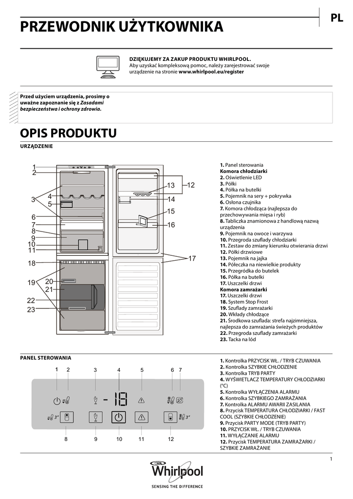 PRZEWODNIK UŻYTKOWNIKA PL DZIĘKUJEMY ZA ZAKUP PRODUKTU WHIRLPOOL. Aby uzyskać kompleksową pomoc, należy zarejestrować swoje urządzenie na stronie www.whirlpool.eu/register Przed użyciem urządzenia, prosimy o uważne zapoznanie się z Zasadami bezpieczeństwa i ochrony zdrowia. OPIS PRODUKTU URZĄDZENIE 1 2 13 3 4 5 14 15 6 7 8 9 10 11 16 17 18 19 12 20 21 22 23 PANEL STEROWANIA 1 2 8 3 4 5 9 10 11 6 7 12 1. Panel sterowania Komora chłodziarki 2. Oświetlenie LED 3. Półki 4. Półka na butelki 5. Pojemnik na sery + pokrywka 6. Osłona czujnika 7. Komora chłodząca (najlepsza do przechowywania mięsa i ryb) 8. Tabliczka znamionowa z handlową nazwą urządzenia 9. Pojemnik na owoce i warzywa 10. Przegroda szuflady chłodziarki 11. Zestaw do zmiany kierunku otwierania drzwi 12. Półki drzwiowe 13. Pojemnik na jajka 14. Półeczka na niewielkie produkty 15. Przegródka do butelek 16. Półka na butelki 17. Uszczelki drzwi Komora zamrażarki 17. Uszczelki drzwi 18. System Stop Frost 19. Szuflady zamrażarki 20. Wkłady chłodzące 21. Środkowa szuflada: strefa najzimniejsza, najlepsza do zamrażania świeżych produktów 22. Przegroda szuflady zamrażarki 23. Tacka na lód 1. Kontrolka PRZYCISK WŁ. / TRYB CZUWANIA 2. Kontrolka SZYBKIE CHŁODZENIE 3. Kontrolka TRYB PARTY 4. WYŚWIETLACZ TEMPERATURY CHŁODZIARKI (°C) 5. Kontrolka WYŁĄCZENIA ALARMU 6. Kontrolka SZYBKIEGO ZAMRAŻANIA 7. Kontrolka ALARMU AWARII ZASILANIA 8. Przycisk TEMPERATURA CHŁODZIARKI / FAST COOL (SZYBKIE CHŁODZENIE) 9. Przycisk PARTY MODE (TRYB PARTY) 10. PRZYCISK WŁ. / TRYB CZUWANIA 11. WYŁĄCZANIE ALARMU 12. Przycisk TEMPERATURA ZAMRAŻARKI / SZYBKIE ZAMRAŻANIE 1 AKCESORIA POJEMNIK NA JAJKA POJEMNIK NA SERY PÓŁKA NA BUTELKI PRZEGRÓDKA DO BUTELEK PRZEGRODA SZUFLADY PRZEGRODA SZUFLADY CHŁODZIARKI WKŁADY CHŁODZĄCE WYPOSAŻENIE STOP FROST TACKA NA LÓD PIERWSZE UŻYCIE URUCHOMIENIE URZĄDZENIA Po podłączeniu do zasilania, urządzenie zaczyna działać automatycznie. Po włączeniu urządzenia należy odczekać co najmniej 4–6 godzin przed włożeniem żywności do chłodziarki i komory zamrażarki. 2 Po podłączeniu urządzenia do zasilania, wyświetlacz zostaje podświetlony i przez około 1 s widoczne są wszystkie ikony. Zostają podświetlone domyślne (fabryczne) wartości ustawień komory chłodziarki. CODZIENNA EKSPLOATACJA FUNKCJE WŁ./TRYB CZUWANIA Aby ustawić tryb czuwania urządzenia, należy nacisnąć i przytrzymać przez 3 sekundy przycisk Wł./Trybu czuwania. Wszystkie wskaźniki zostają wyłączone z wyjątkiem wskaźnika Wł./Tryb czuwania. Aby włączyć urządzenie, należy nacisnąć ten przycisk ponownie. TEMPERATURA CHŁODZIARKI Aby ustawić temperaturę chłodziarki, nacisnąć przycisk Temperatury Chłodziarki. Temperaturę chłodziarki można regulować w zakresie od +2°C do + 8°C. O ustawieniu informują WYŚWIETLACZ TEMPERATURY CHŁODZIARKI / ZAMRAŻARKI (°C) TEMPERATURA ZAMRAŻARKI Aby ustawić temperaturę chłodziarki, nacisnąć przycisk temperatury. Temperaturę chłodziarki można regulować w zakresie od -16°C do -24°C. O ustawieniu informują WYŚWIETLACZ TEMPERATURY CHŁODZIARKI / ZAMRAŻARKI (°C) FUNKCJA 6TH SENSE FRESH CONTROL Ta funkcja automatycznie zapewnia najlepsze warunki do przechowywania żywności. W przypadku jakichkolwiek odchyleń funkcja 6th Sense Fresh Control natychmiast przywraca idealne warunki. Rezultat jest znakomity: produkty umieszczone w dowolnym miejscu we wnętrzu chłodziarki zachowują świeżość do 4 razy dłuższej. SZYBKIE ZAMRAŻANIE Zaleca się korzystanie z tej funkcji w przypadku wkładania dużych ilości żywności do komory zamrażarki. Aby włączyć funkcję Szybkiego zamrażania, na 24 godziny przed zamrożeniem świeżej żywności należy nacisnąć przycisk Zamrażarki (Freezer). Włączenie funkcji jest sygnalizowane włączeniem kontrolki Szybkiego zamrażania. Po 24 godzinach umieścić żywność przeznaczoną do zamrożenia w środkowej części komory zamrażarki. Funkcja zostaje automatycznie wyłączona po 48 godzinach lub można ją wyłączyć ręcznie, naciskając przycisk Szybkiego zamrażania. PL Więcej szczegółów na temat funkcji można znaleźć w Instrukcji obsługi i konserwacji urządzenia / na ostatniej stronie podano informacje w jaki sposób można otrzymać Instrukcję obsługi i konserwacji urządzenia TRYB PARTY Nacisnąć przycisk Tryb Party, aby włączyć/wyłączyć Tryb Party. Ta funkcja umożliwia chłodzenie napojów w komorze zamrażarki. Ważne: nie wolno pozostawiać butelek w komorze zamrażarki, gdy ta funkcja przestanie być aktywna (30 minut) SZYBKIE CHŁODZENIE Za pomocą funkcji Szybkiego chłodzenia (Fast Cool) można zwiększyć wydajność chłodzenia komory chłodziarki. Użycie tej funkcji jest zalecane, gdy do komory chłodziarki zostanie włożona bardzo duża ilość żywności. Naciśnij przycisk Szybkiego chłodzenia (Fast Cool) w celu włączenia funkcji Szybkiego chłodzenia (Fast Cool). Włączenie funkcji jest sygnalizowane włączeniem kontrolki szybkiego chłodzenia. Funkcja zostaje automatycznie wyłączona po 6 godzinach lub można ją wyłączyć ręcznie, ponownie naciskając przycisk Szybkiego chłodzenia (Fast Cool) . OŚWIETLENIE CHŁODZIARKI W systemie oświetlenia wewnątrz chłodziarki zastosowano diody LED, które zapewniają lepszą widoczność przy jednoczesnym niskim zużyciu energii. Jeśli oświetlenie LED nie działa, w celu jego wymiany należy skontaktować się z serwisem. Ważne: Oświetlenie wewnątrz komory chłodziarki jest włączane po otwarciu drzwi chłodziarki. Jeśli drzwi pozostają otwarte przez ponad 10 minut, oświetlenie jest automatycznie wyłączane. TABELA ALARMÓW TYP ALARMU Sygnał Alarm otwartych Zostaje włączony sygnał dźwiękowy i drzwi miga kontrolka Alarmu. Alarm temperatury Alarm przedłużonej awarii zasilania Przyczyna Drzwi chłodziarki i/lub zamrażarki są otwarte przez ponad 2 minuty. Tem
