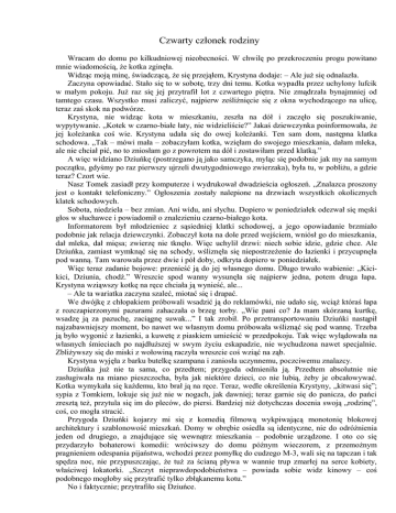 Czwarty członek rodziny Wracam do domu po kilkudniowej nieobecności. W chwilę po przekroczeniu progu powitano mnie wiadomością, że kotka zginęła. Widząc moją minę, świadczącą, że się przejąłem, Krystyna dodaje: – Ale już się odnalazła. Zaczyna opowiadać. Stało się to w sobotę, trzy dni temu. Kotka wypadła przez uchylony lufcik w małym pokoju. Już raz się jej przytrafił lot z czwartego piętra. Nie zmądrzała bynajmniej od tamtego czasu. Wszystko musi zaliczyć, najpierw ześliźnięcie się z okna wychodzącego na ulicę, teraz zaś skok na podwórze. Krystyna, nie widząc kota w mieszkaniu, zeszła na dół i zaczęło się poszukiwanie, wypytywanie. „Kotek w czarno-białe łaty, nie widzieliście?” Jakaś dziewczynka poinformowała, że jej koleżanka coś wie. Krystyna udała się do owej koleżanki. Ten sam dom, następna klatka schodowa. „Tak – mówi mała – zobaczyłam kotka, wzięłam do swojego mieszkania, dałam mleka, ale nie chciał pić, no to zniosłam go z powrotem na dół i zostawiłam przed klatką.” A więc widziano Dziuńkę (postrzegano ją jako samczyka, myląc się podobnie jak my na samym początku, gdyśmy po raz pierwszy ujrzeli dwutygodniowego zwierzaka), była tu, w pobliżu, a gdzie teraz? Czort wie. Nasz Tomek zasiadł przy komputerze i wydrukował dwadzieścia ogłoszeń. „Znalazca proszony jest o kontakt telefoniczny.” Ogłoszenia zostały nalepione na drzwiach wszystkich okolicznych klatek schodowych. Sobota, niedziela – bez zmian. Ani widu, ani słychu. Dopiero w poniedziałek odezwał się męski głos w słuchawce i powiadomił o znalezieniu czarno-białego kota. Informatorem był młodzieniec z sąsiedniej klatki schodowej, a jego opowiadanie brzmiało podobnie jak relacja dziewczynki. Zobaczył kota na dole przed wejściem, wniósł go do mieszkania, dał mleka, dał mięsa; zwierzę nie tknęło. Więc uchylił drzwi: niech sobie idzie, gdzie chce. Ale Dziuńka, zamiast wymknąć się na schody, wśliznęła się niepostrzeżenie do łazienki i przycupnęła pod wanną. Tam warowała przez dwie i pół doby, odkryta dopiero w poniedziałek. Więc teraz zadanie bojowe: przenieść ją do jej własnego domu. Długo trwało wabienie: „Kicikici, Dziunia, chodź.” Wreszcie spod wanny wysunęła się najpierw jedna, potem druga łapa. Krystyna wziąwszy kotkę na ręce chciała ją wynieść, ale... – Ale ta wariatka zaczyna szaleć, miotać się i drapać. We dwójkę z chłopakiem próbowali wsadzić ją do reklamówki, nie udało się, wciąż któraś łapa z rozczapierzonymi pazurami zahaczała o brzeg torby. „Wie pani co? Ja mam skórzaną kurtkę, wsadzę ją za pazuchę, zaciągnę suwak...” I tak zrobił. Po przetransportowaniu Dziuńki nastąpił najzabawniejszy moment, bo nawet we własnym domu próbowała wśliznąć się pod wannę. Trzeba ją było wygonić z łazienki, a kuwetę z piaskiem umieścić w przedpokoju. Tak więc wylądowała na własnych śmieciach po najdłuższej w swym życiu eskapadzie, nie wychudzona nawet specjalnie. Zbliżywszy się do miski z wołowiną raczyła wreszcie coś wziąć na ząb. Krystyna wyjęła z barku butelkę szampana i zaniosła uczynnemu, poczciwemu znalazcy. Dziuńka już nie ta sama, co przedtem; przygoda odmieniła ją. Przedtem absolutnie nie zasługiwała na miano pieszczocha, była jak niektóre dzieci, co nie lubią, żeby je obcałowywać. Kotka wymykała się każdemu, kto brał ją na ręce. Teraz, wedle określenia Krystyny, „kitwasi się”; sypia z Tomkiem, lokuje się już nie w nogach, jak dawniej; teraz garnie się do panicza, do pańci zresztą też, przytula się im do pleców, do piersi. Bardziej niż dotychczas docenia swoją „rodzinę”, coś, co mogła stracić. Przygoda Dziuńki kojarzy mi się z komedią filmową wykpiwającą monotonię blokowej architektury i szablonowość mieszkań. Domy w obrębie osiedla są identyczne, nie do odróżnienia jeden od drugiego, a znajdujące się wewnątrz mieszkania – podobnie urządzone. I oto co się przydarzyło bohaterowi komedii: wróciwszy do domu późnym wieczorem, z przemożnym pragnieniem odespania pijaństwa, wchodzi przez pomyłkę do cudzego M-3, wali się na tapczan i tak spędza noc, nie przypuszczając, że tuż za ścianą pływa w wannie trup zmarłej na serce kobiety, właściwej lokatorki. „Szczyt nieprawdopodobieństwa – powiada sobie widz kinowy – coś podobnego mogłoby się przytrafić tylko zbłąkanemu kotu.” No i faktycznie; przytrafiło się Dziuńce.