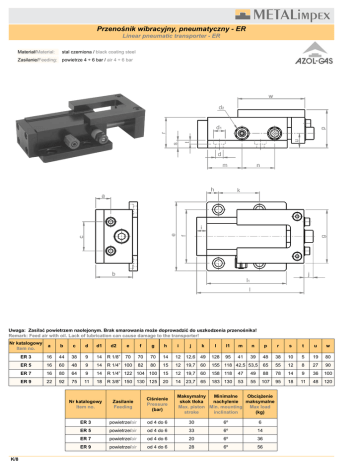 Przenośnik wibracyjny, pneumatyczny - ER Linear pneumatic transporter - ER Materiał/Material: stal czerniona / black coating steel Zasilanie/Feeding: powietrze 4 ÷ 6 bar / air 4 ÷ 6 bar Uwaga: Zasilać powietrzem naolejonym. Brak smarowania może doprowadzić do uszkodzenia przenośnika! Remark: Feed air with oil. Lack of lubrication can cause damage to the transporter! Nr katalogowy Item no. a b c d d1 d2 e f g h i j k l l1 m n p r s t u w ER 3 16 44 38 9 14 R 1/8” 70 70 70 14 12 12,6 49 128 95 41 39 48 38 10 5 19 80 ER 5 16 60 48 9 14 R 1/4” 100 82 80 15 12 19,7 60 155 118 42,5 53,5 65 55 12 8 27 90 ER 7 16 80 64 9 14 R 1/4” 122 104 100 15 12 19,7 60 158 118 47 49 88 78 14 9 36 100 ER 9 22 92 75 11 18 R 3/8” 150 130 125 20 14 23,7 65 183 130 53 55 107 95 18 11 48 120 K/8 Maksymalny Minimalne Obciążenie skok tłoka nachylenie maksymalne Max. piston Min. mounting Max load stroke inclination (kg) Nr katalogowy Item no. Zasilanie Feeding Ciśnienie Pressure (bar) ER 3 powietrze/air od 4 do 6 30 6º 6 ER 5 powietrze/air od 4 do 6 33 6º 14 ER 7 powietrze/air od 4 do 6 20 6º 36 ER 9 powietrze/air od 4 do 6 28 6º 56 Przenośnik wibracyjny, pneumatyczny - ER Linear pneumatic transporter - ER Rynna wykonana z blachy nierdzewnej - EZ Tray made of stainless steel - EZ Przenośnik Transporter Podpora łożyskowana Bearing support Śruby mocujące Mounting screws Rys. 1. Przykład zabudowy przenośnika Mounting example Rys. 2. Przykład zastosowania i odprowadzania odpadów przy perforacji Example of use and removal of waste at the perforation K/9