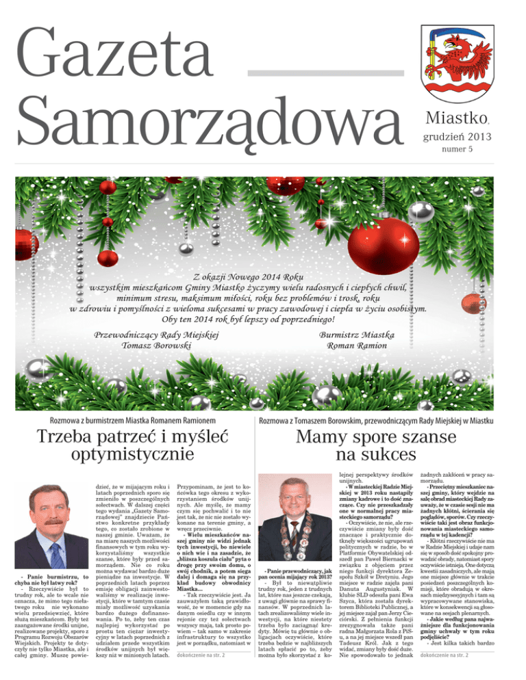 Gazeta Samorządowa Miastko , grudzień 2013 numer 5 Rozmowa z burmistrzem Miastka Romanem Ramionem Rozmowa z Tomaszem Borowskim, przewodniczącym Rady Miejskiej w Miastku Trzeba patrzeć i myśleć optymistycznie Mamy spore szanse na sukces dzieć, że w mijającym roku i latach poprzednich sporo się zmieniło w poszczególnych sołectwach. W dalszej części tego wydania „Gazety Samorządowej” znajdziecie Państwo konkretne przykłady tego, co zostało zrobione w naszej gminie. Uważam, że na miarę naszych możliwości finansowych w tym roku wykorzystaliśmy wszystkie szanse, które były przed samorządem. Nie co roku można wydawać bardzo duże pieniądze na inwestycje. W poprzednich latach poprzez emisję obligacji zainwestowaliśmy w realizację inwestycji, które w tamtym czasie miały możliwość uzyskania bardzo dużego dofinansowania. Po to, żeby ten czas najlepiej wykorzystać po prostu ten ciężar inwestycyjny w latach poprzednich z udziałem przede wszystkim środków unijnych był większy niż w minionych latach. lejnej perspektywy środków unijnych. - W miasteckiej Radzie Miejskiej w 2013 roku nastąpiły zmiany kadrowe i to dość znaczące. Czy nie przeszkadzały one w normalnej pracy miasteckiego samorządu? - Oczywiście, że nie, ale rzeczywiście zmiany były dość znaczące i praktycznie dotknęły większości ugrupowań politycznych w radzie, bo w Platformie Obywatelskiej odszedł pan Paweł Biernacki w związku z objęciem przez niego funkcji dyrektora Zespołu Szkół w Dretyniu. Jego miejsce w radzie zajęła pani Danuta Augustyniak. W klubie SLD odeszła pani Ewa Szyca, która została dyrektorem Biblioteki Publicznej, a jej miejsce zajął pan Jerzy Cieciórski. Z pełnienia funkcji zrezygnowała także pani radna Małgorzata Rola z PiSu, a na jej miejsce wszedł pan Tadeusz Król. Jak z tego widać, zmiany były dość duże. Nie spowodowało to jednak - Panie burmistrzu, to chyba nie był łatwy rok? - Rzeczywiście był to trudny rok, ale to wcale nie oznacza, że mimo tego niełatwego roku nie wykonano wielu przedsięwzięć, które służą mieszkańcom. Były też zaangażowane środki unijne, realizowane projekty, sporo z Programu Rozwoju Obszarów Wiejskich. Projekty te dotyczyły nie tylko Miastka, ale i całej gminy. Muszę powie- Przypominam, że jest to końcówka tego okresu z wykorzystaniem środków unijnych. Ale myślę, że mamy czym się pochwalić i to nie jest tak, że nic nie zostało wykonane na terenie gminy, a wręcz przeciwnie. - Wielu mieszkańców naszej gminy nie widzi jednak tych inwestycji, bo niewiele o nich wie i na zasadzie, że „bliższa koszula ciału” pyta o drogę przy swoim domu, o swój chodnik, a potem sięga dalej i domaga się na przykład budowy obwodnicy Miastka… - Tak rzeczywiście jest. Ja zauważyłem taką prawidłowość, że w momencie gdy na danym osiedlu czy w innym rejonie czy też sołectwach wszyscy mają, tak prosto powiem – tak samo w zakresie infrastruktury to wszystko jest w porządku, natomiast w dokończenie na str. 2 - Panie przewodniczący, jak pan ocenia mijający rok 2013? - Był to niewątpliwie trudny rok, jeden z trudnych lat, które nas jeszcze czekają, z uwagi głównie na sprawy finansów. W poprzednich latach zrealizowaliśmy wiele inwestycji, na które niestety trzeba było zaciągnąć kredyty. Mówię tu głównie o obligacjach oczywiście, które trzeba będzie w najbliższych latach spłacić po to, żeby można było skorzystać z ko- żadnych zakłóceń w pracy samorządu. - Przeciętny mieszkaniec naszej gminy, który wejdzie na salę obrad miasteckiej Rady zauważy, że w czasie sesji nie ma żadnych kłótni, ścierania się poglądów, sporów. Czy rzeczywiście taki jest obraz funkcjonowania miasteckiego samorządu w tej kadencji? - Kłótni rzeczywiście nie ma w Radzie Miejskiej i udaje nam się w sposób dość spokojny prowadzić obrady, natomiast spory oczywiście istnieją. One dotyczą kwestii zasadniczych, ale mają one miejsce głównie w trakcie posiedzeń poszczególnych komisji, które obradują w okresach międzysesyjnych i tam są wypracowywane stanowiska, które w konsekwencji są głosowane na sesjach plenarnych. - Jakie według pana najważniejsze dla funkcjonowania gminy uchwały w tym roku podjęliście? - Jest kilka takich bardzo dokończenie na str. 2 Gazeta Samorządowa dokończenie ze str. 1 momencie gdy zaczyna się pojawiać nowa inwestycja, gdy dana ulica ma nową nawierzchnię, nowy chodnik, to natychmiast ci, którzy mieszkają w sąsiedztwie zaczynają zadawać pytania, a kiedy będzie tak samo ładnie u nas? Niestety jednak nie da się w ciągu krótkiego okresu czasu zmienić wizerunku każdego miasta. Ja muszę powiedzieć jedno, że najwięcej pochwał na temat wizerunku naszego miasta, na temat czystości, estetyki, słyszę z ust ludzi, którzy do Miastka przyjeżdżają. Mówią o tym, jak tu u was jest kolorowo, jaki macie wspaniały park, jaka tu jest piękna zieleń. W ogóle Miastko jako małe miasteczko wśród tych odwiedzających jest postrzegane jako miasto zieleni, jako małe, ładne, czyste i estetyczne miasteczko. Sięgnijmy trochę pamięcią wstecz i odpowiedzmy sobie na takie pytanie – jak Miastko wyglądało dziesięć lat temu, co się od tego czasu zmieniło? Jak wyglądała ulica Sikor- skiego, Kaszubska, Klonowa, jak wyglądała droga krajowa bez rond? Tych zmian w infrastrukturze Miastka jest naprawdę sporo, choć wiele osób może powiedzieć, że za mało, że miasto powinno szybciej się rozwijać. - No właśnie, młodzi ludzie narzekają, że nie ma dla nich miejsc pracy w gminie, że muszą wyjeżdżać za chlebem poza granicę nie tylko gminy, ale i kraju. Nie wiedzą jednak, że samorząd nie tworzy miejsc pracy… - A tylko może wspierać inicjatywy powstawania nowych przedsiębiorstw. Ja wielokrotnie na spotkaniach z mieszkańcami powtarzam, że samorząd gminy Miastko ma narzędzie w