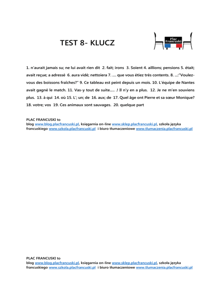 TEST 8- KLUCZ 1. n’aurait jamais su; ne lui avait rien dit 2. fait; irons 3. Soient 4. aillions; pensions 5. était; avait reçue; a adressé 6. aura vidé; nettoiera 7. .... que vous étiez très contents. 8. ...:”Voulezvous des boissons fraîches?” 9. Ce tableau est peint depuis un mois. 10. L’équipe de Nantes avait gagné le match. 11. Vas-y tout de suite..... .! Il n’y en a plus. 12. Je ne m’en souviens plus. 13. à qui 14. où 15. L’; un; de 16. aux; de 17. Quel âge ont Pierre et sa sœur Monique? 18. votre; vos 19. Ces animaux sont sauvages. 20. quelque part PLAC FRANCUSKI to blog www.blog.placfrancuski.pl, księgarnia on-line www.sklep.placfrancuski.pl, szkoła języka francuskiego www.szkola.placfrancuski.pl i biuro tłumaczeniowe www.tlumaczenia.placfrancuski.pl PLAC FRANCUSKI to blog www.blog.placfrancuski.pl, księgarnia on-line www.sklep.placfrancuski.pl, szkoła języka francuskiego www.szkola.placfrancuski.pl i biuro tłumaczeniowe www.tlumaczenia.placfrancuski.pl