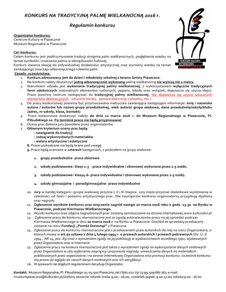 KONKURS NA TRADYCYJNĄ PALMĘ WIELKANOCNĄ 2016 r. Regulamin konkursu Organizator konkursu: Centrum Kultury w Piasecznie Muzeum Regionalne w Piasecznie Cel konkursu: Celem konkursu jest podtrzymywanie tradycji strojenia palm wielkanocnych, pogłębienie wiedzy na temat symboliki i znaczenia palmy w obrzędowości ludowej. Konkurs stwarza okazję do indywidualnej działalności artystycznej oraz wymiany wiedzy na temat zanikającego zwyczaju własnoręcznego robienia palm. Zasady uczestnictwa: 1. Konkurs adresowany jest do dzieci i młodzieży szkolnej z terenu Gminy Piaseczno. 2. Na konkurs należy dostarczyć jedną własnoręcznie wykonaną palmę wielkanocną nie wyższą niż 2 metry. 3. Warunkiem udziału jest wykonanie tradycyjnej palmy wielkanocnej, z wykorzystaniem wyłącznie tradycyjnych form zdobniczych (naturalnych elementów roślinnych, papieru, bibuły oraz wstążek; dopuszcza się użycia kleju). Prace powinny twórczo nawiązywać do tradycyjnej palmy wielkanocnej. Nie dopuszcza się użycia sztucznych elementów dekoracyjnych - sztuczne kwiaty, gotowe dekoracje z plastiku, etc.) 4. Do pracy konkursowej powinna być przymocowana metryczka zawierająca następujące informacje: imię i nazwisko autora / autorów lub nazwa grupy przedszkolnej, wiek autora/ grupa wiekowa, dane przedszkola/szkoły/klubu (adres, nr szkoły, klasa, kontakt) 5. Prace konkursowe dostarczyć należy do dnia 12 marca 2016 r. do Muzeum Regionalnego w Piasecznie, Pl. Piłsudskiego 10. Po terminie prace nie będą przyjmowane! 6. Oceny prac dokona jury powołane przez organizatorów. 7. Głównym kryterium oceny prac będą: - nawiązanie do tradycji - rodzaj wykorzystanych materiałów - walory artystyczne i estetyczne 8. Prace uszkodzone nie będą brane pod uwagę. 9. Prace będą oceniane w czterech kategoriach, z podziałem na grupy wiekowe: 1. grupy przedszkolne- prace zbiorowe 2. szkoły podstawowe- klasy 1-3 - prace indywidualne i zbiorowe( wykonane przez 2-5 osób). 3. szkoły podstawowe- klasy4-6- prace indywidualne i zbiorowe( wykonane przez 2-5 osób). 4. szkoły gimnazjalne i ponadgimnazjalne- prace indywidualne 10. Jury w każdej kategorii i grupie wiekowej przyzna I, II i III miejsce. Jury może przyznać dodatkowe wyróżnienia w zależności od ilości i poziomu artystycznego prac. Dla zwycięzców konkursu organizatorzy przygotują dyplomy oraz nagrody. 11. Ogłoszenie wyników konkursu oraz wręczenie nagród nastąpi 20 marca 2016 roku o godz. 13.30 na Rynku w Piasecznie, podczas Kiermaszu Wielkanocnego. 12. Wyniki konkursu oraz zdjęcia nagrodzonych prac zostaną zamieszczone na stronie internetowej:www.kulturalni.pl 13. Zgłoszenie pracy do konkursu równoznaczne jest ze zgodą autora/autorów pracy na jej sprzedaż podczas Kiermaszu Wielkanocnego w dniu 20 marca 2016 r. na Rynku w Piasecznie. Dochód ze sprzedaży przekazany zostanie na rzecz Fundacji „Pomóż Dorosnąć” z Piaseczna. 14. Zgłoszenie pracy do konkursu równoznaczne jest z przekazaniem praw autorskich do niej na rzecz Organizatora, o których mowa w art.50 ustawy z dnia 4 lutego 1994 r. o prawach autorskich i prawach pokrewnych (Dz. U. Z 1994., NR 24, poz..83) oraz z wyrażeniem zgody na jej publikację w wydawnictwach wszelkiego typu, wydawanych przez Organizatora oraz w Internecie. 15. Zgłoszenie pracy na konkurs równoznaczne jest także z wyrażeniem zgody na wykorzystanie danych osobowych przez Organizatora w celu wyłonienia zwycięzcy i przyznania nagrody, umieszczenia danych na materiałach publikowanych przez organizatora i na stronie internetowej Organizatora oraz promocji konkursu. Uczestnik konkursu ma prawo do wglądu do swoich danych osobowych oraz ich weryfikacji. 16. W sprawach nie objętych regulaminem decyduje Organizator. Kontakt: Muzeum Regionalne, Pl. Piłsudskiego 10, 05-500 Piaseczno ,tel./ faks 022 737 23 99, 509 687 267, e-mail: [email protected];Godziny otwarcia: wtorek-środa :9.00 – 16.00; czwartek-piątek: 9.00-17.00; sobota:9.00 – 16.00