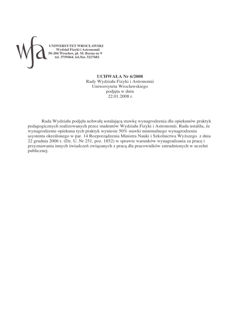 UNIWERSYTET WROCŁAWSKI Wydział Fizyki i Astronomii 50-204 Wrocław, pl. M. Borna nr 9 tel. 3759464, tel./fax 3217682 UCHWAŁA Nr 6/2008 Rady Wydziału Fizyki i Astronomii Uniwersytetu Wrocławskiego podj ta w dniu 22.01.2008 r. Rada Wydziału podj ła uchwał ustalaj c stawk wynagrodzenia dla opiekunów praktyk pedagogicznych realizowanych przez studentów Wydziału Fizyki i Astronomii. Rada ustaliła, e wynagrodzenie opiekuna tych praktyk wyniesie 50% stawki minimalnego wynagrodzenia asystenta okre lonego w par. 14 Rozporz dzenia Ministra Nauki i Szkolnictwa Wy szego z dnia 22 grudnia 2006 r. (Dz. U. Nr 251, poz. 1852) w sprawie warunków wynagradzania za prac i przyznawania innych wiadcze zwi zanych z prac dla pracowników zatrudnionych w uczelni publicznej.