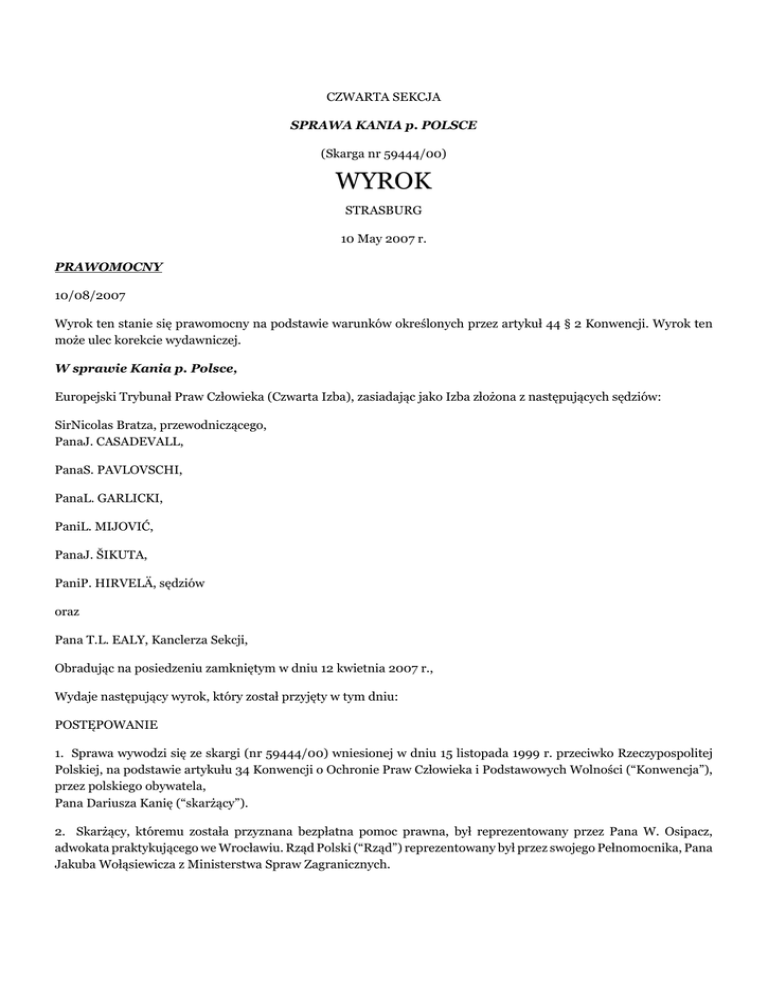 CZWARTA SEKCJA SPRAWA KANIA p. POLSCE (Skarga nr 59444/00) WYROK STRASBURG 10 May 2007 r. PRAWOMOCNY 10/08/2007 Wyrok ten stanie się prawomocny na podstawie warunków określonych przez artykuł 44 § 2 Konwencji. Wyrok ten może ulec korekcie wydawniczej. W sprawie Kania p. Polsce, Europejski Trybunał Praw Człowieka (Czwarta Izba), zasiadając jako Izba złożona z następujących sędziów: SirNicolas Bratza, przewodniczącego, PanaJ. CASADEVALL, PanaS. PAVLOVSCHI, PanaL. GARLICKI, PaniL. MIJOVIĆ, PanaJ. ŠIKUTA, PaniP. HIRVELÄ, sędziów oraz Pana T.L. EALY, Kanclerza Sekcji, Obradując na posiedzeniu zamkniętym w dniu 12 kwietnia 2007 r., Wydaje następujący wyrok, który został przyjęty w tym dniu: POSTĘPOWANIE 1. Sprawa wywodzi się ze skargi (nr 59444/00) wniesionej w dniu 15 listopada 1999 r. przeciwko Rzeczypospolitej Polskiej, na podstawie artykułu 34 Konwencji o Ochronie Praw Człowieka i Podstawowych Wolności (“Konwencja”), przez polskiego obywatela, Pana Dariusza Kanię (“skarżący”). 2. Skarżący, któremu została przyznana bezpłatna pomoc prawna, był reprezentowany przez Pana W. Osipacz, adwokata praktykującego we Wrocławiu. Rząd Polski (“Rząd”) reprezentowany był przez swojego Pełnomocnika, Pana Jakuba Wołąsiewicza z Ministerstwa Spraw Zagranicznych. 3. Skarżący twierdził, w szczególności, że z powodu zbyt wysokiej opłaty sądowej, do której uiszczenia został zobowiązany, naruszono jego prawo dostępu do sądu gwarantowanego na mocy artykułu 6 § 1 Konwencji. 4. Na podstawie decyzji z dnia 13 września 2005 Trybunał uznał skargę za częściowo niedopuszczalną oraz postanowił zakomunikować Rządowi skargę dotyczącą dostępu do sądu. Na podstawie artykułu 29 § 3 Konwencji, Trybunał postanowił zbadać meritum sprawy w tym samym czasie co jej dopuszczalność. FAKTY OKOLICZNOŚCI SPRAWY 5. Skarżący urodził się w 1962 r. i mieszka we Wrocławiu (Polska). A. Powództwo o zapłatę i dalsze postępowanie 6. W październiku 1970 r. skarżący, będący w owym czasie uczniem, uległ wypadkowi w szkole podstawowej, do której uczęszczał. Na skutek wypadku skarżący stracił wzrok w prawym oku. W 1983 r. sąd przyznał mu odszkodowanie oraz miesięczną rentę w wysokości 2.000 starych złotych. 7. W dniu 12 sierpnia 1994 r. skarżący wniósł do Sądu Wojewódzkiego we Wrocławiu powództwo domagając się zwiększenia wysokości renty. Skarżący argumentował, że wysokości renty pozostała niezmieniona od roku 1984. Po denominacji krajowej waluty, która miała miejsce 1 stycznia 1995 r., wysokość renty skarżącego wyniosła 0,2 złotych. Skarżący dochodził ponadto odszkodowania w wysokości 10.000.000 złotych w związku z dalszym pogorszeniem się stanu zdrowia. 8. Skarżący został następnie zwolniony od kosztów sądowych. Przyznano mu również bezpłatną pomoc prawną. 9. Sąd przeprowadził kilka rozpraw oraz wydał wyrok w dniu 17 grudnia 1998 r. Sąd Wojewódzki częściowo uwzględnił roszczenia powoda oraz przyznał mu miesięczną rentę w wysokości 1.220 złotych. Sąd nakazał stronie pozwanej wypłatę zaległych rent od daty wniesienia powództwa przez skarżącego. Zaległa renta wyniosła 43.000 złotych, a odsetki 100.000 złotych. Sąd oddalił żądania skarżącego w sprawie zadośćuczynienia jako przedawnione, jak również pozostałe jego roszczenia o odszkodowanie, w szczególności w odniesieniu do kosztów poniesionych w związku z kolejną operacją oka. 10. Skarżący odwołał się od tego wyroku do Sądu Apelacyjnego we Wrocławiu. 11. W dniu 18 maja 1999 r. sąd apelacyjny częściowo uznał apelację za uzasadnioną, uchylił wyrok w części oddalającej pozostałe roszczenia skarżącego oraz przekazał sprawę do ponownego rozpoznania. Sąd apelacyjny uznał, między innymi, że sąd pierwszej instancji naruszył prawo postanawiając z urzędu nie rozpatrzeć wniosku skarżącego w sprawie przyznania zadośćuczynienia stwierdzając, iż roszczenie było przedawnione, mimo że kwestia przedawnienia nie była podnoszona przez stronę pozwaną. 12. W dniu 21 grudnia 1999 r. Sąd Okręgowy we Wrocławiu, po ponownym rozpoznaniu sprawy, wydał wyrok. Sąd częściowo uznał roszczenia skarżącego i przyznał mu 8.000 złotych odszkodowania. W odniesieniu do roszczenia o zadośćuczynienie pozwany podniósł, że uległo ono przedawnieniu. W związku z powyższym, sąd oddalił tę część roszczeń skarżącego. 13. Skarżący odwołał się od wyroku sądu okręgowego argumentując, między innymi, że jego roszczenia nie uległy przedawnieniu, gdyż dotyczyły one dalszego pogorszenia się jego zdrowia. 14. W dniu 11 kwietnia 2000 r. Sąd Apelacyjny we Wrocławiu oddalił apelację. W sprawie roszczeń o zadośćuczynienie sąd ponownie uznał, że zarzut przedawnienia może zostać oddalony jedynie wówczas, gdy byłoby to sprzeczne z zasadami „współżycia społecznego” w myśl artykułu 5 kodeksu cywilnego. Zgodnie z praktyką sądowniczą taki wyjątek czyniono jedynie w szczególnych wypadkach, które nie zaistniały w niniejszej sprawie. Sąd oddalił również apelację w części dotyczącej zarzutów wobec wysokości odszkodowania przyznanego przez sąd okręgowy. Sąd ponadto wycofał zwolnienie skarżącego z opłat sądowych oraz nakazał zapłatę 5.000 złotych z tytułu opłat sądowych oraz 4.000 złotych za czynności adwokata z tytułu zastępstwa prawnego. Sąd uznał, że skarżący był w stanie ponieść owe koszty zważywszy na fakt, iż zasądzono na jego rzecz odszkodowanie w łącznej kwocie 140.000 złotych. B. Wniosek o zwolnienie z opłat sądowych przy wnoszeniu skargi kasacyjnej 15. W dniu 13 lipca 2000 r. skarżący wniósł skargę kasacyjną do Sądu Najwyższego. W skardze kasacyjnej skarżył się na oddalenie jego roszczeń o zadośćuczynienie oraz na wycofanie jego zwolnienia z opłat sądowych oraz bezpłatnej pomocy