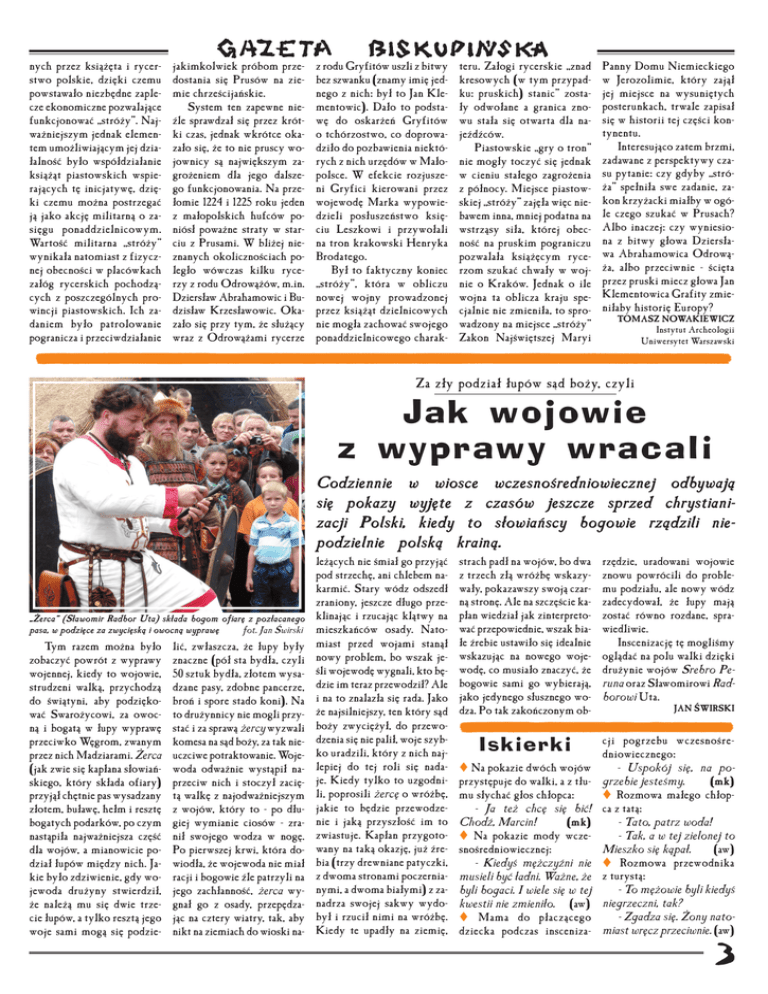 nych przez książęta i rycerstwo polskie, dzięki czemu powstawało niezbędne zaplecze ekonomiczne pozwalające funkcjonować „stróży”. Najważniejszym jednak elementem umożliwiającym jej działalność było współdziałanie książąt piastowskich wspierających tę inicjatywę, dzięki czemu można postrzegać ją jako akcję militarną o zasięgu ponaddzielnicowym. Wartość militarna „stróży” wynikała natomiast z fizycznej obecności w placówkach załóg rycerskich pochodzących z poszczególnych prowincji piastowskich. Ich zadaniem było patrolowanie pogranicza i przeciwdziałanie jakimkolwiek próbom przedostania się Prusów na ziemie chrześcijańskie. System ten zapewne nieźle sprawdzał się przez krótki czas, jednak wkrótce okazało się, że to nie pruscy wojownicy są największym zagrożeniem dla jego dalszego funkcjonowania. Na przełomie 1224 i 1225 roku jeden z małopolskich hufców poniósł poważne straty w starciu z Prusami. W bliżej nieznanych okolicznościach poległo wówczas kilku rycerzy z rodu Odrowążów, m.in. Dziersław Abrahamowic i Budzisław Krzesławowic. Okazało się przy tym, że służący wraz z Odrowążami rycerze z rodu Gryfitów uszli z bitwy bez szwanku (znamy imię jednego z nich: był to Jan Klementowic). Dało to podstawę do oskarżeń Gryfitów o tchórzostwo, co doprowadziło do pozbawienia niektórych z nich urzędów w Małopolsce. W efekcie rozjuszeni Gryfici kierowani przez wojewodę Marka wypowiedzieli posłuszeństwo księciu Leszkowi i przywołali na tron krakowski Henryka Brodatego. Był to faktyczny koniec „stróży”, która w obliczu nowej wojny prowadzonej przez książąt dzielnicowych nie mogła zachować swojego ponaddzielnicowego charak- teru. Załogi rycerskie „znad kresowych (w tym przypadku: pruskich) stanic” zostały odwołane a granica znowu stała się otwarta dla najeźdźców. Piastowskie „gry o tron” nie mogły toczyć się jednak w cieniu stałego zagrożenia z północy. Miejsce piastowskiej „stróży” zajęła więc niebawem inna, mniej podatna na wstrząsy siła, której obecność na pruskim pograniczu pozwalała książęcym rycerzom szukać chwały w wojnie o Kraków. Jednak o ile wojna ta oblicza kraju specjalnie nie zmieniła, to sprowadzony na miejsce „stróży” Zakon Najświętszej Maryi Panny Domu Niemieckiego w Jerozolimie, który zajął jej miejsce na wysuniętych posterunkach, trwale zapisał się w historii tej części kontynentu. Interesująco zatem brzmi, zadawane z perspektywy czasu pytanie: czy gdyby „stróża” spełniła swe zadanie, zakon krzyżacki miałby w ogóle czego szukać w Prusach? Albo inaczej: czy wyniesiona z bitwy głowa Dziersława Abrahamowica Odrowąża, albo przeciwnie - ścięta przez pruski miecz głowa Jan Klementowica Grafity zmieniłaby historię Europy? TOMASZ NOWAKIEWICZ Instytut Archeologii Uniwersytet Warszawski Za zły podział łupów sąd boży, czyli Jak wojowie z wyprawy wracali Codziennie w wiosce wczesnośredniowiecznej odbywają się pokazy wyjęte z czasów jeszcze sprzed chrystianizacji Polski, kiedy to słowiańscy bogowie rządzili niepodzielnie polską krainą. „Żerca” (Sławomir Radbor Uta) składa bogom ofiarę z pozłacanego pasa, w podzięce za zwycięską i owocną wyprawę fot. Jan Świrski Tym razem można było zobaczyć powrót z wyprawy wojennej, kiedy to wojowie, strudzeni walką, przychodzą do świątyni, aby podziękować Swarożycowi, za owocną i bogatą w łupy wyprawę przeciwko Węgrom, zwanym przez nich Madziarami. Żerca (jak zwie się kapłana słowiańskiego, który składa ofiary) przyjął chętnie pas wysadzany złotem, buławę, hełm i resztę bogatych podarków, po czym nastąpiła najważniejsza część dla wojów, a mianowicie podział łupów między nich. Jakie było zdziwienie, gdy wojewoda drużyny stwierdził, że należą mu się dwie trzecie łupów, a tylko resztą jego woje sami mogą się podzie- lić, zwłaszcza, że łupy były znaczne (pół sta bydła, czyli 50 sztuk bydła, złotem wysadzane pasy, zdobne pancerze, broń i spore stado koni). Na to drużynnicy nie mogli przystać i za sprawą żercy wyzwali komesa na sąd boży, za tak nieuczciwe potraktowanie. Wojewoda odważnie wystąpił naprzeciw nich i stoczył zaciętą walkę z najodważniejszym z wojów, który to - po długiej wymianie ciosów - zranił swojego wodza w nogę. Po pierwszej krwi, która dowiodła, że wojewoda nie miał racji i bogowie źle patrzyli na jego zachłanność, żerca wygnał go z osady, przepędzając na cztery wiatry, tak, aby nikt na ziemiach do wioski na- leżących nie śmiał go przyjąć pod strzechę, ani chlebem nakarmić. Stary wódz odszedł zraniony, jeszcze długo przeklinając i rzucając klątwy na mieszkańców osady. Natomiast przed wojami stanął nowy problem, bo wszak jeśli wojewodę wygnali, kto będzie im teraz przewodził? Ale i na to znalazła się rada. Jako że najsilniejszy, ten który sąd boży zwyciężył, do przewodzenia się nie palił, woje szybko uradzili, który z nich najlepiej do tej roli się nadaje. Kiedy tylko to uzgodnili, poprosili żercę o wróżbę, jakie to będzie przewodzenie i jaką przyszłość im to zwiastuje. Kapłan przygotowany na taką okazję, już źrebia (trzy drewniane patyczki, z dwoma stronami poczernianymi, a dwoma białymi) z zanadrza swojej sakwy wydobył i rzucił nimi na wróżbę. Kiedy te upadły na ziemię, strach padł na wojów, bo dwa z trzech złą wróżbę wskazywały, pokazawszy swoją czarną stronę. Ale na szczęście kapłan wiedział jak zinterpretować przepowiednie, wszak białe źrebie ustawiło się idealnie wskazując na nowego wojewodę, co musiało znaczyć, że bogowie sami go wybierają, jako jedynego słusznego wodza. Po tak zakończonym ob- rzędzie, uradowani wojowie znowu powrócili do problemu podziału, ale nowy wódz zadecydował, że łupy mają zostać równo rozdane, s