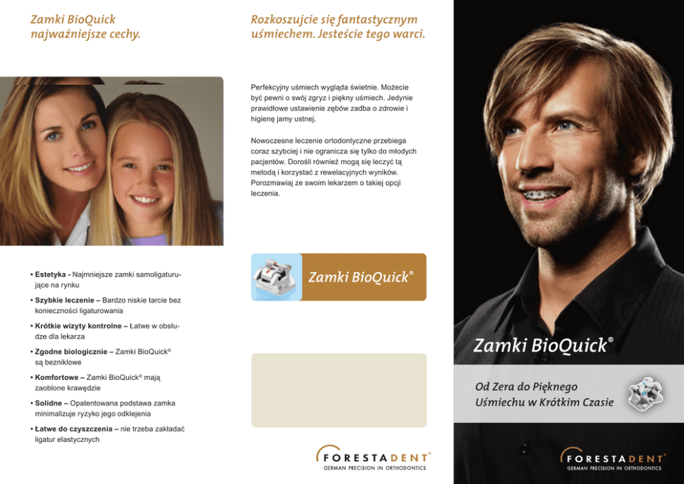 Zamki BioQuick najważniejsze cechy. Rozkoszujcie sie˛ fantastycznym uśmiechem. Jesteście tego warci. Perfekcyjny uśmiech wygląda świetnie. Możecie być pewni o swój zgryz i piękny uśmiech. Jedynie prawidłowe ustawienie zębów zadba o zdrowie i higienę jamy ustnej. Nowoczesne leczenie ortodontyczne przebiega coraz szybciej i nie ogranicza się tylko do młodych pacjentów. Dorośli również mogą się leczyć tą metodą i korzystać z rewelacyjnych wyników. Porozmawiaj ze swoim lekarzem o takiej opcji leczenia. •Estetyka - Najmniejsze zamki samoligaturujące na rynku Zamki BioQuick® •Szybkie leczenie – Bardzo niskie tarcie bez konieczności ligaturowania •Krótkie wizyty kontrolne – Łatwe w obsłudze dla lekarza •Zgodne biologicznie – Zamki BioQuick® są bezniklowe •Komfortowe – Zamki BioQuick® mają zaoblone krawędzie •Solidne – Opatentowana podstawa zamka minimalizuje ryzyko jego odklejenia •Łatwe do czyszczenia – nie trzeba zakładać ligatur elastycznych Zamki BioQuick® Od Zera do Pie˛knego Uśmiechu w Krótkim Czasie Małe jest Pie˛kne! Zamki BioQuick ® są najmniejszymi jednoelementowymi zamkami samoligaturującymi na rynku. Gwarancja doskonałej estetyki. Zamki BioQuick ® są wykończone tak precyzyjnie jak biżuteria. Co czyni je bardzo wygodne w noszeniu. Krótsze wizyty. Szybsze leczenie. Celem nowoczesnej ortodoncji jest szybsze i łatwiejsze leczenie. Z nowymi zamkami samoligaturującymi BioQuick ® firmy Forestadent, nie tylko leczenie przebiega szybciej, ale z powodu bardzo przyjaznej obsługi twoja wizyta będzie trwała krócej. Perfekcyjna Estetyka. We współczesnym leczeniu ortodontycznym nowoczesna technologia pomaga w przekazaniu delikatnych, fizjologicznie prawidłowych sił bezpośrednio na twoje zęby. Leczenie ortodontyczne może być przeprowadzone za pomocą aparatu klasycznego lub samoligaturującego. W przypadku aparatu samoligaturującego, drut umieszczony jest luźno w slocie zamka i w delikatny sposób ustawia zęby. Nowe zamki BioQuick ® są extremalnie małe i gładkie, co sprawia, że są bardziej przyjazne dla pacjenta. Ta nowa technologia wydłuża czas między wizytami, a skraca całe leczenie.
