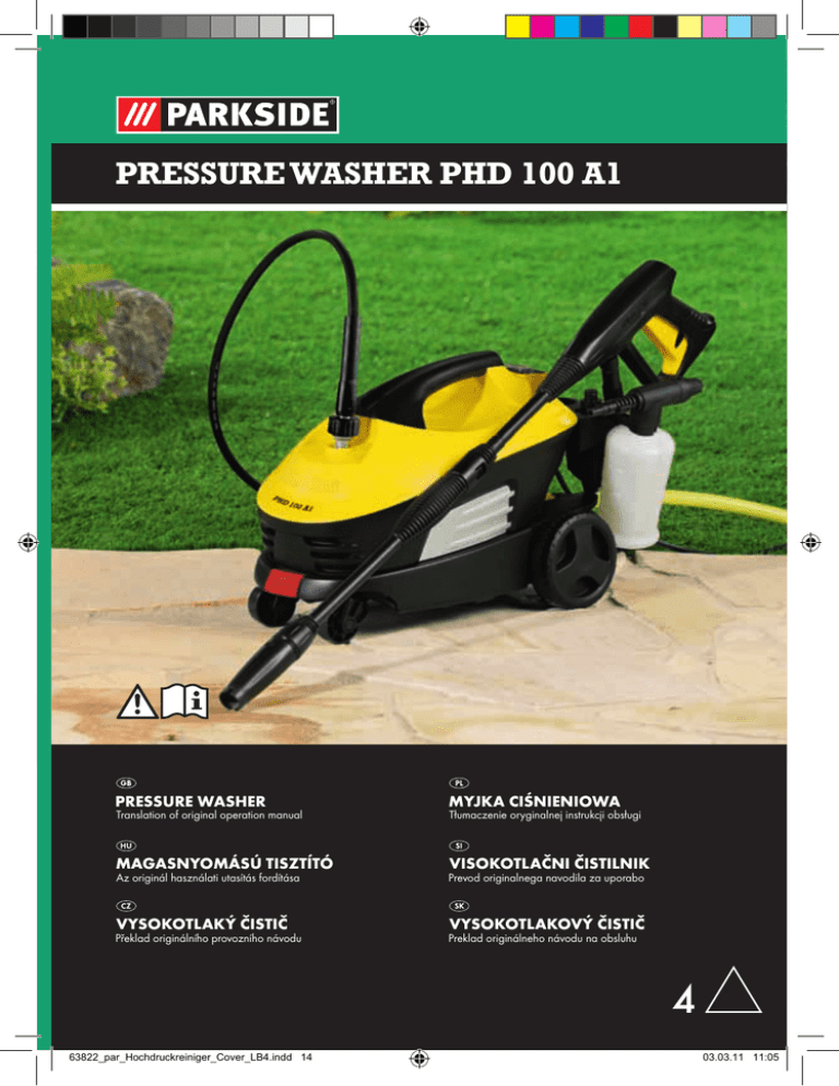 PRESSURE WASHER PHD 100 A1 PRESSURE WASHER Translation of original operation manual MAGASNYOMÁSÚ TISZTÍTÓ Az originál használati utasítás fordítása VYSOKOTLAKÝ ČISTIČ Překlad originálního provozního návodu MYJKA CIŚNIENIOWA Tłumaczenie oryginalnej instrukcji obsługi VISOKOTLAČNI ČISTILNIK Prevod originalnega navodila za uporabo VYSOKOTLAKOVÝ ČISTIČ Preklad originálneho návodu na obsluhu 4 63822_par_Hochdruckreiniger_Cover_LB4.indd 14 03.03.11 11:05 Before reading, unfold the page containing the illustrations and familiarise yourself with all functions of the device. Przed przeczytaniem proszę rozłożyć stronę z ilustracjami, a następnie proszę zapoznać się z wszystkimi funkcjami urządzenia. Olvasás előtt kattintson az ábrát tartalmazó oldalra és végezetül ismerje meg a készülék mindegyik funkcióját. Pred branjem odprite stran s slikami in se nato seznanite z vsemi funkcijami naprave. Před čtením si otevřete stranu s obrázky a potom se seznamte se všemi funkcemi přístroje. Pred čítaním si odklopte stranu s obrázkami a potom sa oboznámte so všetkými funkciami prístroja. GB PL HU SI CZ SK Translation of original operation manual Tłumaczenie oryginalnej instrukcji obsługi Az originál használati utasítás fordítása Prevod originalnega navodila za uporabo Překlad originálního provozního návodu Preklad originálneho návodu na obsluhu 63822_par_Hochdruckreiniger_Cover_LB4.indd 15 Page Strona Oldal Stran Strana Strana 5 15 25 35 47 57 03.03.11 11:05 A 1 2 3 4 5 6 7 8 15 14 9 13 11 10 12 B 11 1 2 13 12 10 3 10 14 C 13 12 10 11 D E 10 17 16 9 16 F G 8 18 9 GB Content Notes on Safety Notes on Safety .................................... 5 Explanation of symbols ..................... 5 Symbols in the manual ..................... 6 General notes on safety .................... 6 Areas of Application ............................. 8 General Description ............................. 8 Overview ........................................... 8 Functional description ....................... 8 Scope of Delivery .............................. 9 Start-up .................................................. 9 Setting up .......................................... 9 Mains connection .............................. 9 Operation ........................................ 10 Interrupting operation ...................... 10 Ending operation ............................. 10 Using detergents ............................. 10 This Section is concerned with the basic safety rules when working with the pressure washer. Explanation of symbols Attention! Before beginning work, familiarise yourself thoroughly with all the operating elements, particularly with how they function and operate. Ask a specialist if necessary. Attention: Remove the plug from the socket as soon as the power lead is damaged or cut. Fixing the Wheels.........................10 Removing the Chassis ....................11 Cleaning and Maintenance .................11 Cleaning ...........................................11 Maintenance ....................................11 Storage .................................................11 Waste Disposal and Environmental Protection ............................................ 12 Guarantee Notes ................................. 12 Technical data ..................................... 13 Trouble shooting ................................ 14 Spare Parts Order ............................... 14 EU declaration of conformity ............ 66 Exploded Drawing ............................. 68 Grizzly Service-Center ....................... 69 For your own safety, and for the safety of others, please read these Operating Instructions carefully before you use the pressure washer for the first time! Keep the manual in a safe place and pass it on to any subsequent owner to ensure that the information contained therein is available at all times. The pressure washer is not suitable for direct connection to the drinking water supply system. CAUTION. pressure washers can be dangerous if they are not operated correctly! The jet must never be directed at people, animals, electric equipment connected to the power supply or against the actual pressure washer. 95 Information of the acoustic power level LWA in dB. Electric appliances should not be disposed of in the domestic garbage. Safety class II 5 GB Symbols in the manual Warning symbols (the danger can be explained at the place of the exclamation mark) with information on damage and injury prevention. page 14 of the operating instructions for possible fault causes or contact our service centre. Working with the equipment Caution: to avoid accidents and injuries: Instruction symbols (the instruction can be explained at the place of the exclamation mark) with information on preventing damage. CAUTION. pressure washers can be dangerous if they are not operated correctly! The jet must never be directed at people, animals, electric equipment connected to the power supply or against the actual pressure washer. Help symbols with information on improving tool handling. General notes on safety • • • • • • 6 This appliance is not intended for use by persons (including children) with reduced physical, sensory or mental capabilities, or lack of experience and knowledge, unless they have been given supervision or instruction concerning use of the appliance by a person responsible for their safety. Children should be supervised to ensure that they do not play with the appliance. People who are unfamiliar with the operating instructions are not permitted to use the equipment. The operation of the equipment is not authorised for people under the age of 16. Use the equipment only on a flat, stable surface. For your safety, it is recommended that you wear safety glasses, safety boots and gloves and, if necessary, ear protection. In the event of a fault or defect during operation, immediately switch off and unplug the equip